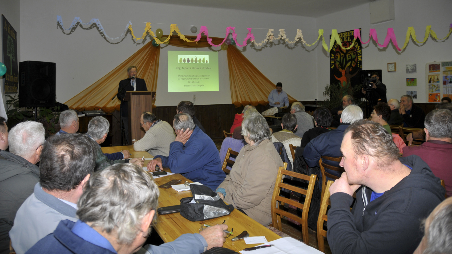 Szűcs Gergely előadásában a kézben oltható gyümölcsökről, a régi alma- és körtefajtákról esett szó. A kertész bevezetőjében egy gyümölcsfajták gyűjtésével foglalkozó erdészről, Kovács Gyuláról beszélt, aki jelenleg mintegy 1500 gyümölcsfajta birtokosa, és számos tündérkert alapítója és támogatója. Vetítéssel egybekötött beszámolójában az alma- és körtefajták csoportosításával és a különböző fajták jellemzőivel ismerkedhetett meg a hallgatóság.