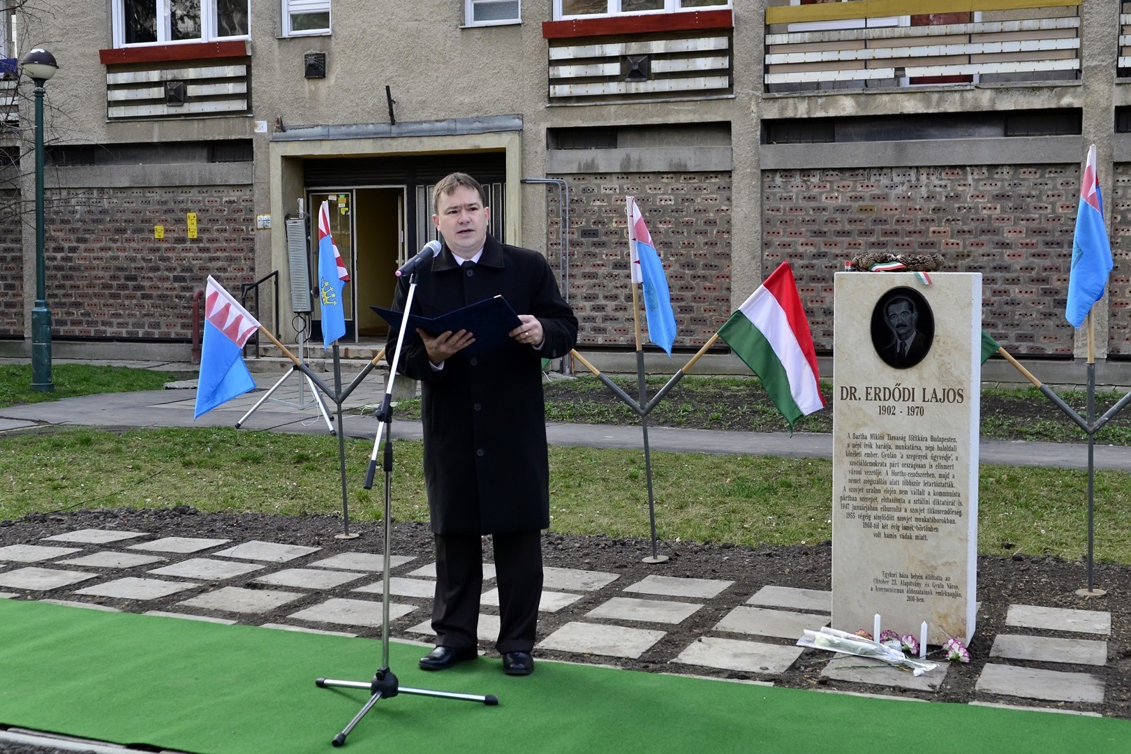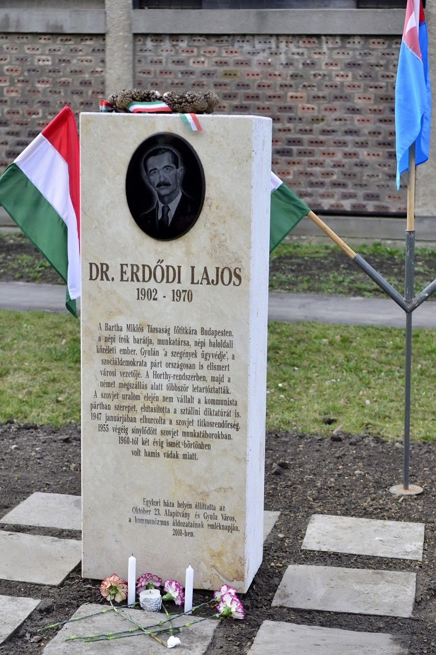 A kommunizmus áldozataira emlékeztünk ma Gyulán dr. Erdődi Lajosnak, a szegények ügyvédjének az emlékoszlopa előtt. Dr. Erdődi Lajos sorozatos koncepciós perek során védte az áldozatokat, a méltatlanul megvádoltakat akiket a kommunizmus szörnyű gépezete igyekezett minden eszközzel maga alá gyűrni. S éppen őt vádolták meg azzal az elvtársak, amely éppen őket jellemezte.
