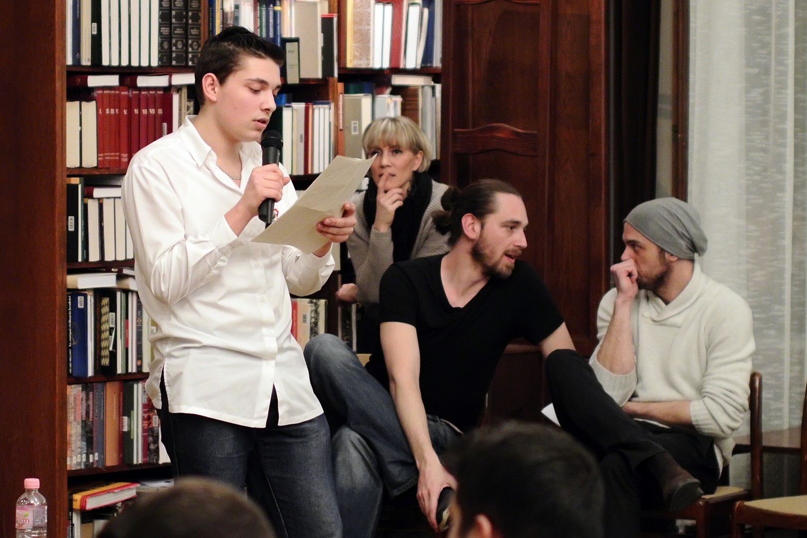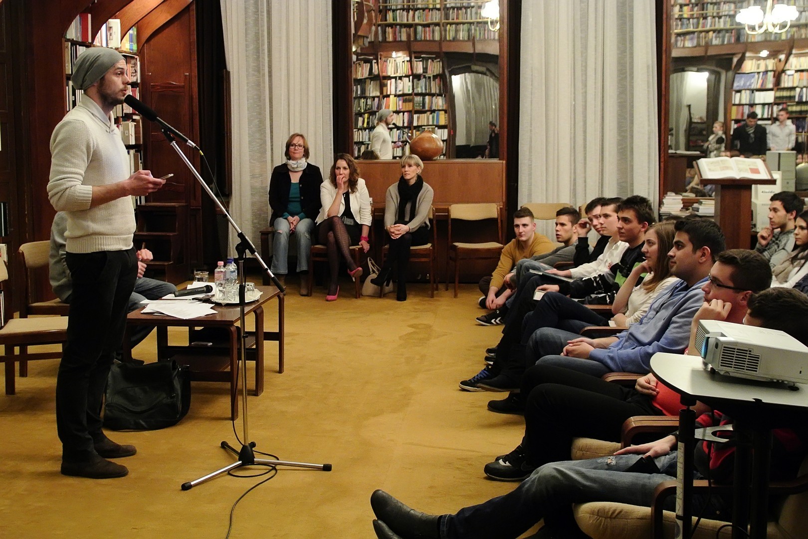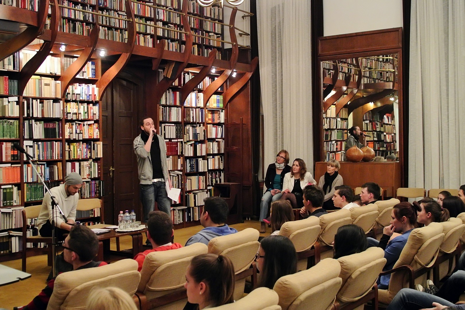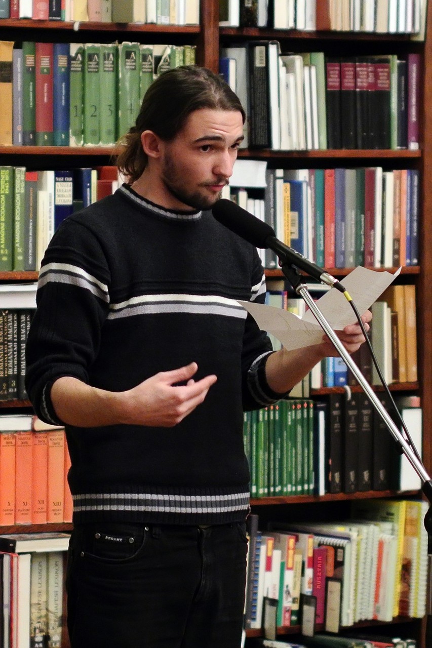 Talán fél év telt el azóta, hogy a bibliotéka Schriffert-Tóth Eszter könyvtáros ötlete nyomán – kedvcsinálóként – megszervezte az első gyulai slam(szerű)partit. Akkor Csider István Zoltán, Závada Péter, Hartay Csaba és Kiss László olvasta fel szövegeit, ezúttal pedig Pion István költő, újságíró és Simon Márton volt az este díszvendége. A Gyulai Kék Lámpa Egyesület és a könyvtár Ifjúsági Kultúra Kávéház elnevezésű programsorozatához kapcsolódó rendezvény egy rendhagyó kiállításmegnyitóval vette kezdetét. A Karácsonyi János Katolikus Gimnázium diákjai – Papp Zanett, Rokszin Anett és Kliszek Antal – által készített fotókat Simon Márton tavaly megjelent, Polaroidok című kötete ihlette. Számozott pillanatképek az életről – míg a fehér vásznon a fotók váltogatták egymást, a költő egy nyitóbeszédnek szánt szöveget olvasott fel. Nincs rossz megoldás – mondta elöljáróban, majd a textusban is ugyanoda, vagyis a viszonylagoshoz lyukadtunk ki: „ami nekem egy kavics, az másnak a kamaszkora vége”.