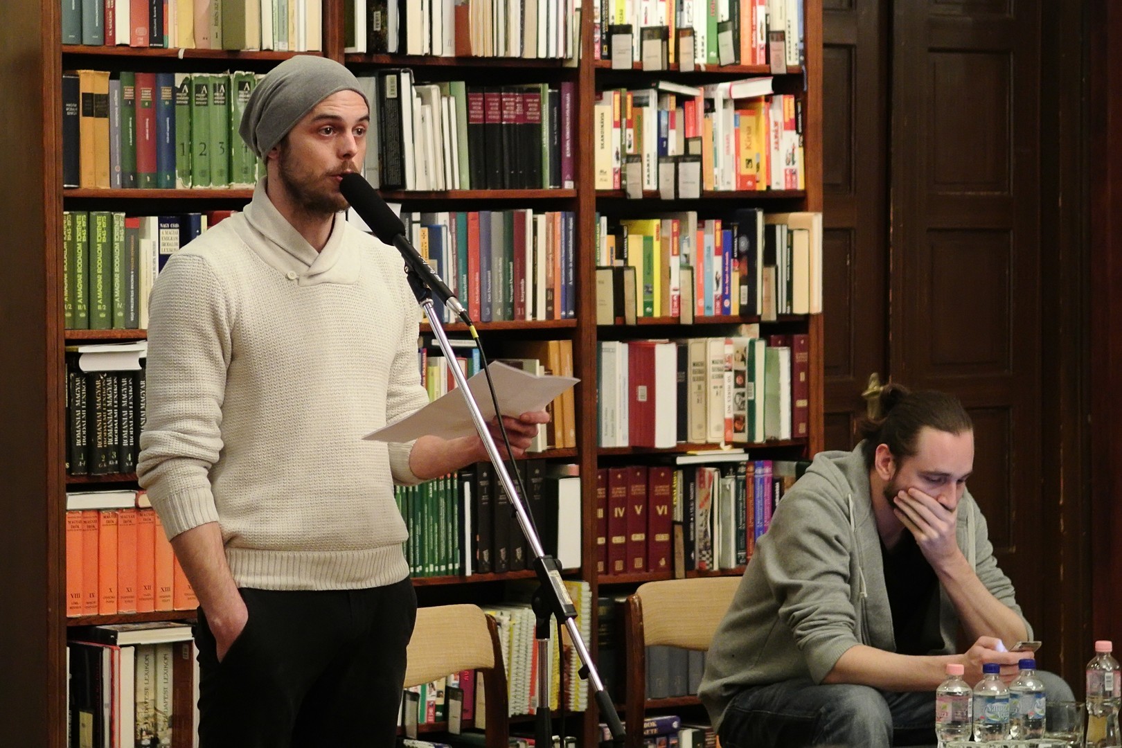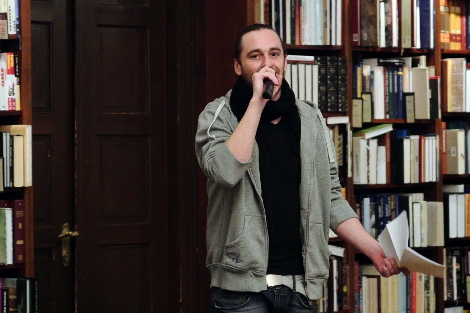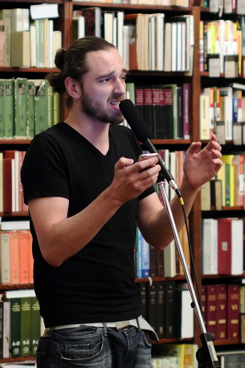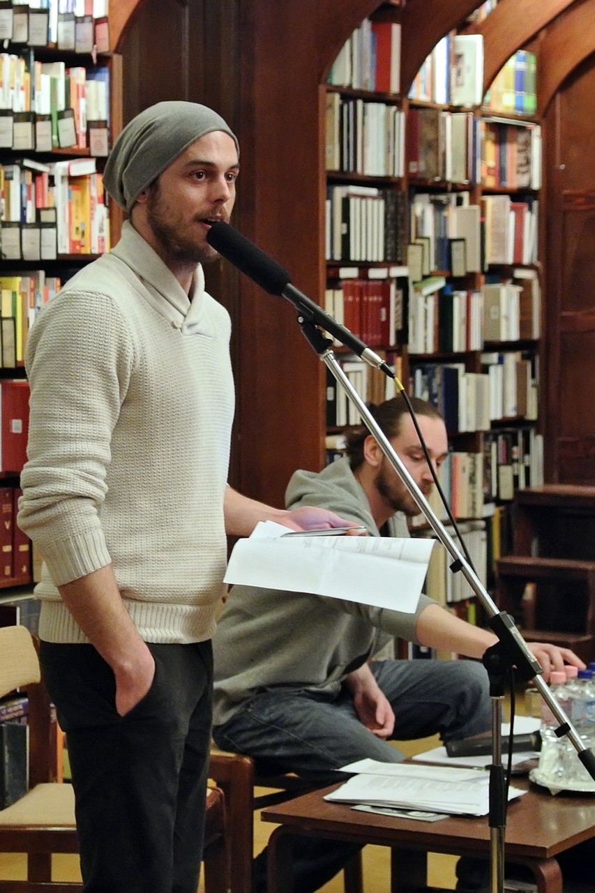 Az est első slamjét Pion István olvasta fel. A költő az első Országos Slam Poetry Bajnokság harmadik helyezettje, bemutatkozó kötete, az Atlasz bírja tavaly jelent meg. A könyv kuriózuma, hogy ez az első olyan hazai verseskötet, amelyben slamszövegek is olvashatók. Pion Istvántól bevezetőként a napokban született A légtornászlány című vers hangzott el, majd Miley Cyrus és interaktív, rózsaszínű Móni pónik repültek felénk a végtelen szöveguniverzumban. Az új generáció értékvesztett közegét tematizáló, ironikus könyörgés értő fülekre talált, és osztatlan sikert aratott a hallgatóság körében. Versek és slamek váltották egymást, a humor és a társadalomkritika az esten és a Pion-szövegekben is jól megfért egymás mellett.