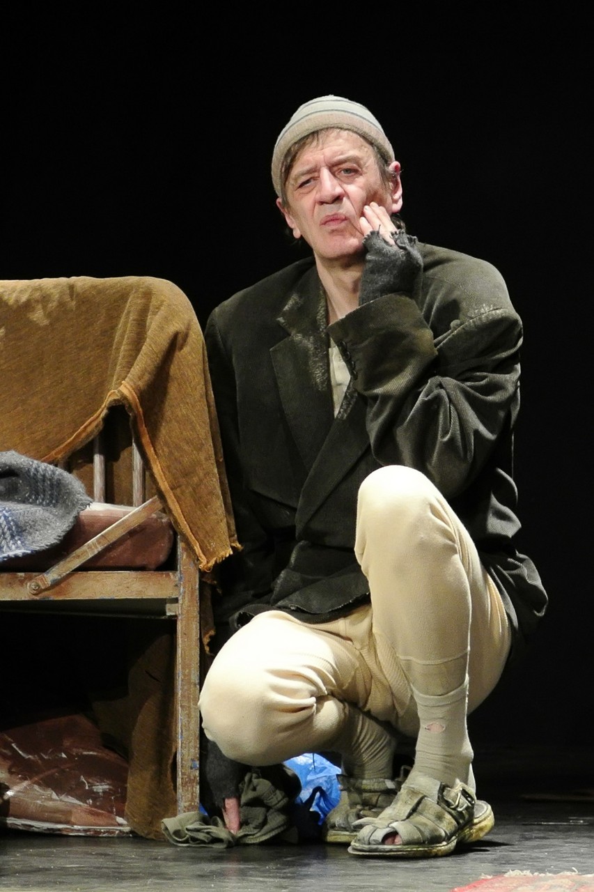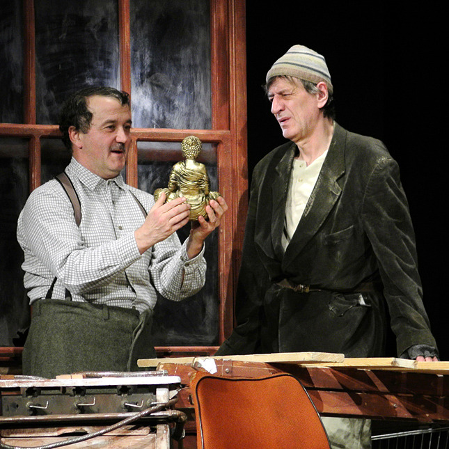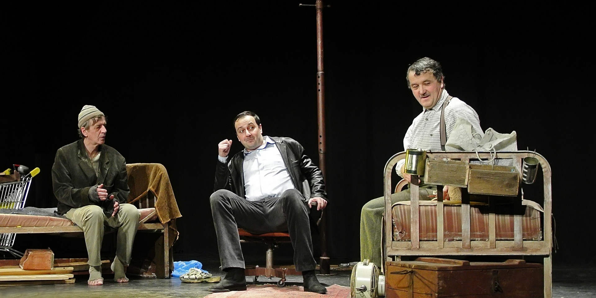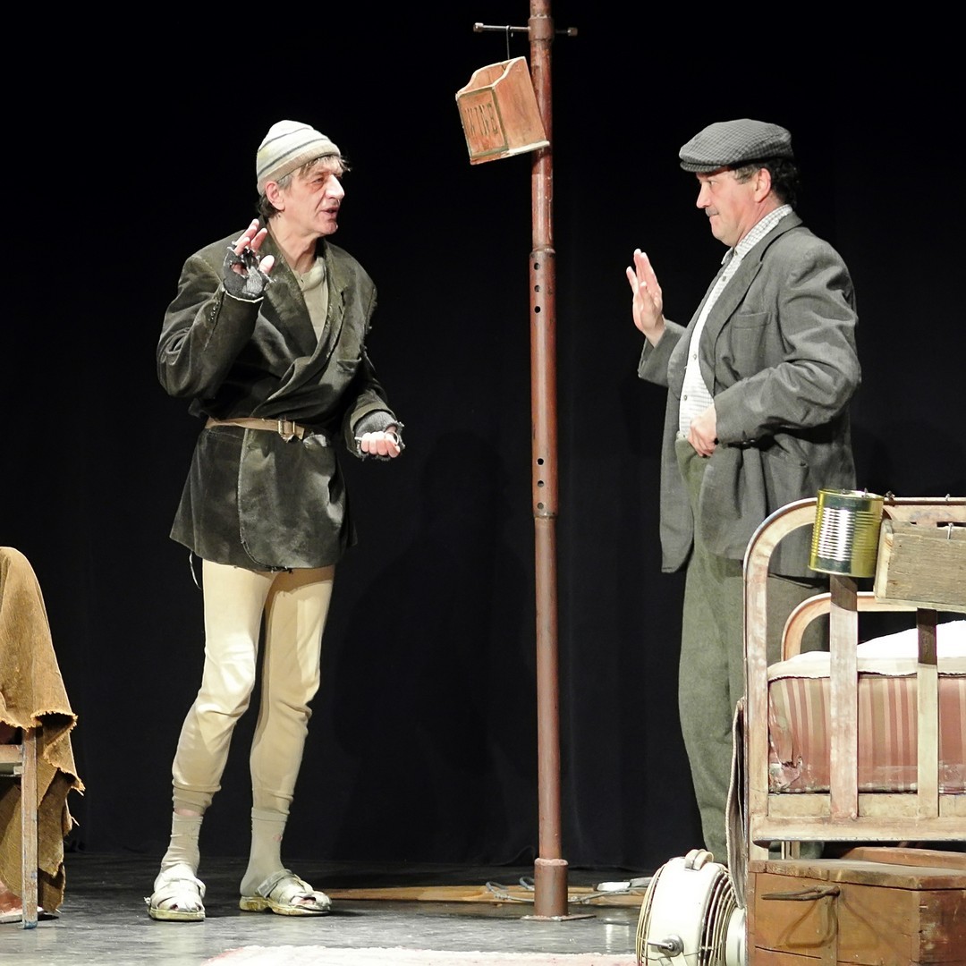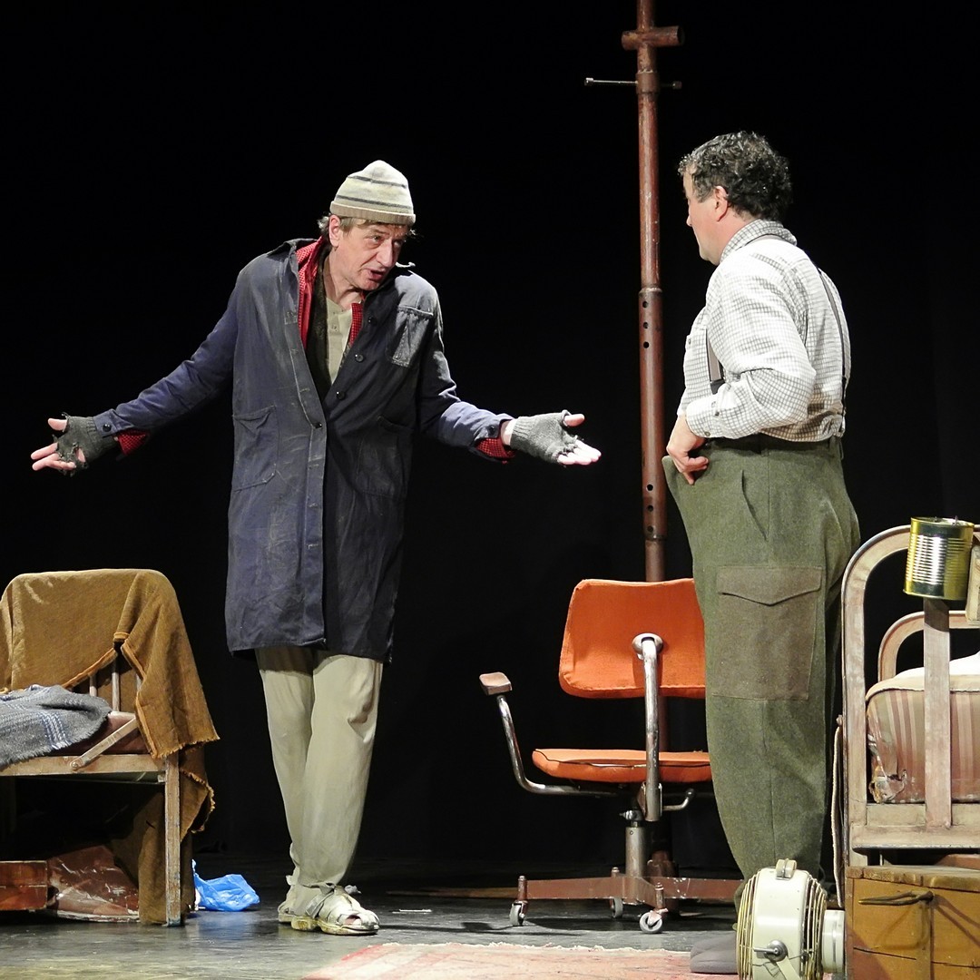 A Nézőművészeti Kft és a Szkéné Színház közös produkciójában sosem tudjuk, kivel hányadán állunk. Tudjuk, ki kitől miben függ, de hármuk szociális hierarchiájának látszata folyton változik, és az sem egyértelmű, hogy melyik karakter az őrült(ebb). Ezentúl hármójuk életszelete stagnál – nem teszik meg, ami változtathatna amortizáló, megrekedt életükön – tehetetlenségük pedig előrevetíti változatlanságba való belehalásukat.