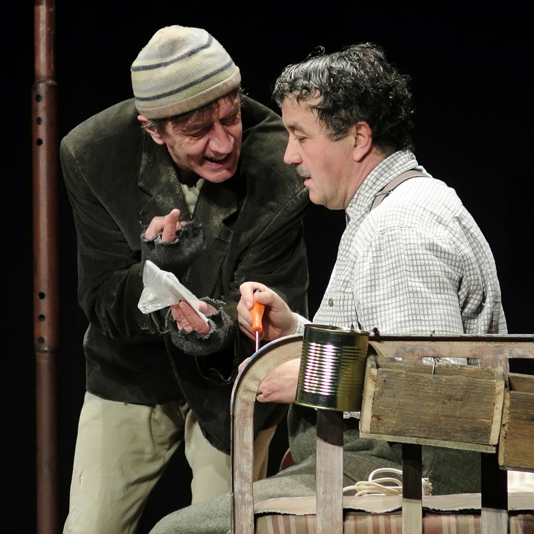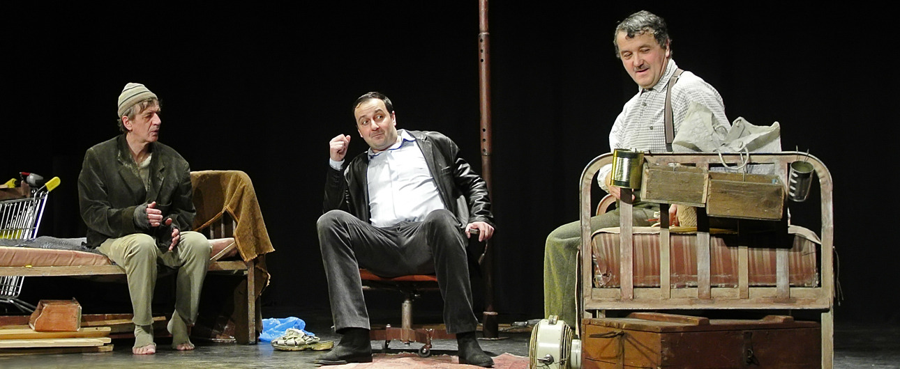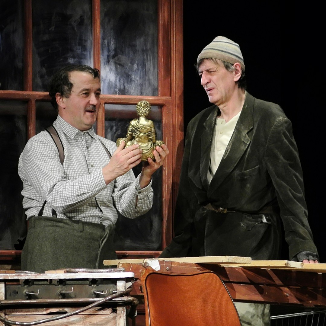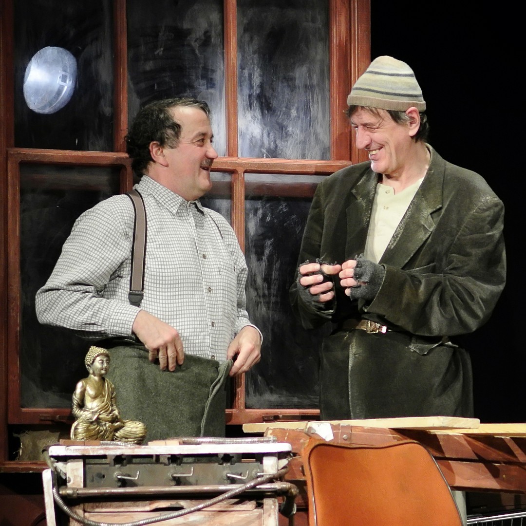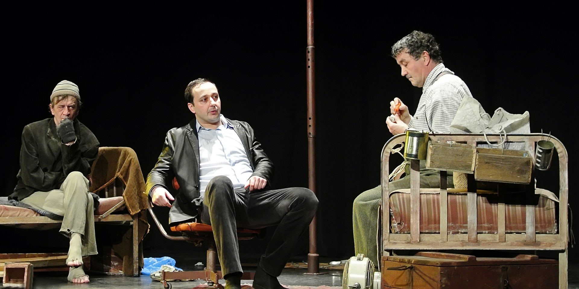 A Nézőművészeti Kft és a Szkéné Színház közös produkciójában sosem tudjuk, kivel hányadán állunk. Tudjuk, ki kitől miben függ, de hármuk szociális hierarchiájának látszata folyton változik, és az sem egyértelmű, hogy melyik karakter az őrült(ebb). Ezentúl hármójuk életszelete stagnál – nem teszik meg, ami változtathatna amortizáló, megrekedt életükön – tehetetlenségük pedig előrevetíti változatlanságba való belehalásukat.