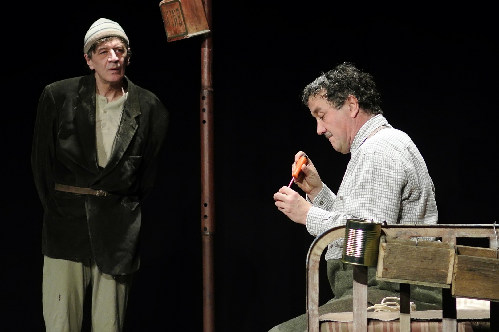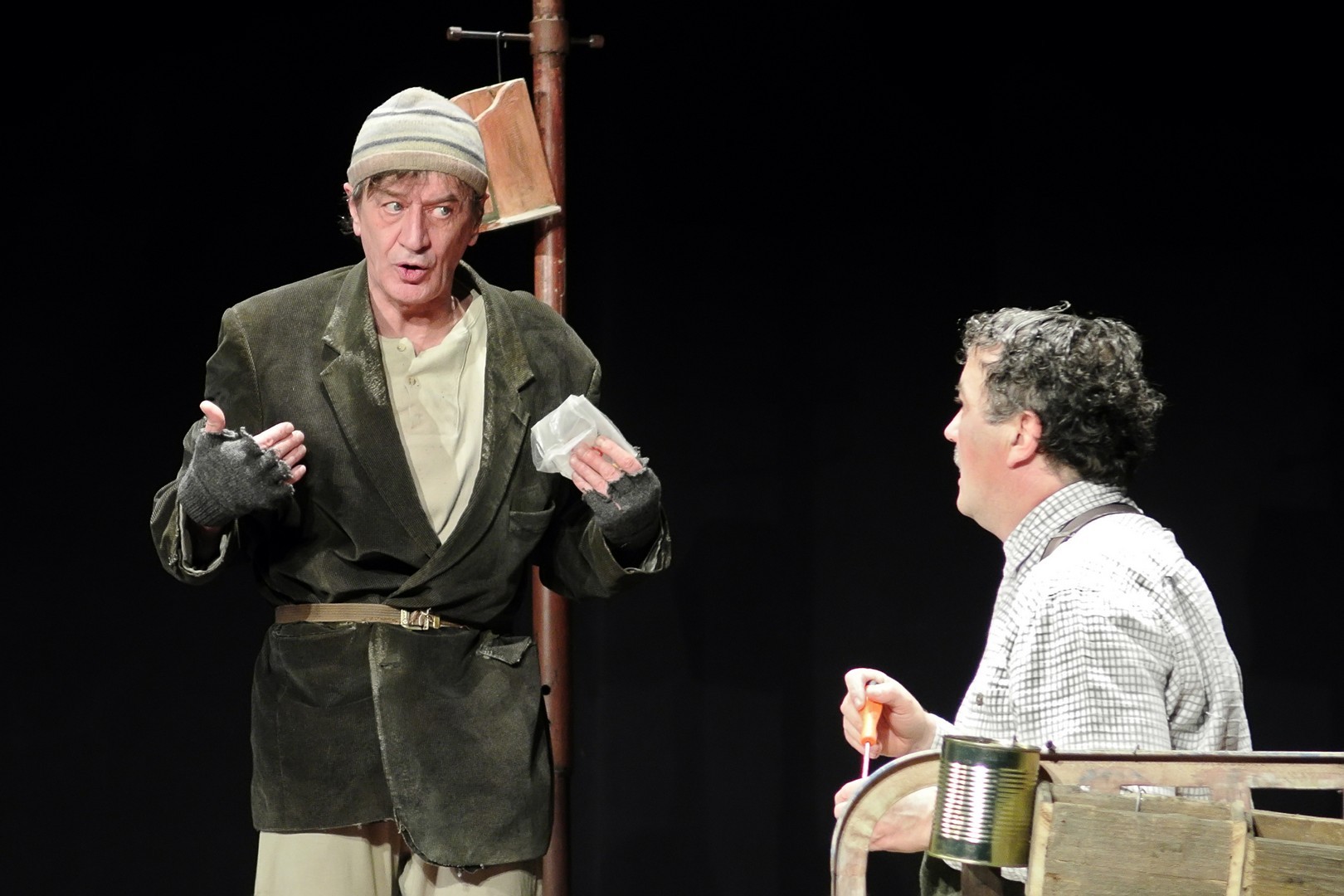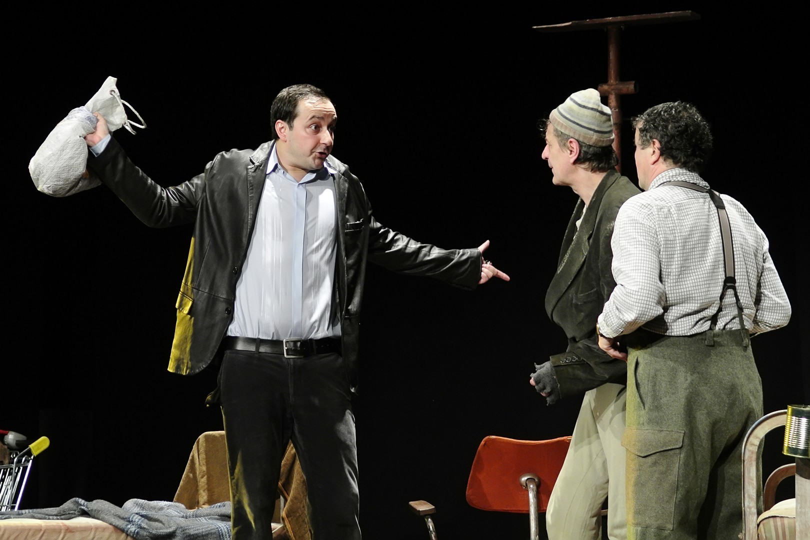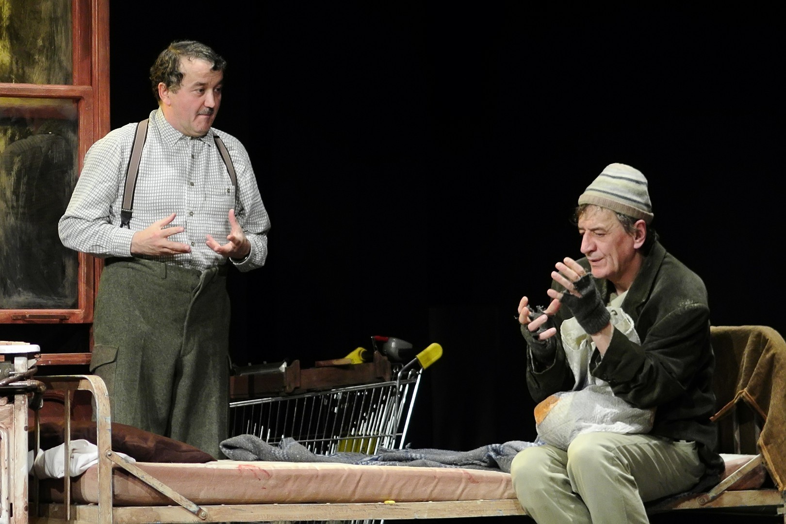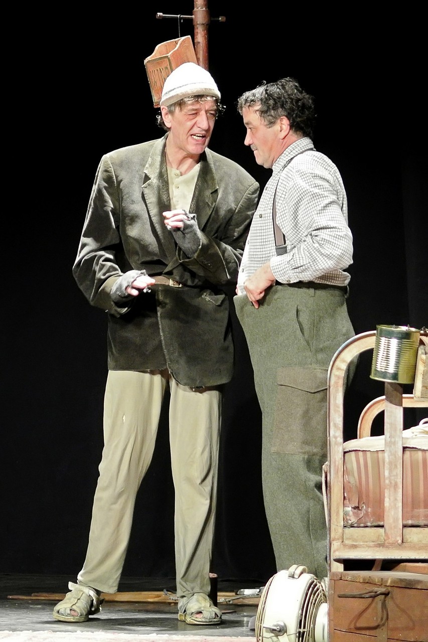 A Nézőművészeti Kft és a Szkéné Színház közös produkciójában sosem tudjuk, kivel hányadán állunk. Tudjuk, ki kitől miben függ, de hármuk szociális hierarchiájának látszata folyton változik, és az sem egyértelmű, hogy melyik karakter az őrült(ebb). Ezentúl hármójuk életszelete stagnál – nem teszik meg, ami változtathatna amortizáló, megrekedt életükön – tehetetlenségük pedig előrevetíti változatlanságba való belehalásukat.