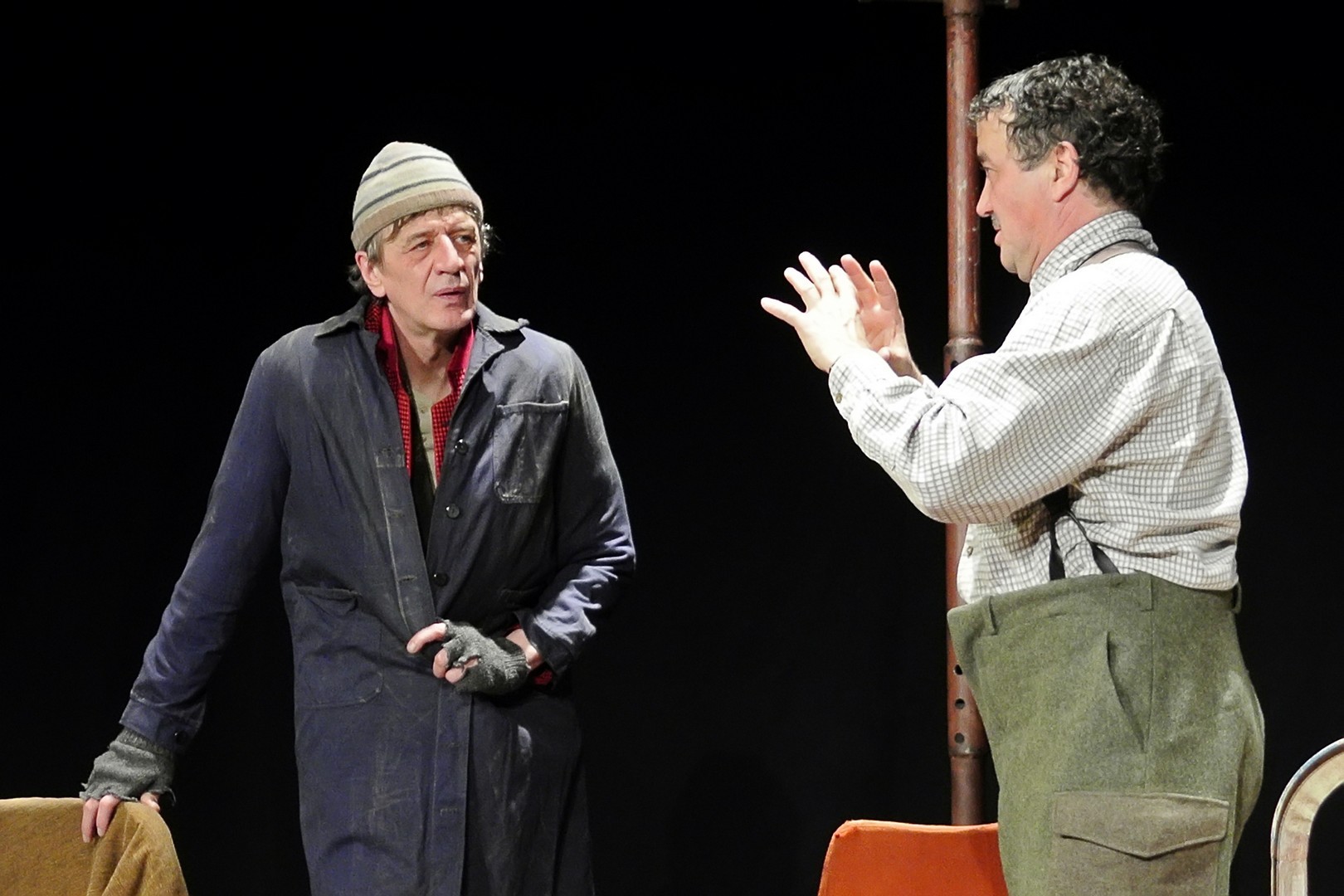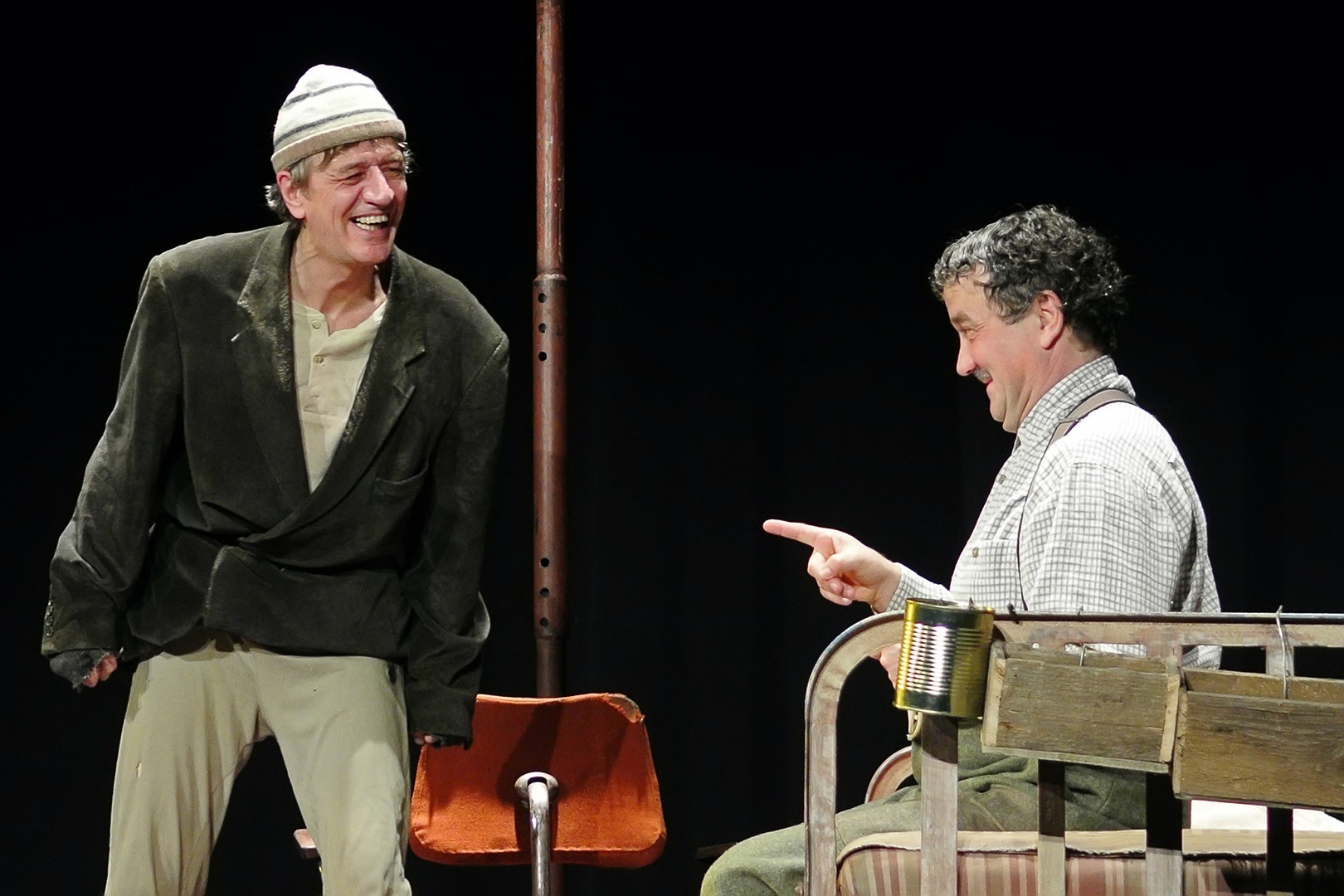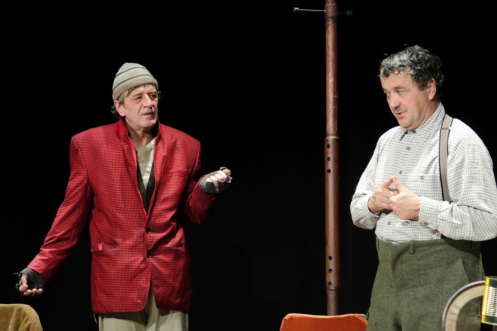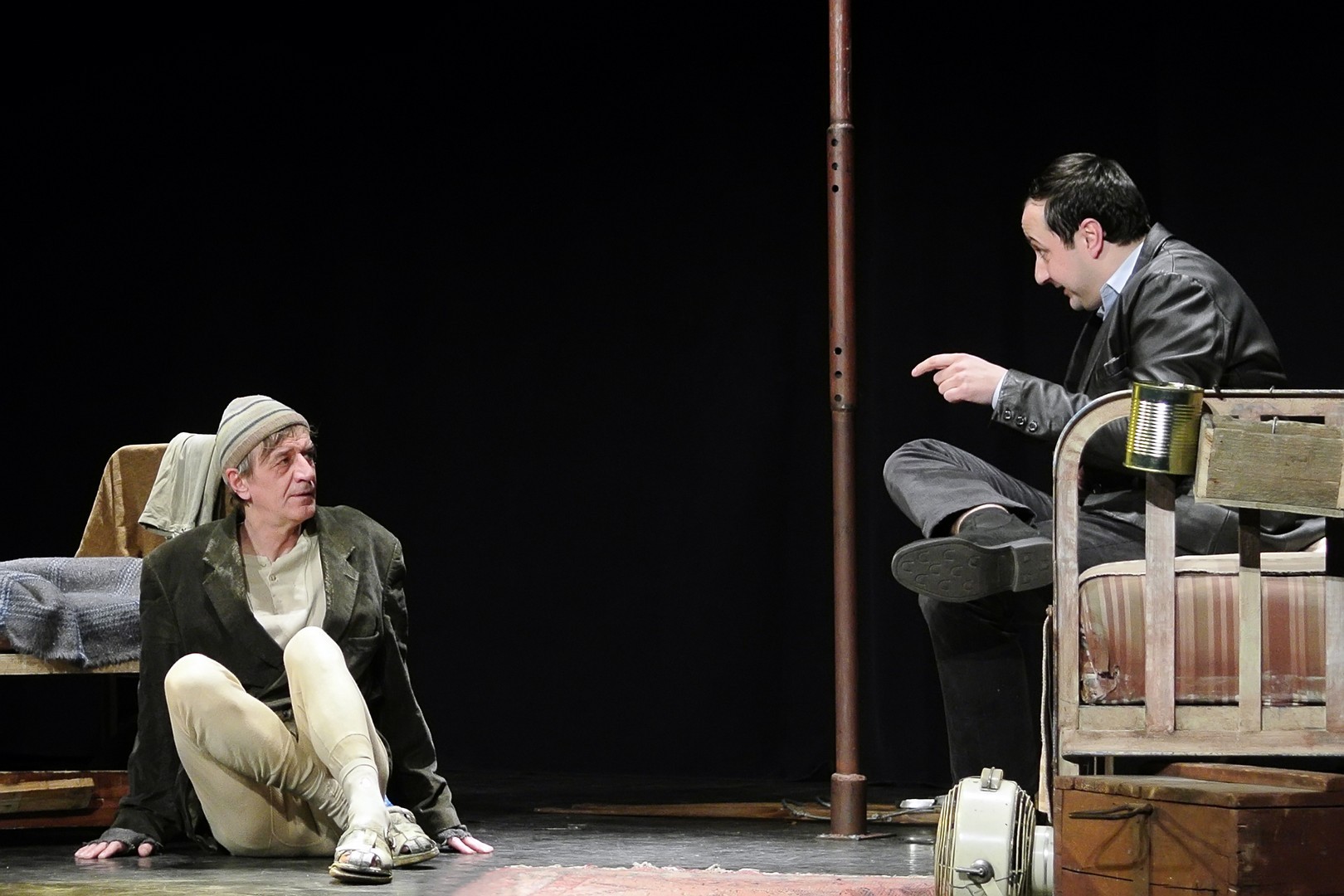 A Nézőművészeti Kft és a Szkéné Színház közös produkciójában sosem tudjuk, kivel hányadán állunk. Tudjuk, ki kitől miben függ, de hármuk szociális hierarchiájának látszata folyton változik, és az sem egyértelmű, hogy melyik karakter az őrült(ebb). Ezentúl hármójuk életszelete stagnál – nem teszik meg, ami változtathatna amortizáló, megrekedt életükön – tehetetlenségük pedig előrevetíti változatlanságba való belehalásukat.