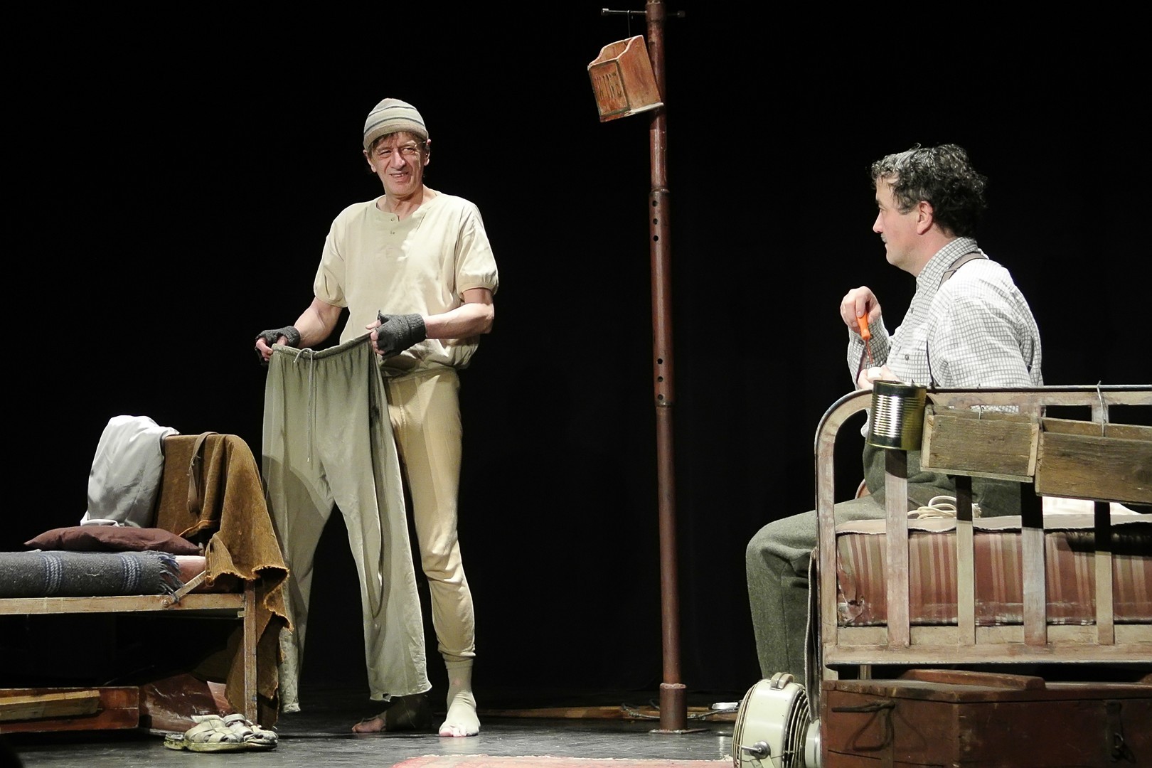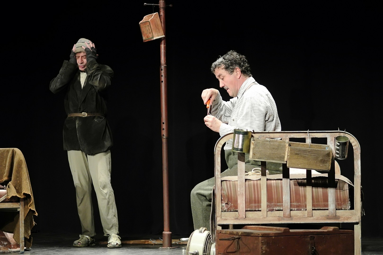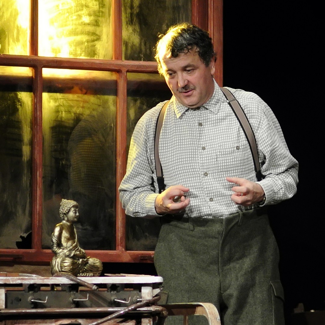 A helyét elfoglaló nézősereg Khell Csörsz átgondolt díszletére figyelhetett fel. A színpad szimmetriáját ablak és ajtó, valamint két vaságy és egy középen elhelyezett fogas hozta, a szobabelső puritánságát csupán néhány tényező tette érdekessé: a kimustrált gázsparhelten lévő Buddha-szobor, a plafonról lógó, vízcseppeket gyűjtő vödör, vagy az ágyra halmozott faalkalmatosságok tömege.