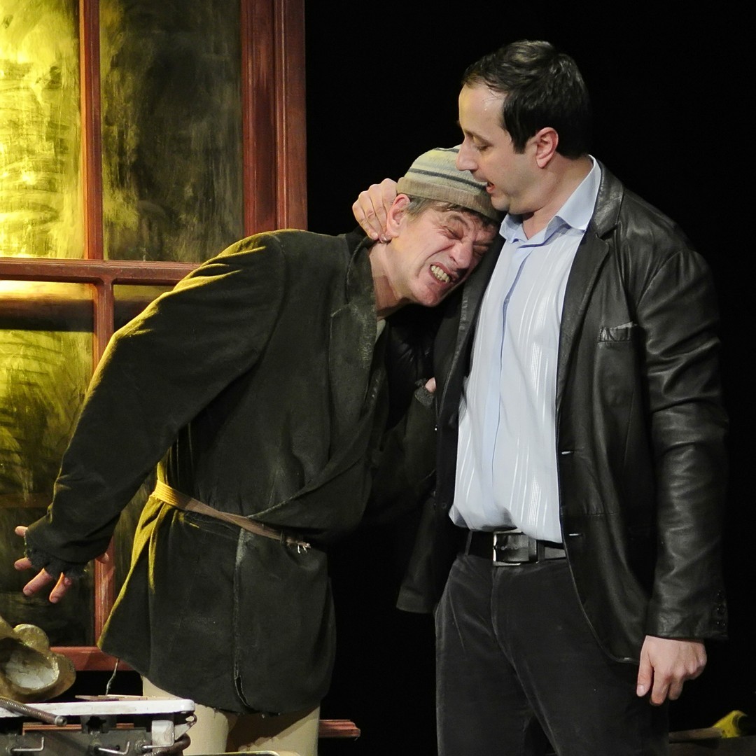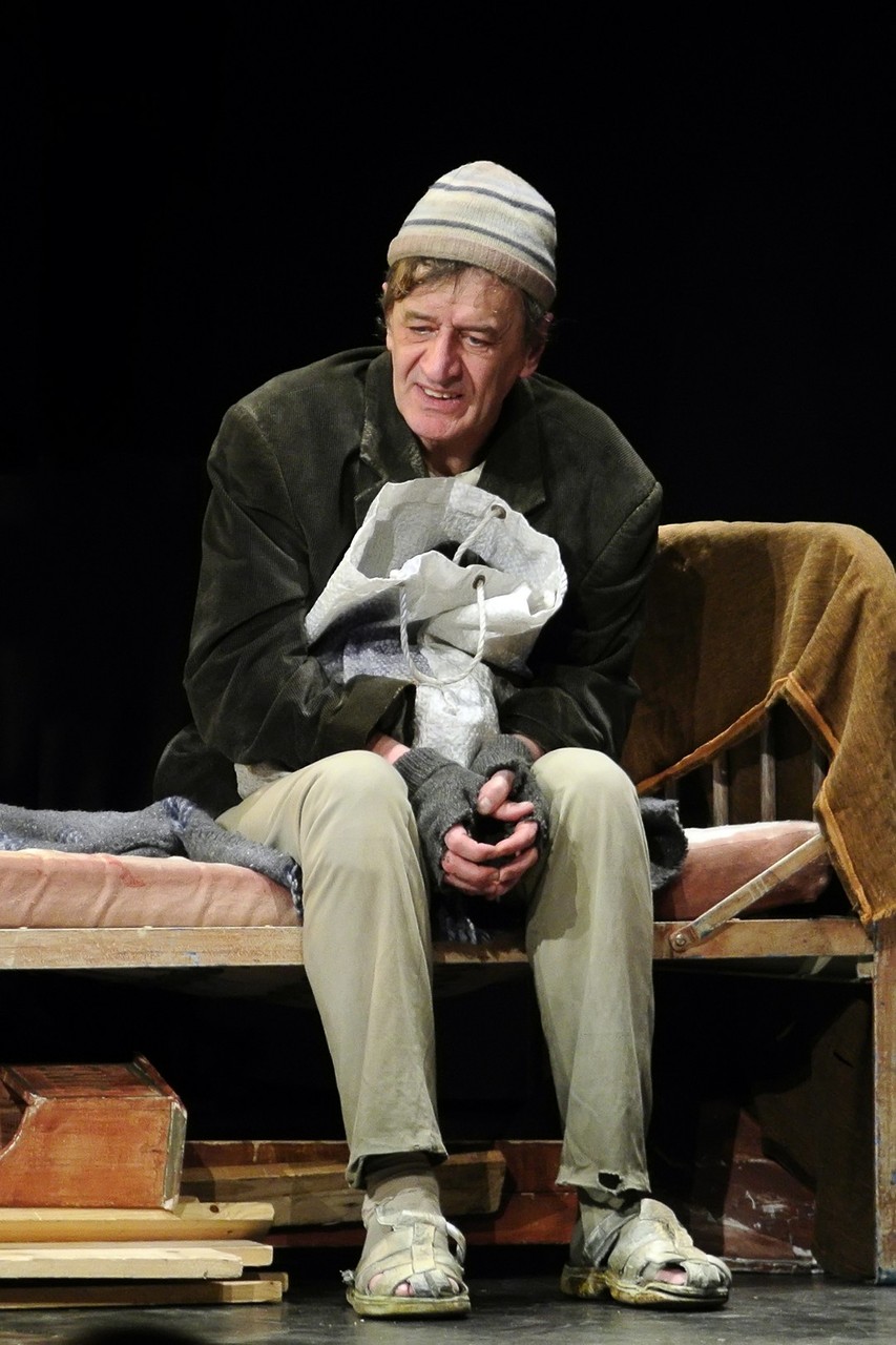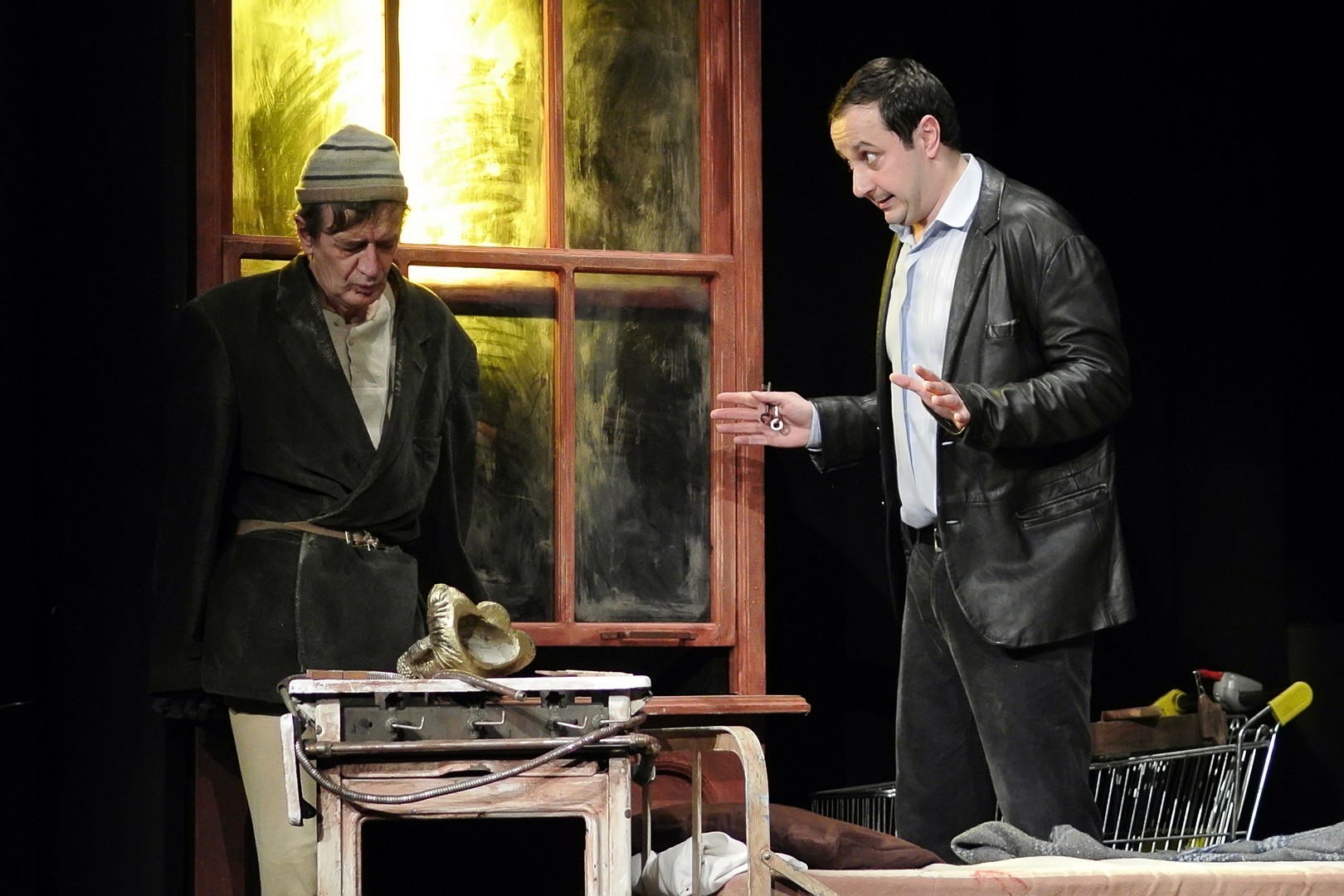 Mindhárom karakter jelleme kettős. Mucsi Zoltánt „neki való” szerepben láthatjuk: szánalmas csavargó, aki a túlélésért igencsak jól manipulál, idomul és hárít – mondhatnánk, ha az emberi büszkeség szikráját imitálva, folyton előtörő agresszív hőzöngéssel, idegbeteg hisztériával nem próbálna lépten-nyomon basáskodni embertársain. Katona László a ház tulajdonosát játssza, aki alapjaiban a jó üzletember jellemvonásait hordozza: többnyire könnyed, korrekt, ambiciózus, okos… egészen addig, míg egyik pillanatról a másikra nem tör ki rajta egy-egy instabil, ijesztő skizofrén állapot. Legnehezebb szerep azonban Scherer Péternek jut. Astonja a történet nyugalmi pontja, aki mindvégig jószívű, és egyetlen egyszer sem jön ki a sodrából. Ám görcsös időhúzása, gátlásos tartása, autista gesztikulációi és reakciói éreztetik személyisége árnyait, főleg amikor kiderül róla, korábban megjárta az elmegyógyintézetet. Ezt elmesélő szívszorító monológja a drámai csúcspont a mű aranymetszésében.