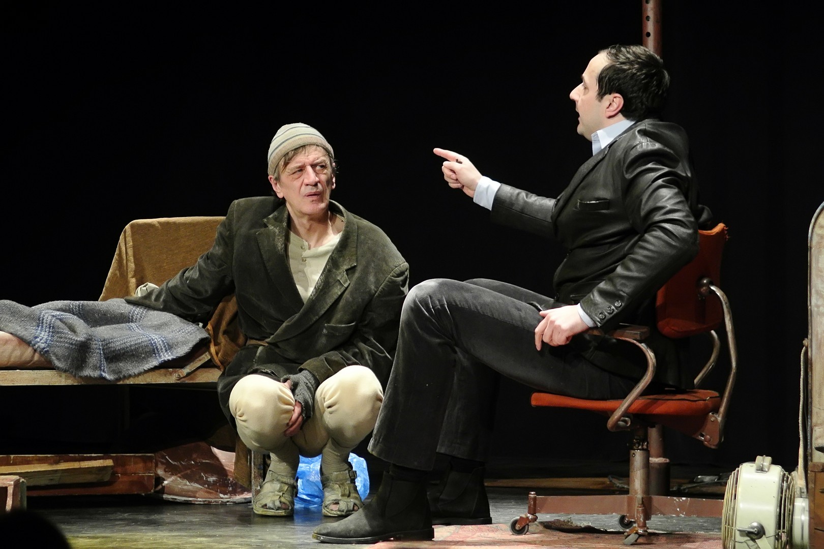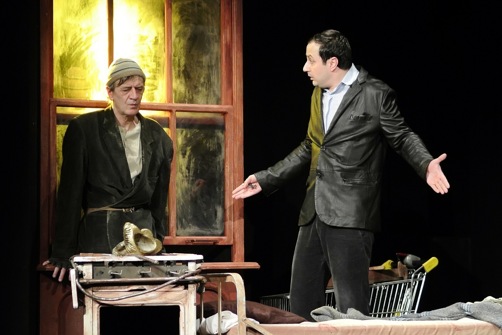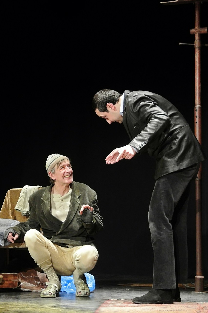 Mindhárom karakter jelleme kettős. Mucsi Zoltánt „neki való” szerepben láthatjuk: szánalmas csavargó, aki a túlélésért igencsak jól manipulál, idomul és hárít – mondhatnánk, ha az emberi büszkeség szikráját imitálva, folyton előtörő agresszív hőzöngéssel, idegbeteg hisztériával nem próbálna lépten-nyomon basáskodni embertársain. Katona László a ház tulajdonosát játssza, aki alapjaiban a jó üzletember jellemvonásait hordozza: többnyire könnyed, korrekt, ambiciózus, okos… egészen addig, míg egyik pillanatról a másikra nem tör ki rajta egy-egy instabil, ijesztő skizofrén állapot. Legnehezebb szerep azonban Scherer Péternek jut. Astonja a történet nyugalmi pontja, aki mindvégig jószívű, és egyetlen egyszer sem jön ki a sodrából. Ám görcsös időhúzása, gátlásos tartása, autista gesztikulációi és reakciói éreztetik személyisége árnyait, főleg amikor kiderül róla, korábban megjárta az elmegyógyintézetet. Ezt elmesélő szívszorító monológja a drámai csúcspont a mű aranymetszésében.