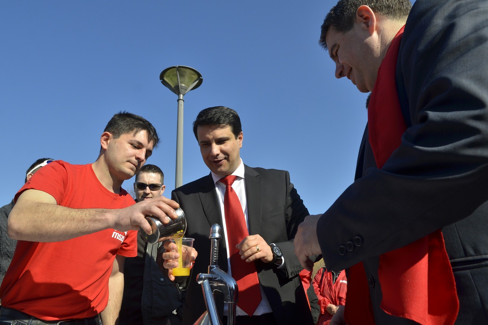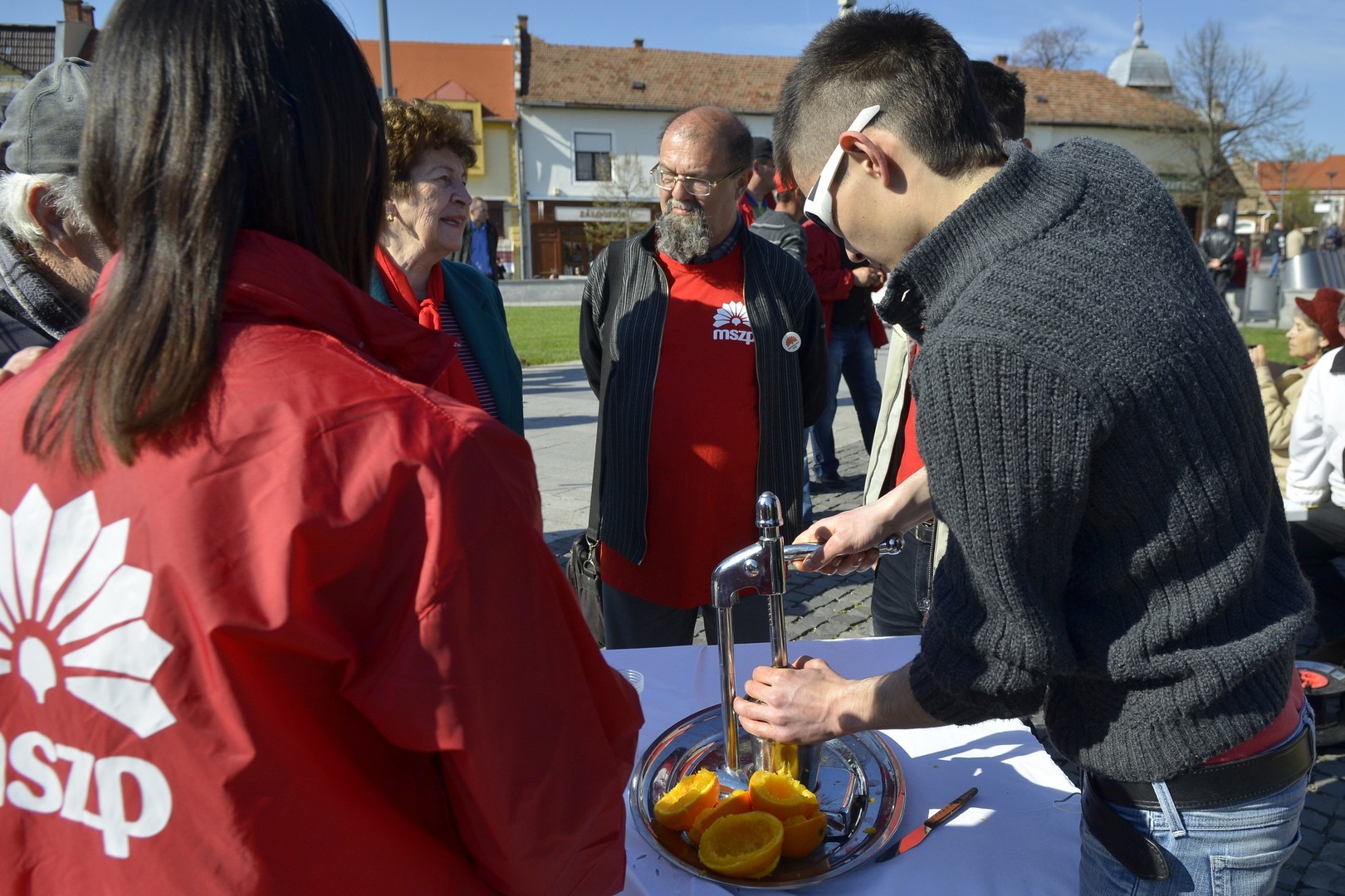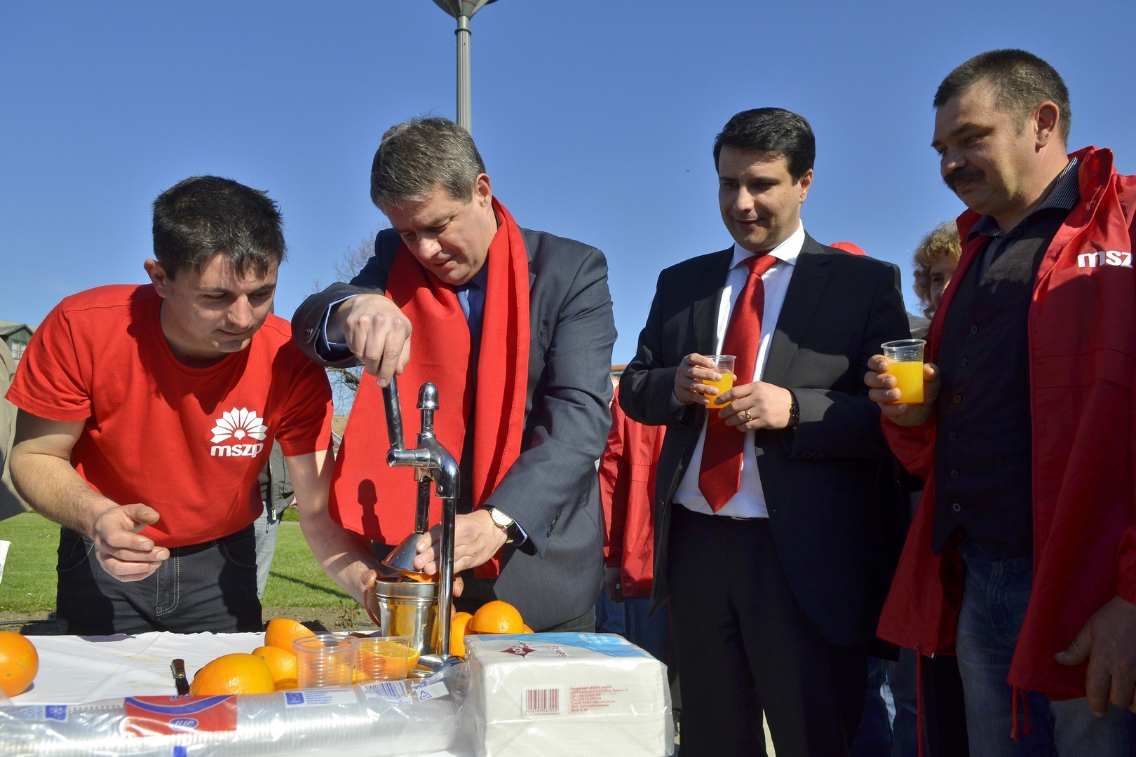 Narancsot facsart és a kinyert nedűvel koccintott Mesterházy Attila, a Kormányváltó Összefogás miniszterelnök-jelöltje és Bod Tamás, a 3. számú választókerület országgyűlési képviselő-jelöltje ma délután a Kossuth téren. A politikusokat mintegy százfős szimpatizáns várta Gyula belvárosában azért, hogy támogatásáról biztosítsák az Összefogást és tájékozódjanak egy esetleges kormányváltás utáni célkitűzéseikről.
