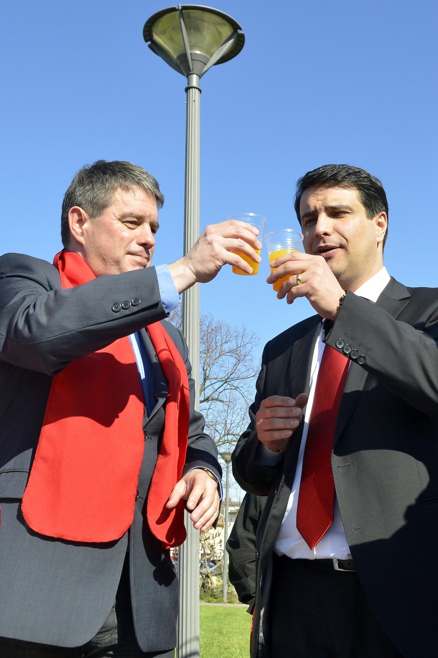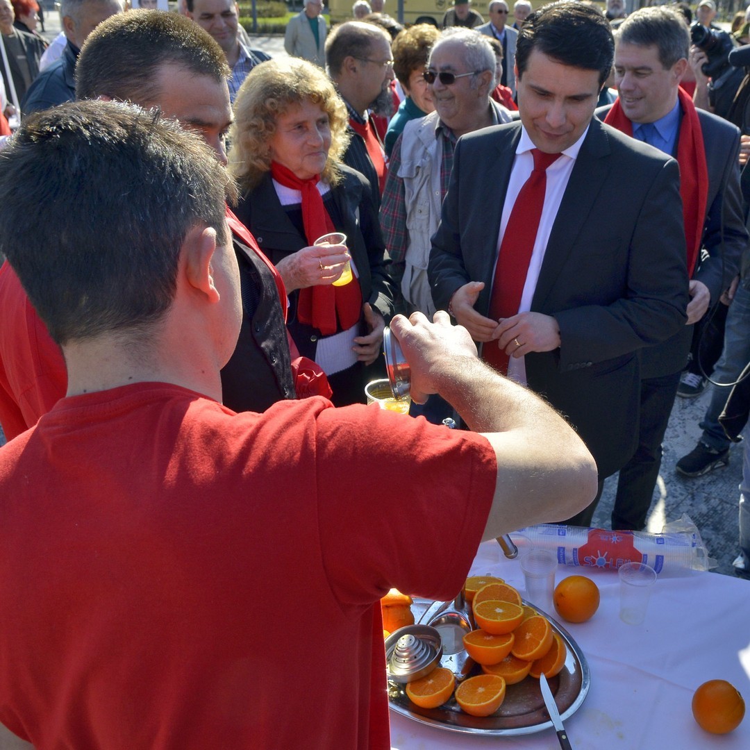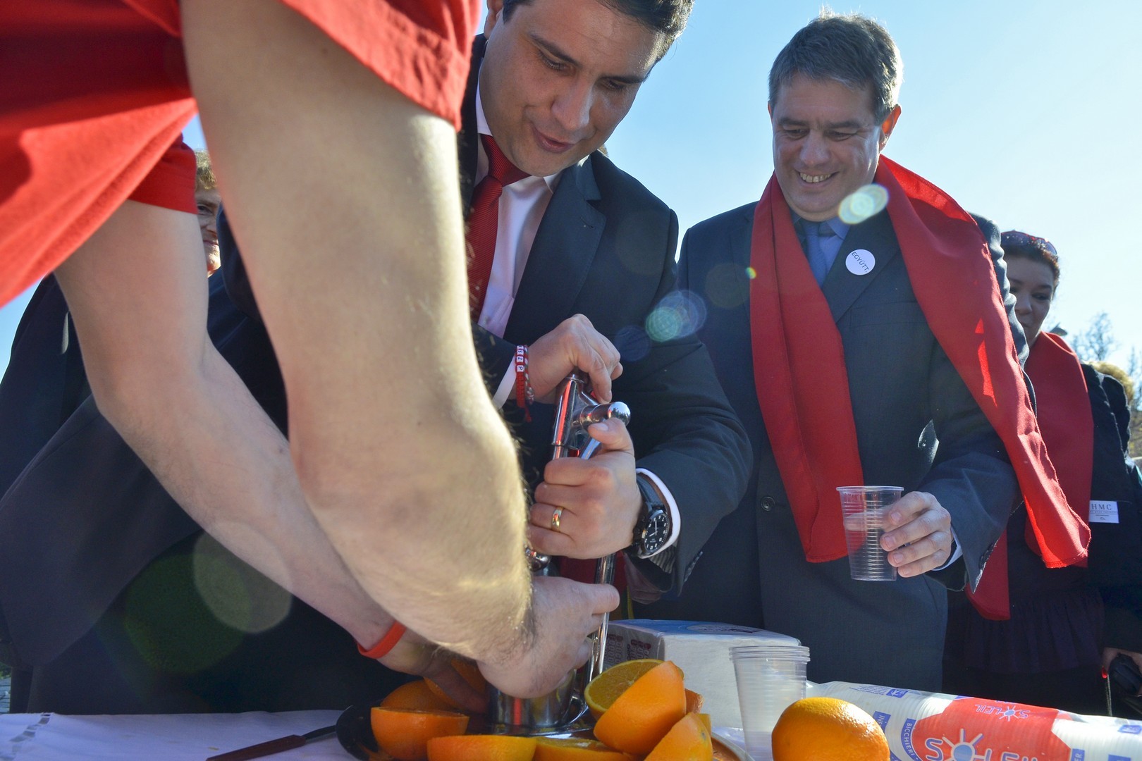 Narancsot facsart és a kinyert nedűvel koccintott Mesterházy Attila, a Kormányváltó Összefogás miniszterelnök-jelöltje és Bod Tamás, a 3. számú választókerület országgyűlési képviselő-jelöltje ma délután a Kossuth téren. A politikusokat mintegy százfős szimpatizáns várta Gyula belvárosában azért, hogy támogatásáról biztosítsák az Összefogást és tájékozódjanak egy esetleges kormányváltás utáni célkitűzéseikről.