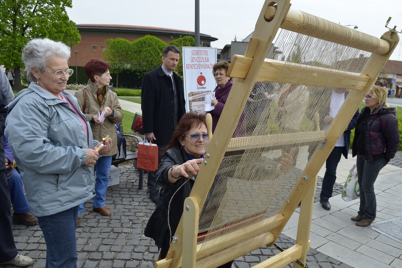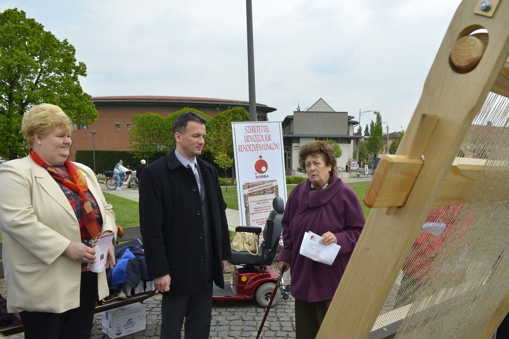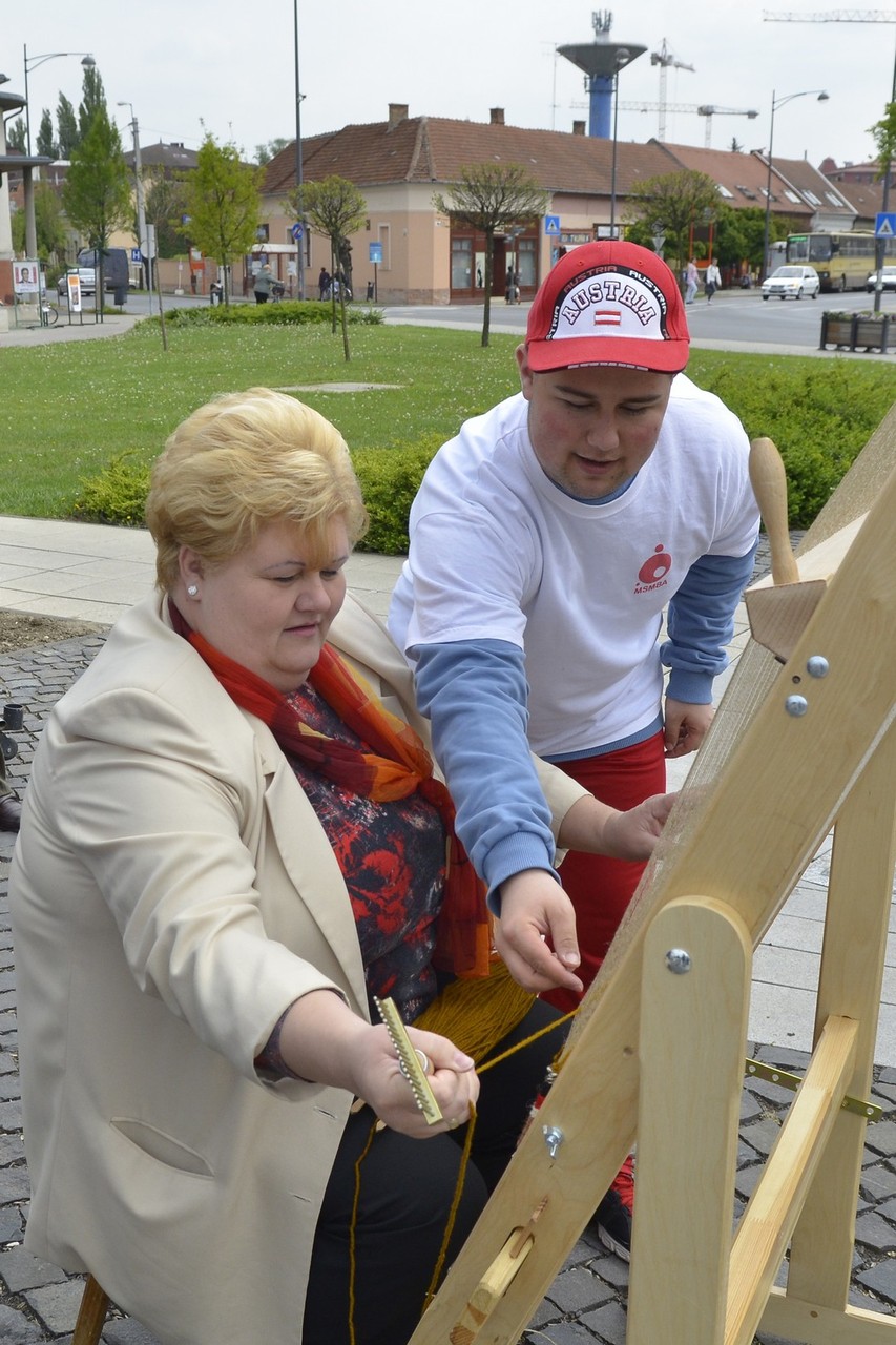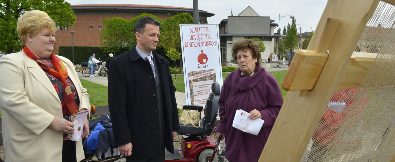 - A szövőszékes művelet nagyon egyszerű, bárki képes rá és ezáltal is kit tudja fejezni, hogy szövetséget alkot az SM-es betegekkel. A tervünk az, hogy az ország több megyéjében felállítjuk a szövőszéket és megkérjük a járókelőket, hogy - szolidaritásuk kifejezésként - üljenek a szövőszék mellé. Fontos, hogy az SM betegségről és SM betegségben szenvedőkről beszéljünk. Nagyon sokan nem ismerik az országban a diagnózist, oly sok formában jelenik meg a betegség, hogy ezerarcú kórnak hívják. Nagyon megkeseríti az SM-es betegek életét a kettős látás, a zsibbadás, az inkontinencia, a bizonytalan járás. Előfordul az utcai közlekedés alkalmával, hogy egy dülöngő járású betegről azt hiszik, hogy részeg. Természetesen, ha elesik, nem segítenek, mert miért is segítetnének egy ittasnak vélt személynek. Fontos, hogy a köztudatban benne legyen a sclerosis multiplexes betegeknek az alapproblémája – hangsúlyozta a rendezvényen Nadabánné Benyik Éva, a Magyar Sclerosis Multiplexesek Betegekért Alapítvány ügyvezető alelnöke, a kezdeményezés patrónusa és Herczegné Szabó Marianna, a Békés Megyei SM-es Emberek Közhasznú Szervezetének elnöke.
