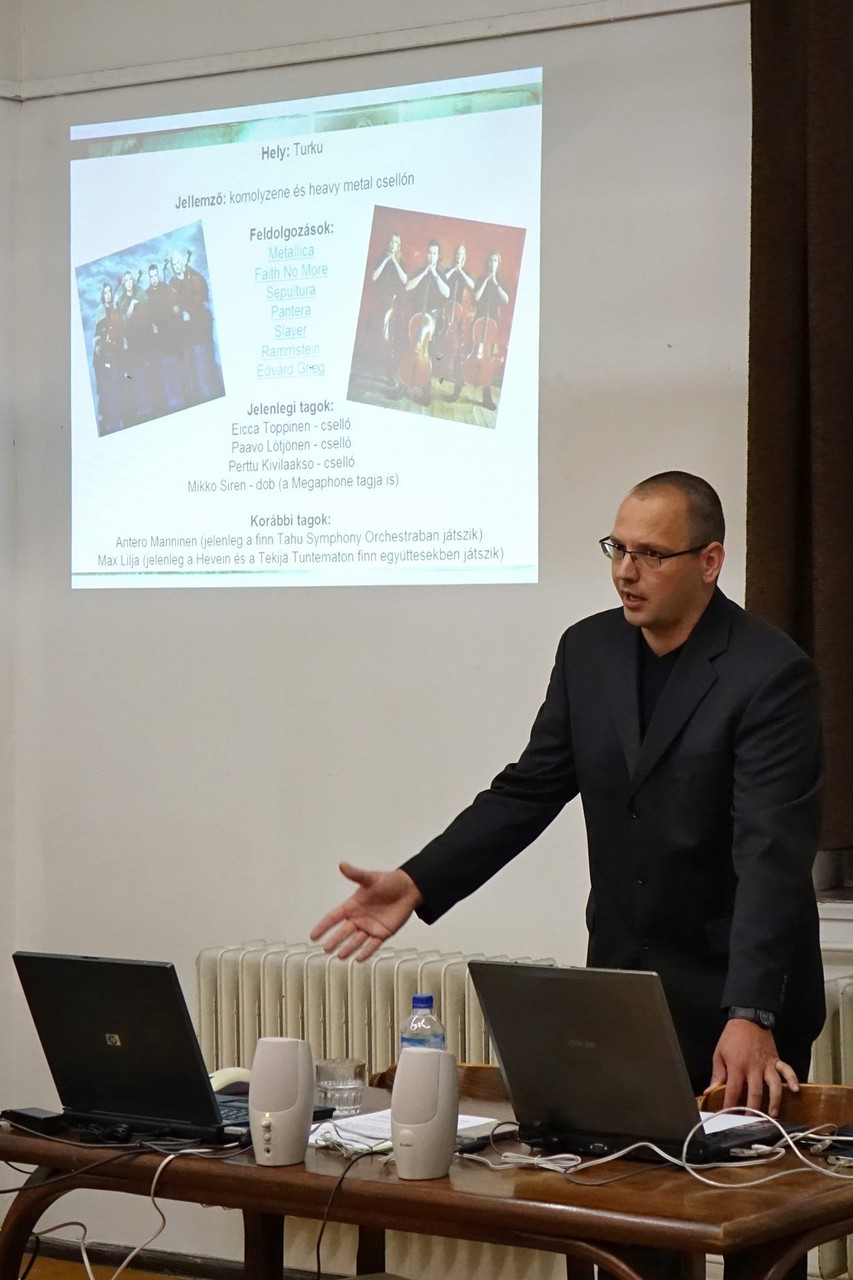Így a metál megjelenésének sokféleségét finn példán keresztül mutatta be, ahol lehetséges volt, hazai megfelelővel társítva. Elárulta, hogy a finn zenekarok többnyire svédül, lappul vagy angolul énekelnek, finnül csak ritkábban hallani őket, illetve olyan sajátosságokra is felhívta a figyelmet, mint az egyes irányzatok szövegvilága, ének- valamint játéktechnikai elemei.