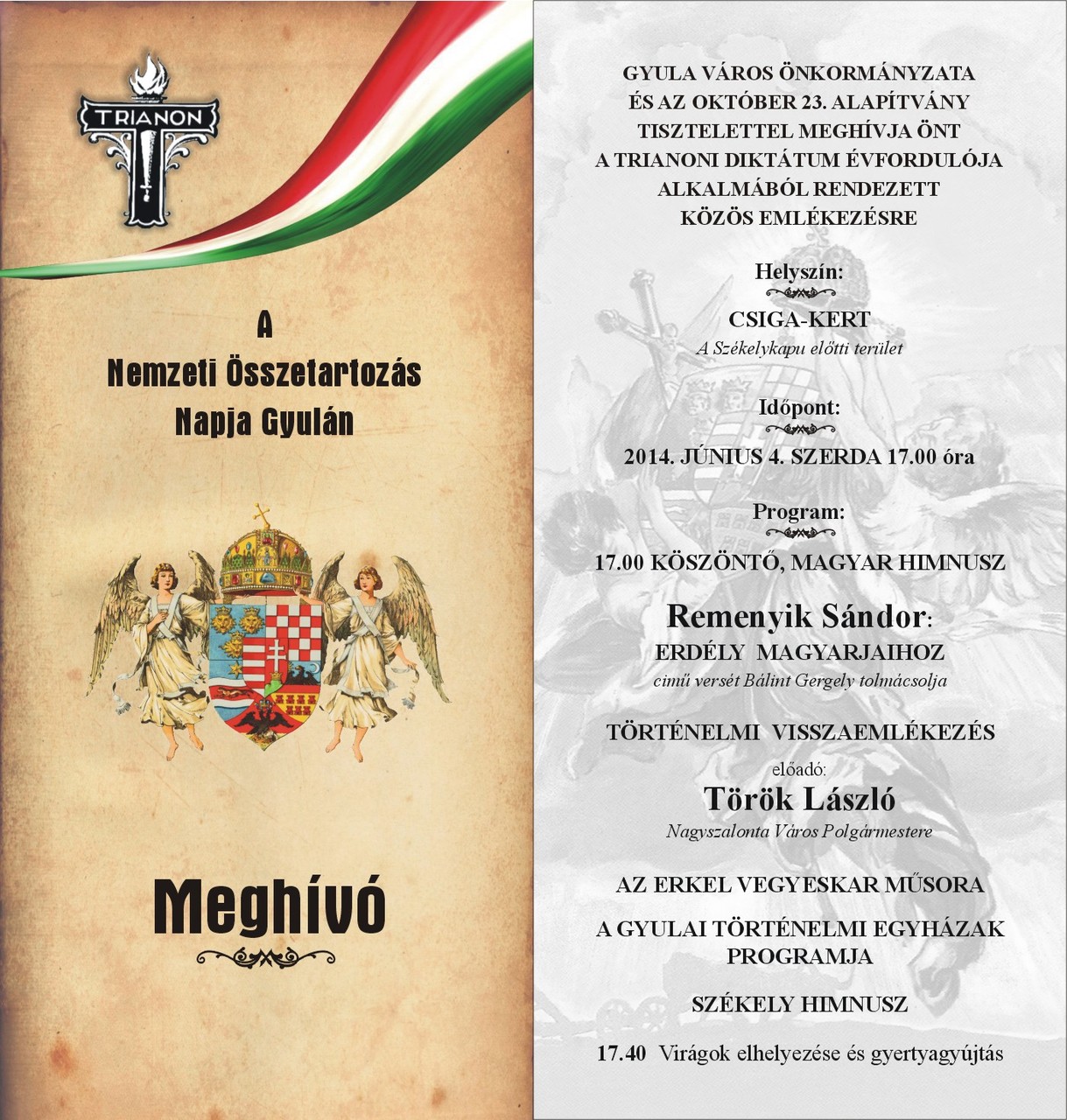 A trianoni diktátum évfordulója alkalmából, a Nemzeti Összetartozás Napján közös emlékezésre és gyertyagyújtásra invitál június 4-én, szerdán 17 órakor a Csiga-kertben lévő székelykapu elé Gyula Város Önkormányzata és az Október 23. Alapítvány.