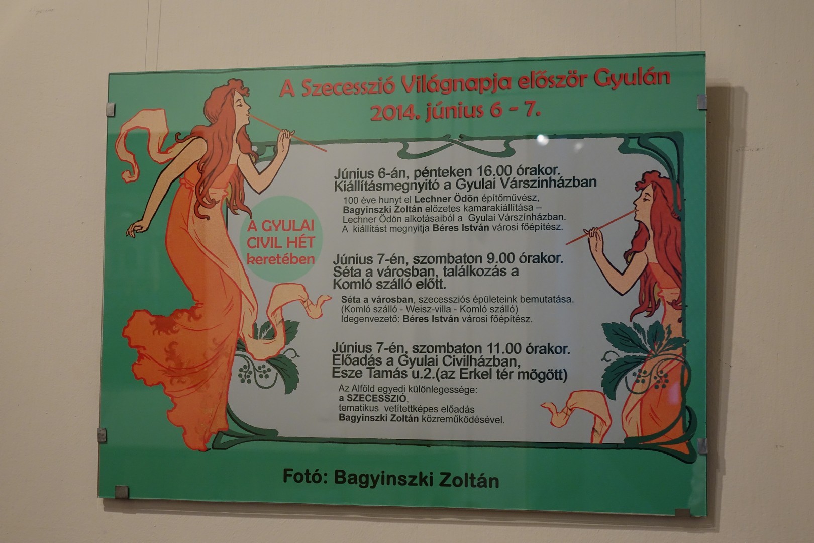 A program a hétvégén június 7-én szombaton 9 órai kezdettel városi sétával folytatódik, mely során Béres István városi főépítész a gyulai szecessziós épületeket mutatja be. (Találkozás a Komló szálló előtt.) Szintén június 7-én, szombaton 11 órakor Az Alföld egyedi különlegessége címmel tart a szecesszióról szóló tematikus, vetítéssel egybekötött előadást Bagyinszki Zoltán a Gyulai Civilházban (Esze Tamás u.2.).