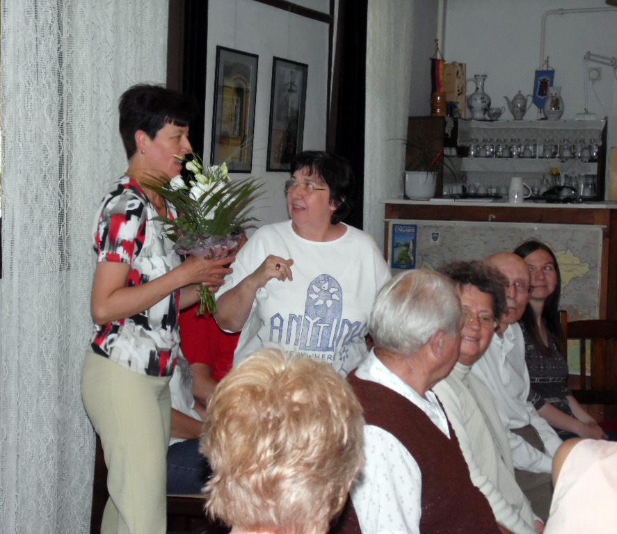 Tapasztalataik megosztása előtt az egybegyűltek Nagy Mária tanárnőt, a Német Kisebbségi Önkormányzat tagját köszöntötték, akinek hosszú évek óta tartó eredményes munkáját a kör nevében Kovácsné Murvai Zsuzsanna egy szép virágcsokorral köszönte meg.