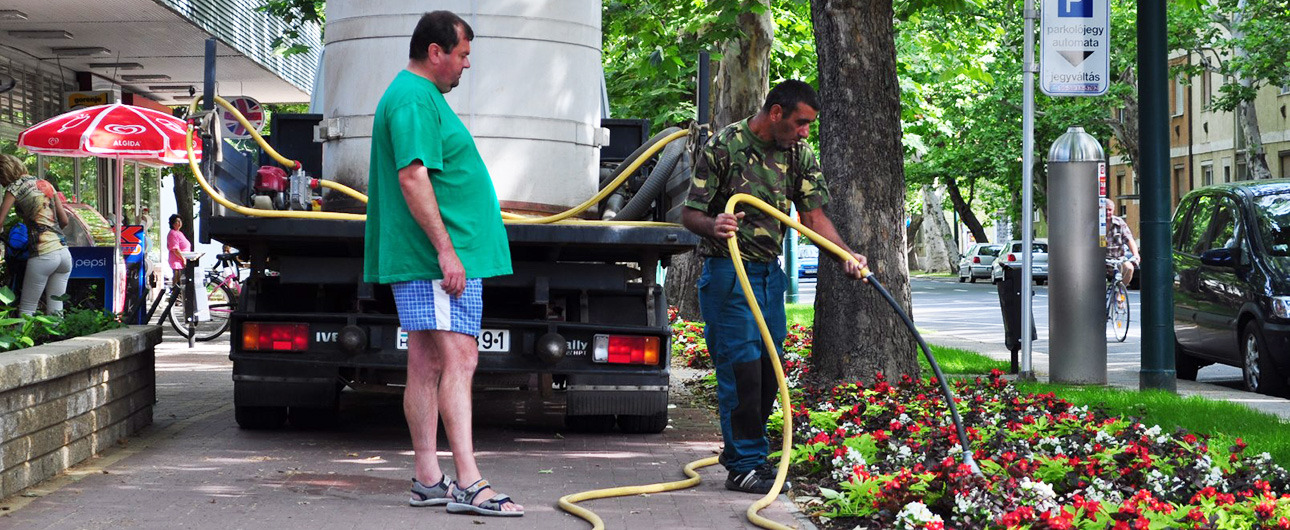 A nyári kánikulai napokon a Gyulai Közüzemi Kft. munkatársai, ha kell, a nap 24 órájában végzik az elültetett növények (egynyári virágok, cserjék, fák) öntözését. Egy-egy nap több mint 30 000 liter vizet juttatnak ki munkatársaink a növények számára.