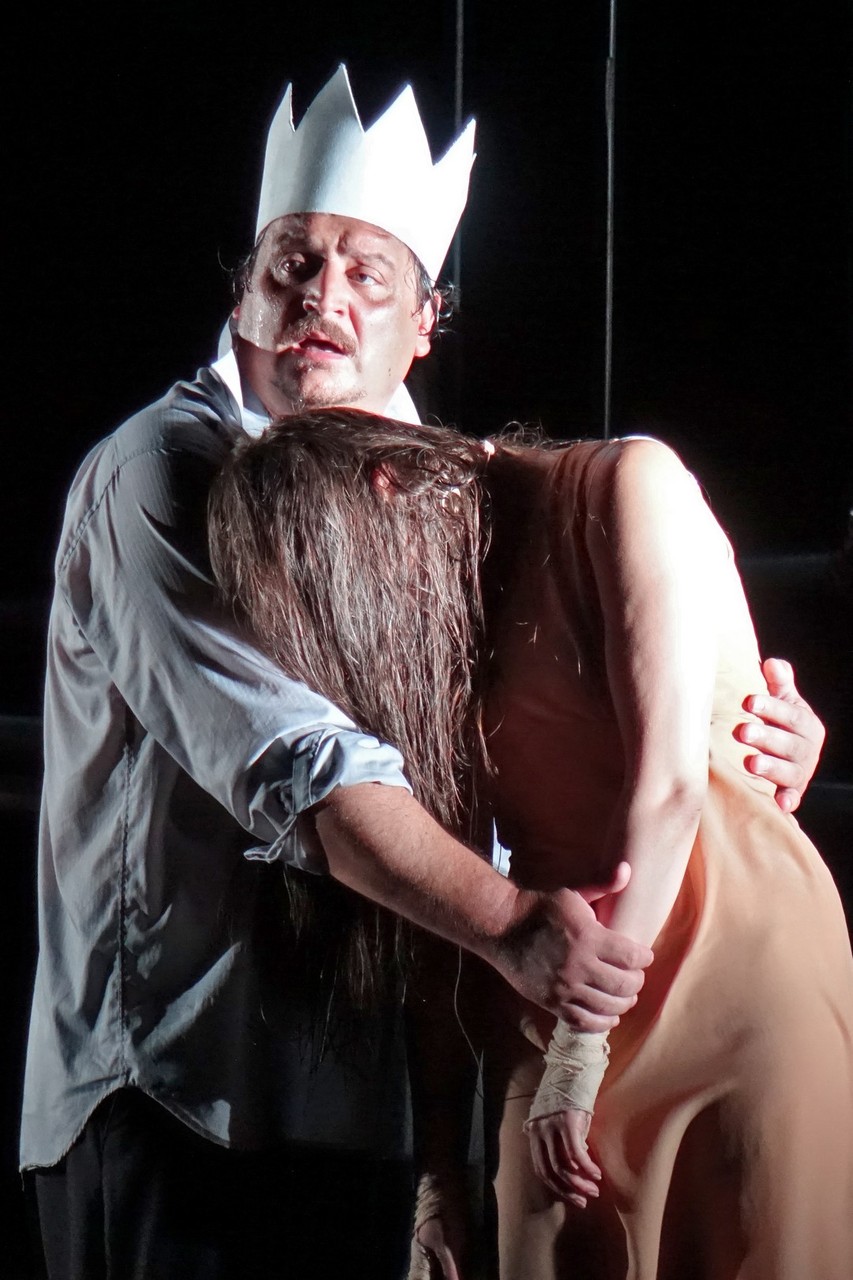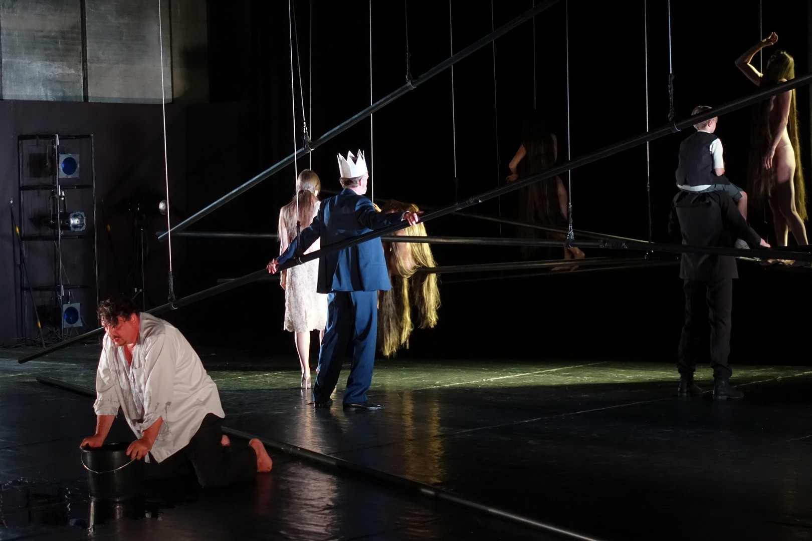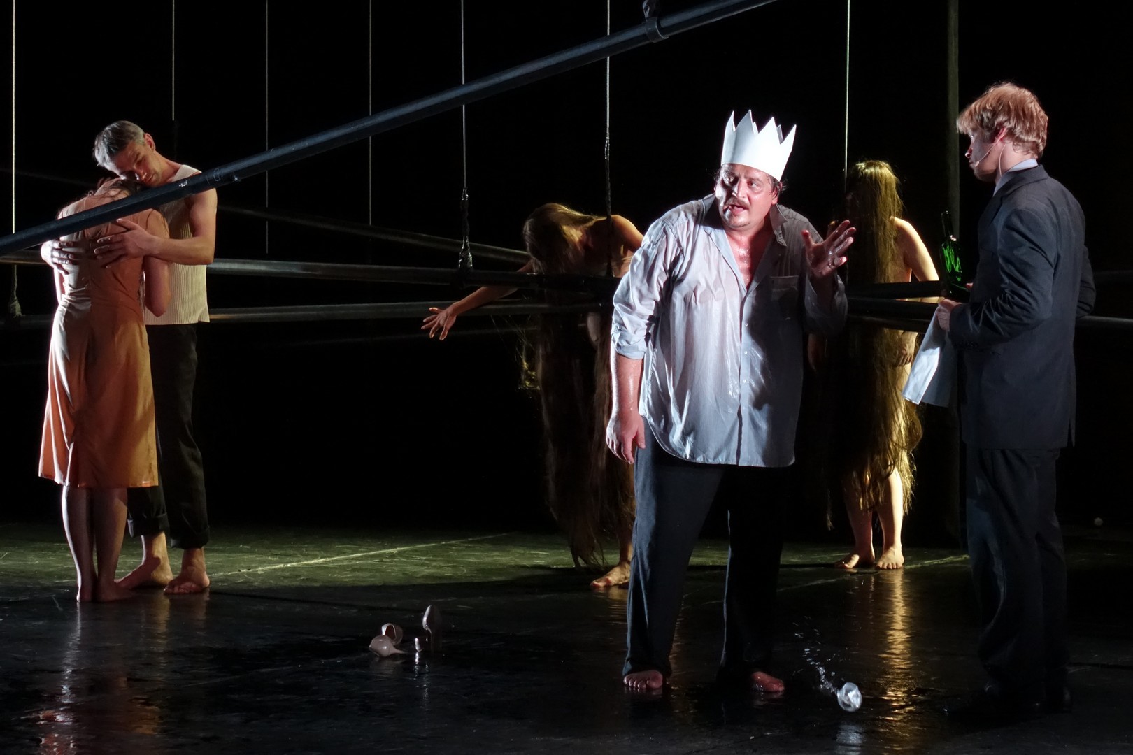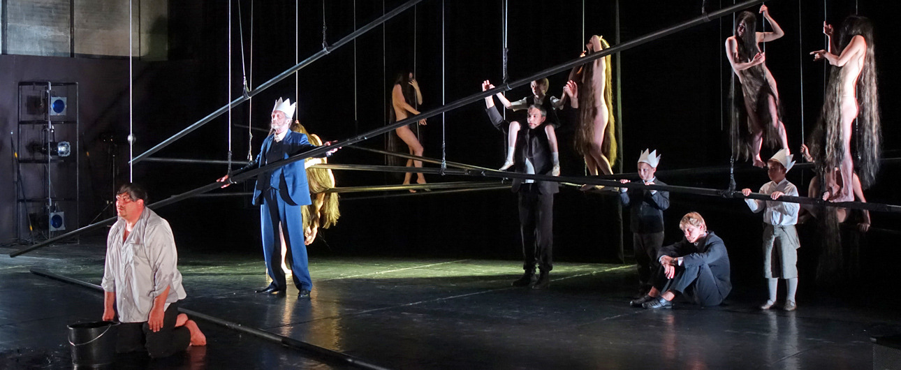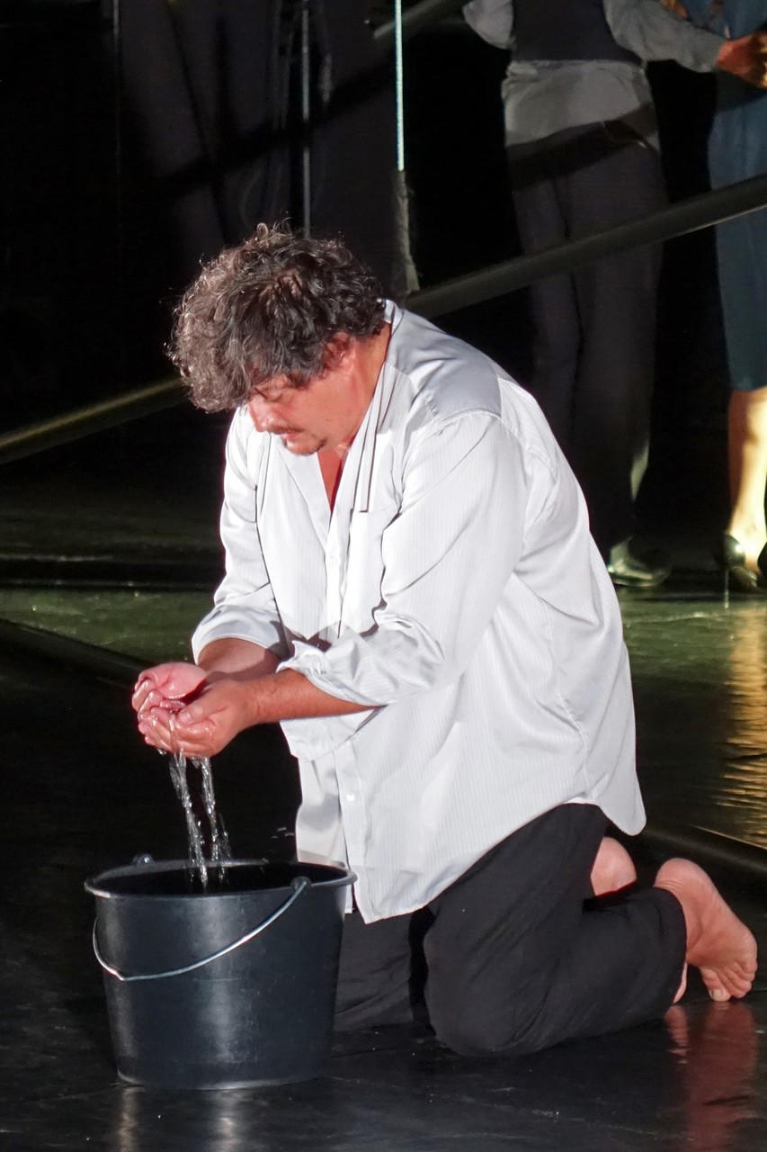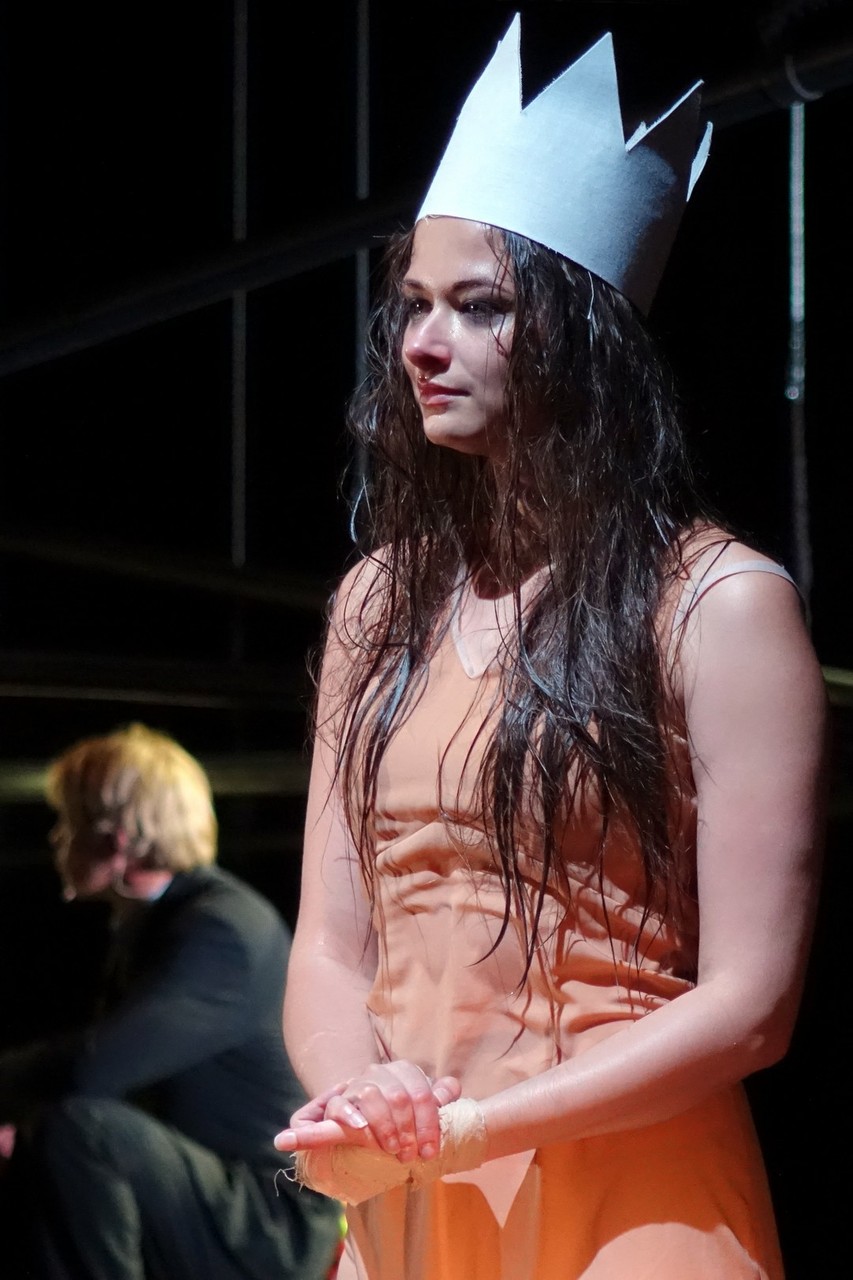 Azonban nem csak a díszlet, a kellékek is egyszerűek, mintegy utalásszerűek voltak, ami nem csak Luk Perceval, hanem a teljes orosz színjátszás sajátja, hisz ábrázolásként elég egy-egy papírkorona, műanyag vödör, és gyilkos tőrnek is megteszi egy borosüveg.