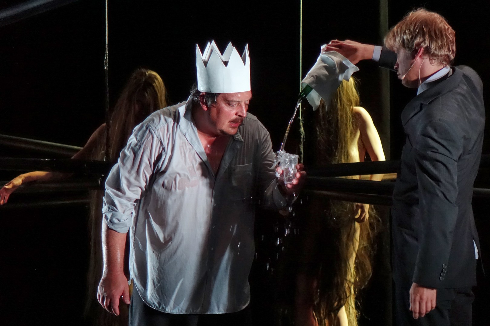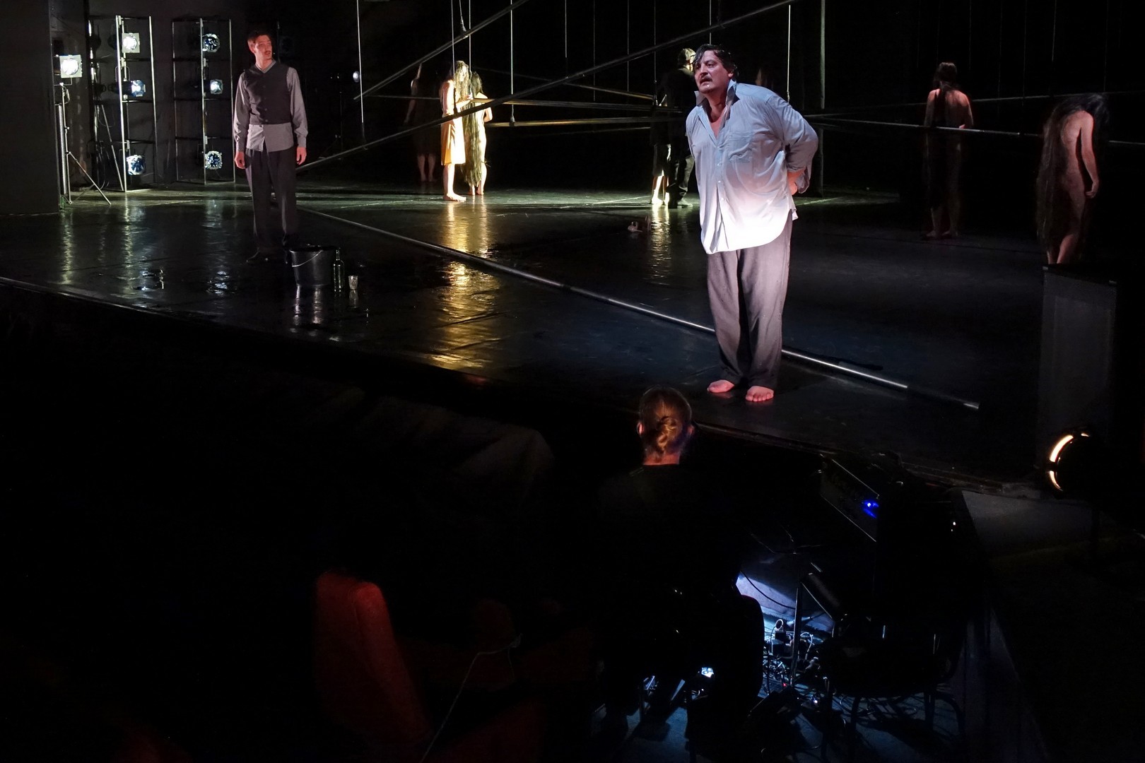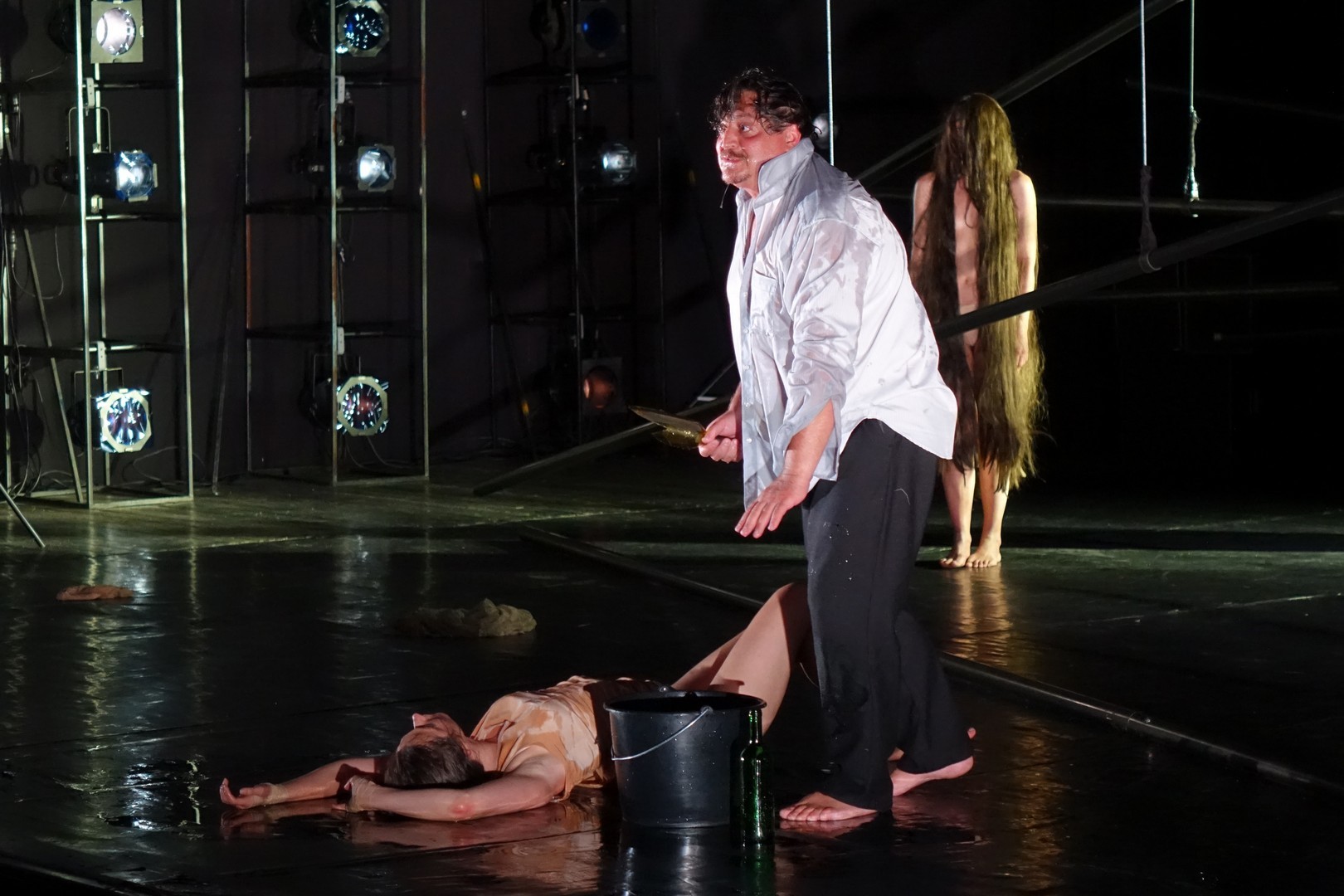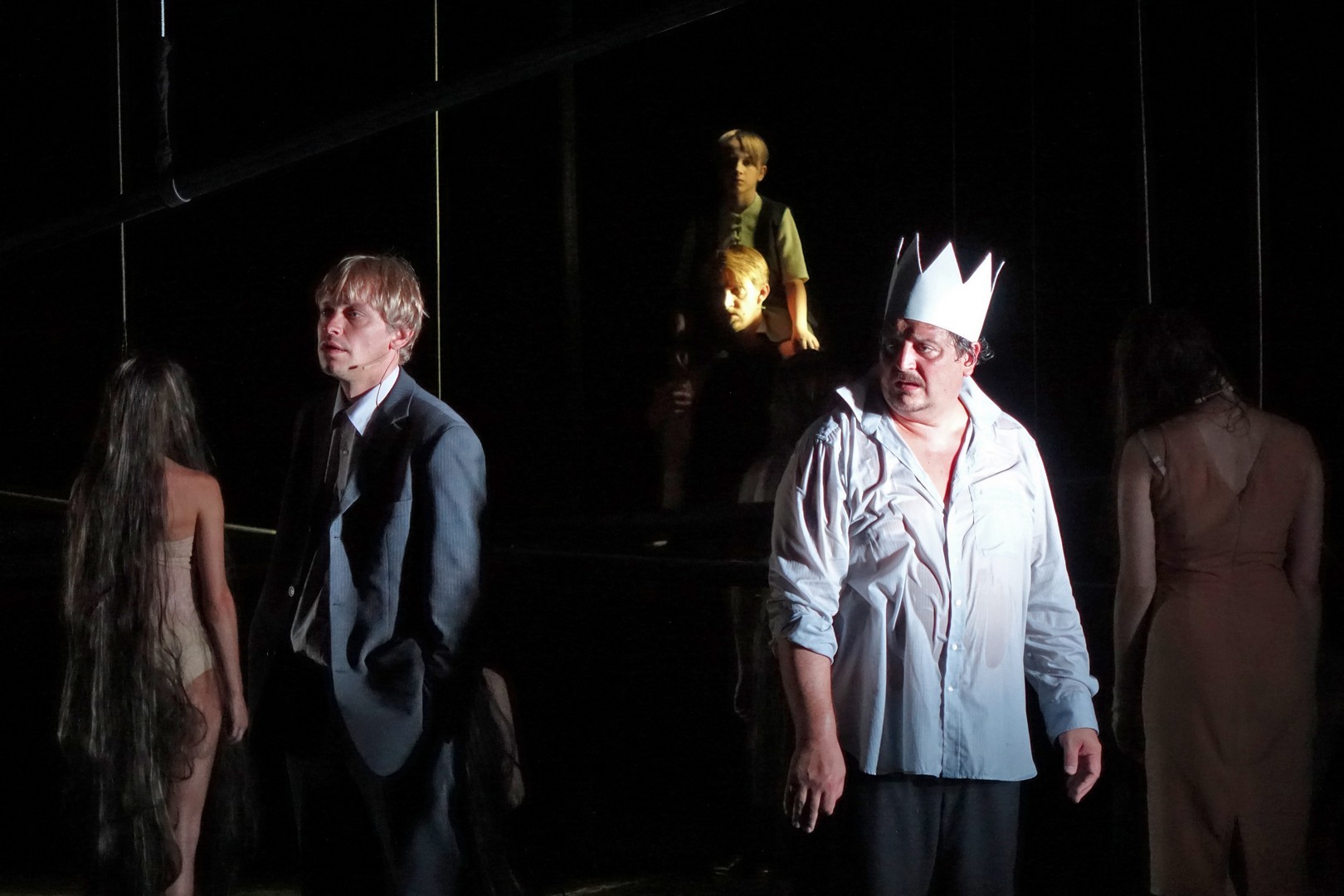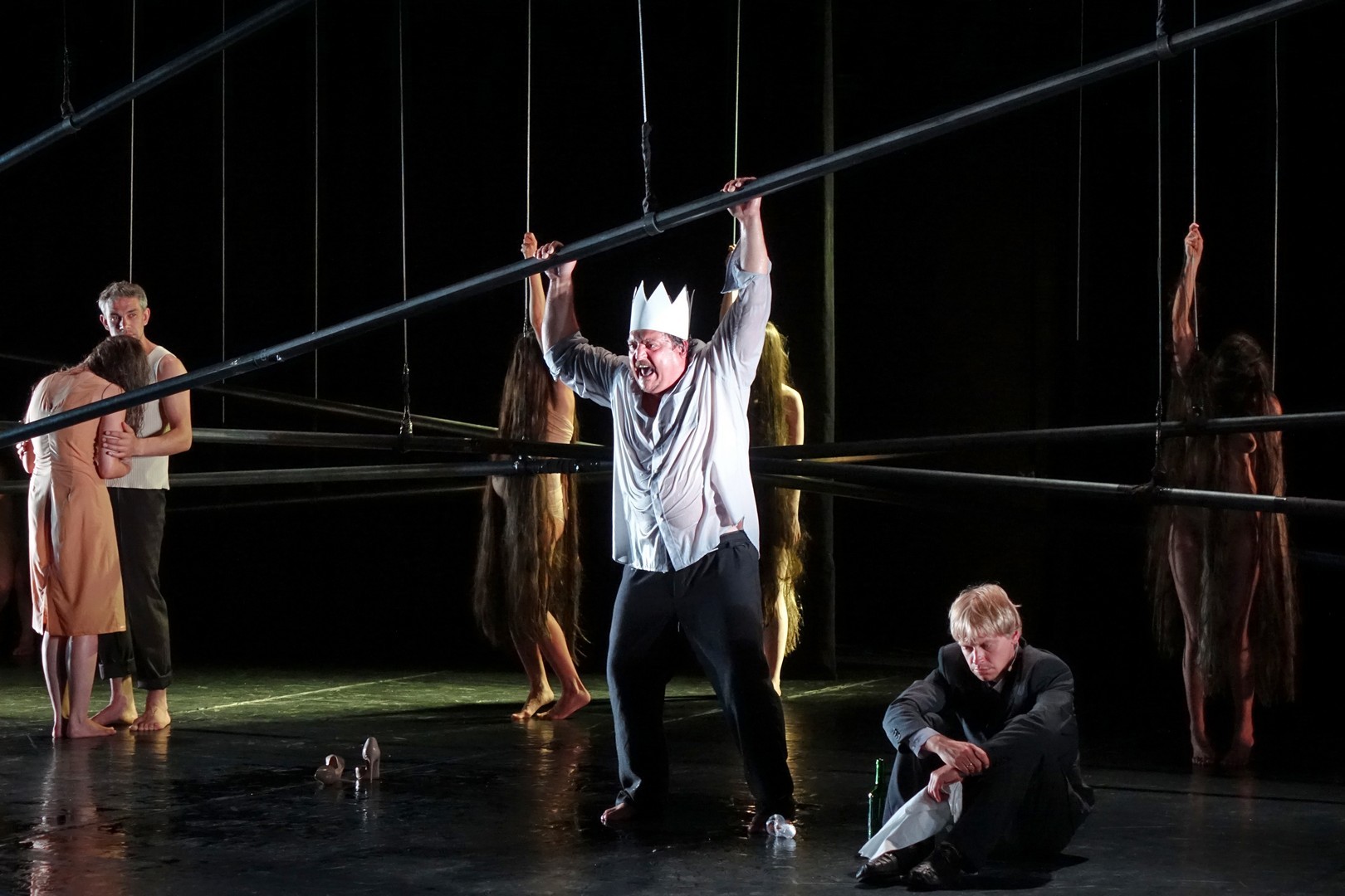 Azonban nem csak a díszlet, a kellékek is egyszerűek, mintegy utalásszerűek voltak, ami nem csak Luk Perceval, hanem a teljes orosz színjátszás sajátja, hisz ábrázolásként elég egy-egy papírkorona, műanyag vödör, és gyilkos tőrnek is megteszi egy borosüveg.