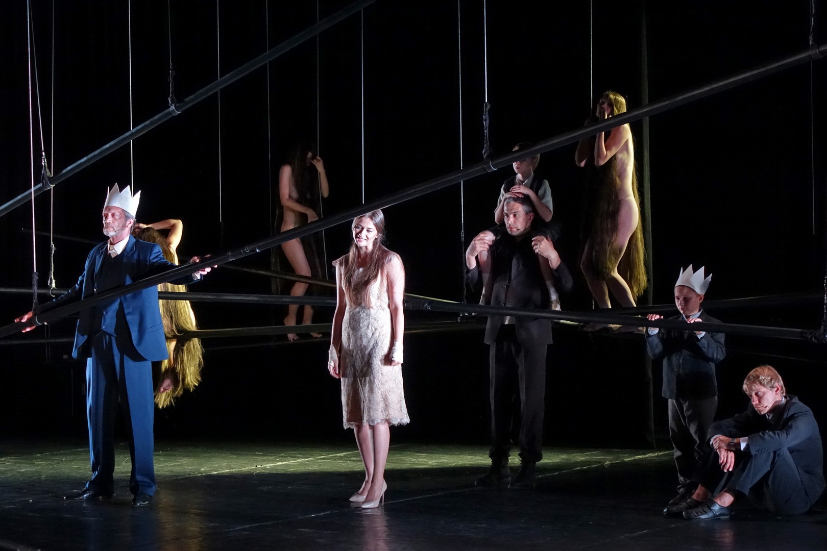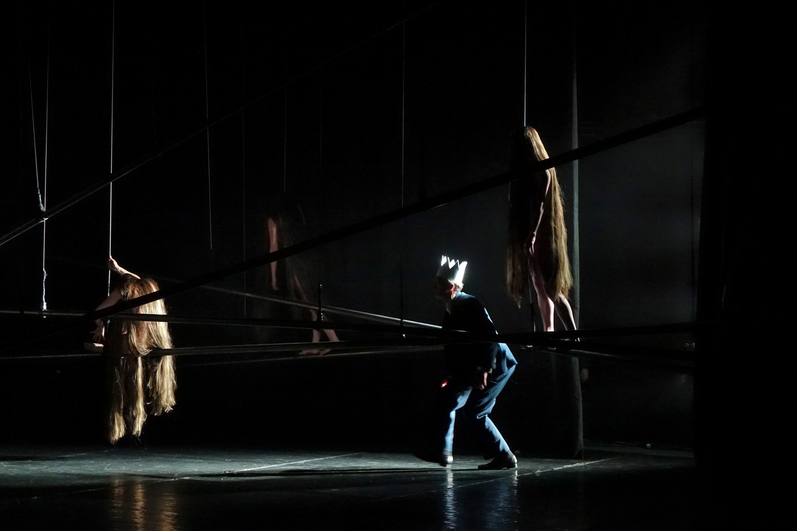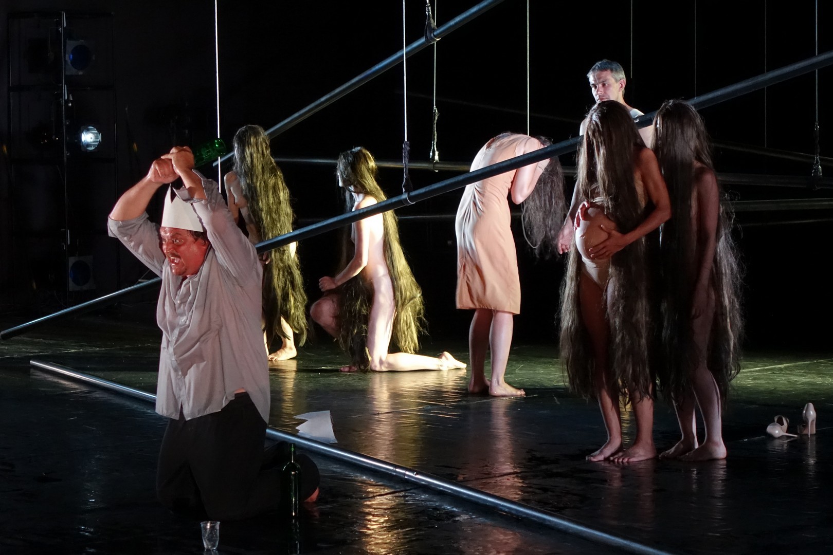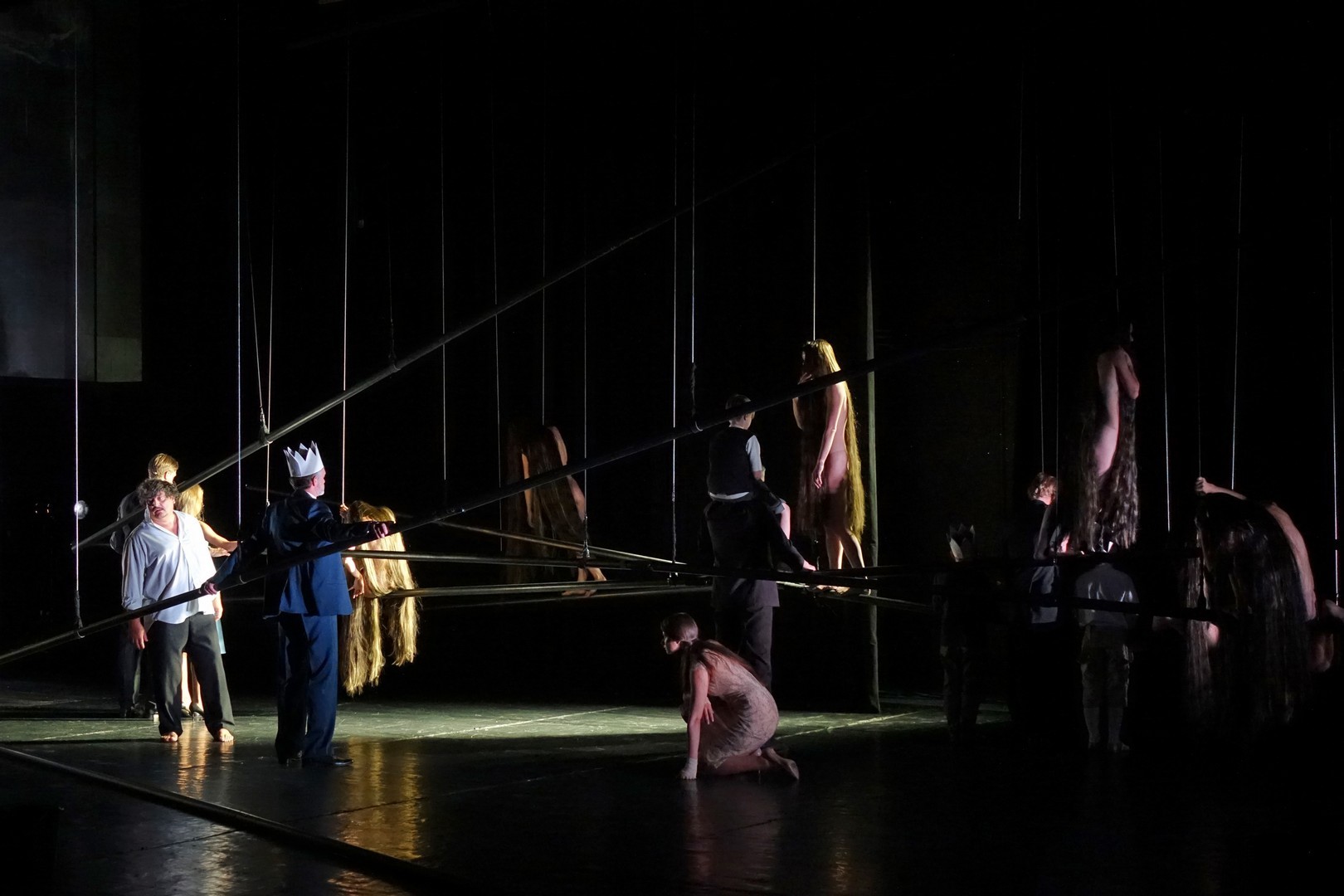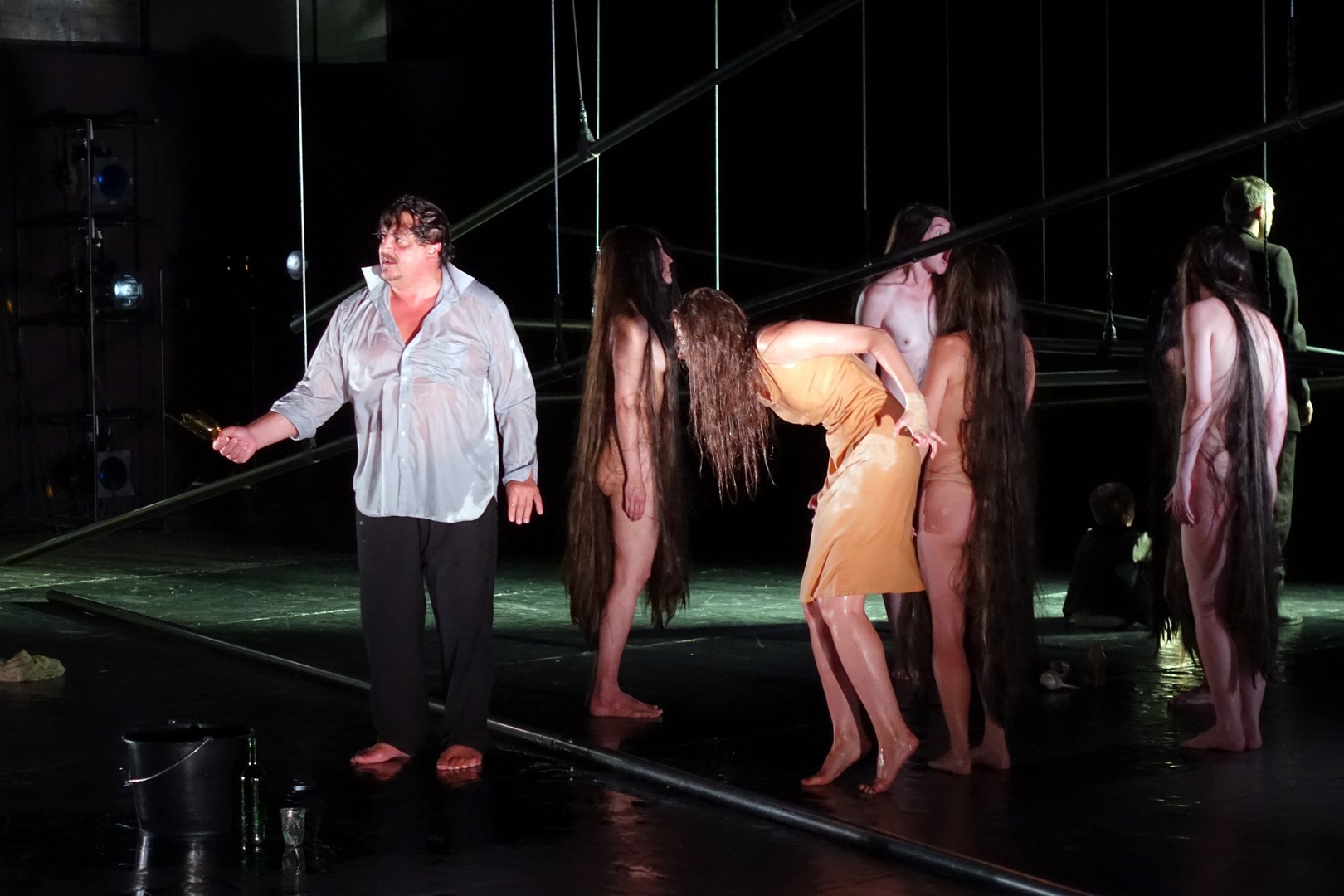 Azonban nem csak a díszlet, a kellékek is egyszerűek, mintegy utalásszerűek voltak, ami nem csak Luk Perceval, hanem a teljes orosz színjátszás sajátja, hisz ábrázolásként elég egy-egy papírkorona, műanyag vödör, és gyilkos tőrnek is megteszi egy borosüveg.