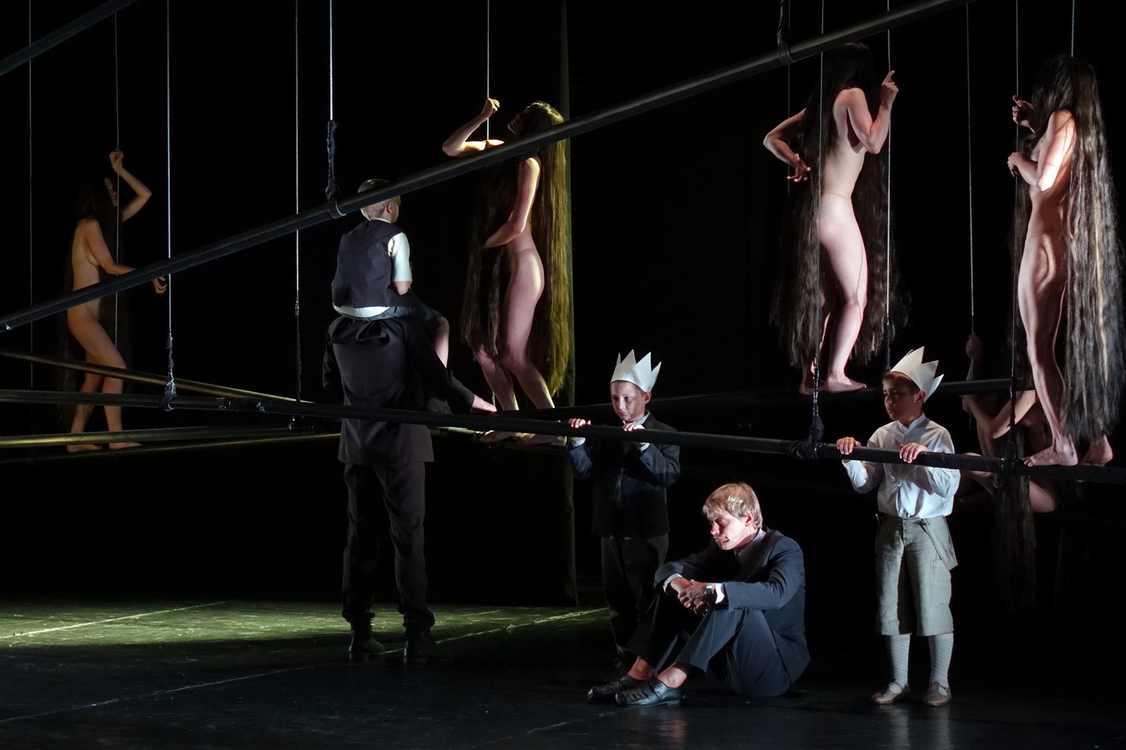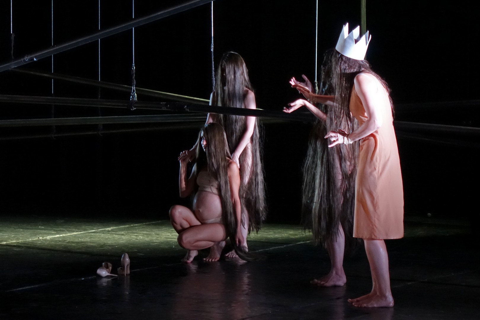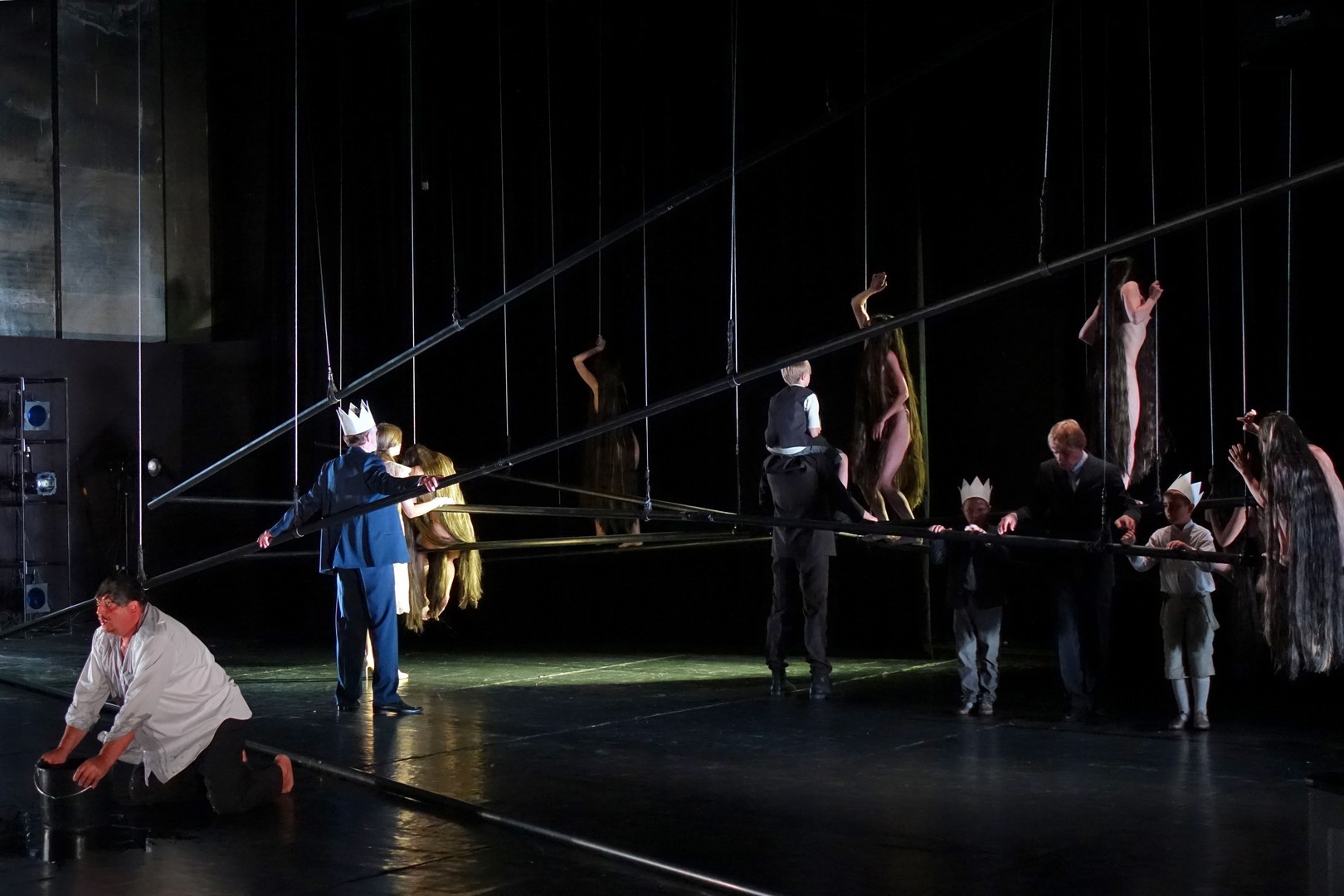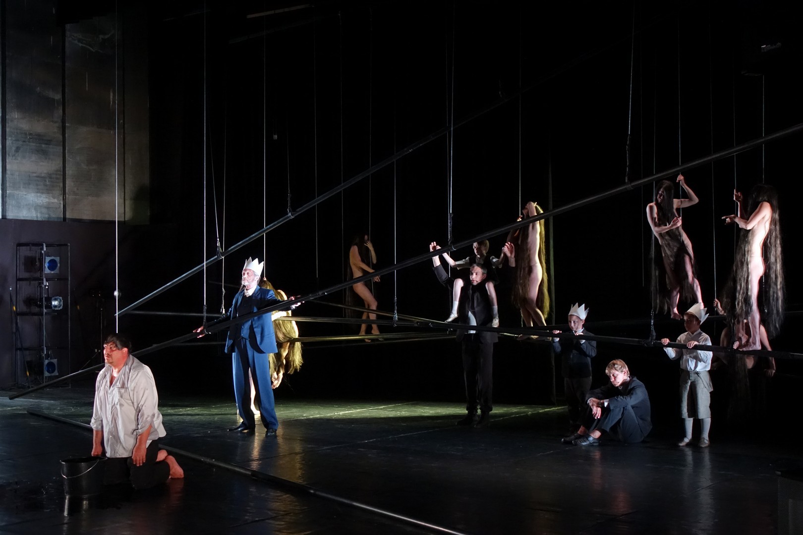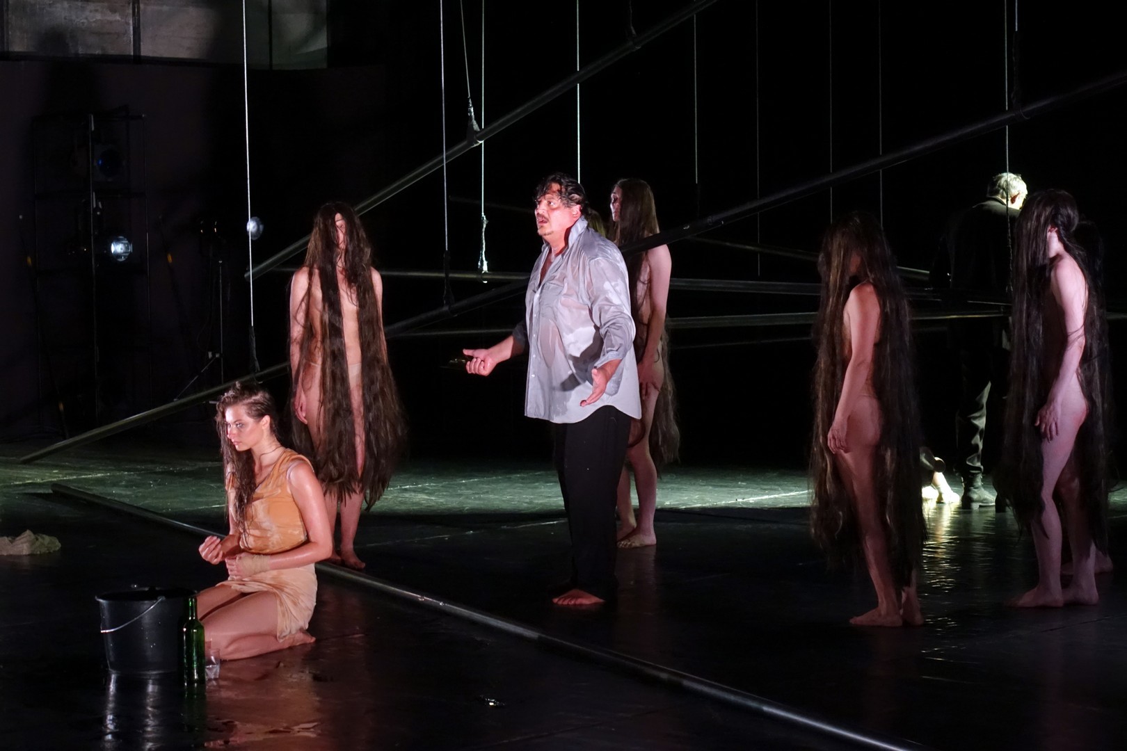 Azonban nem csak a díszlet, a kellékek is egyszerűek, mintegy utalásszerűek voltak, ami nem csak Luk Perceval, hanem a teljes orosz színjátszás sajátja, hisz ábrázolásként elég egy-egy papírkorona, műanyag vödör, és gyilkos tőrnek is megteszi egy borosüveg.