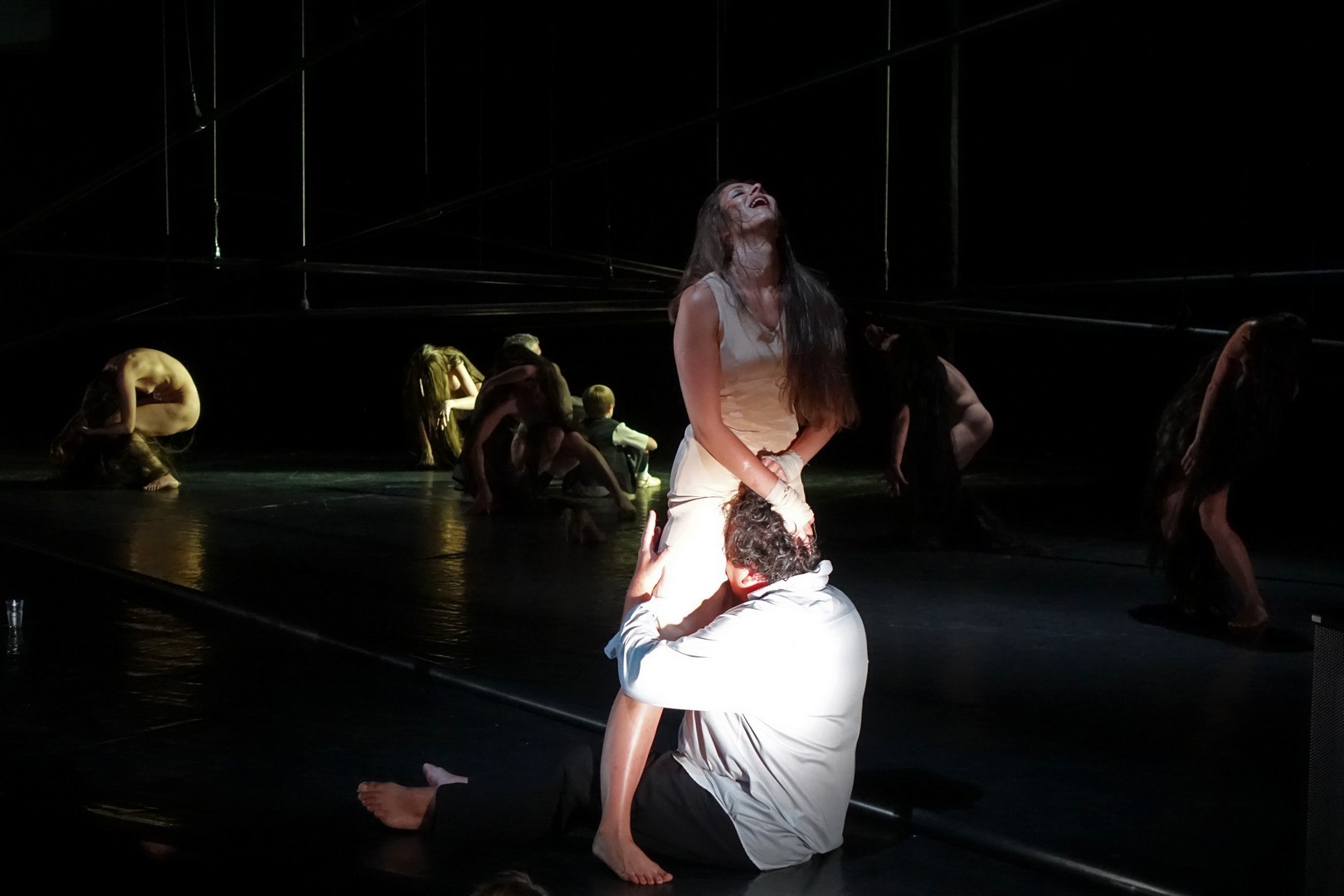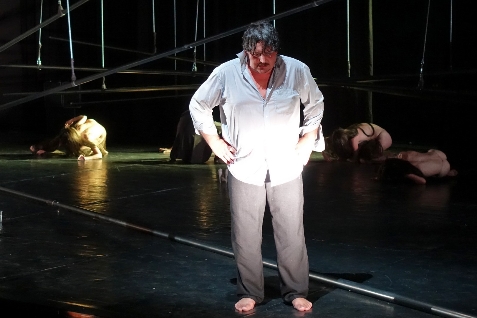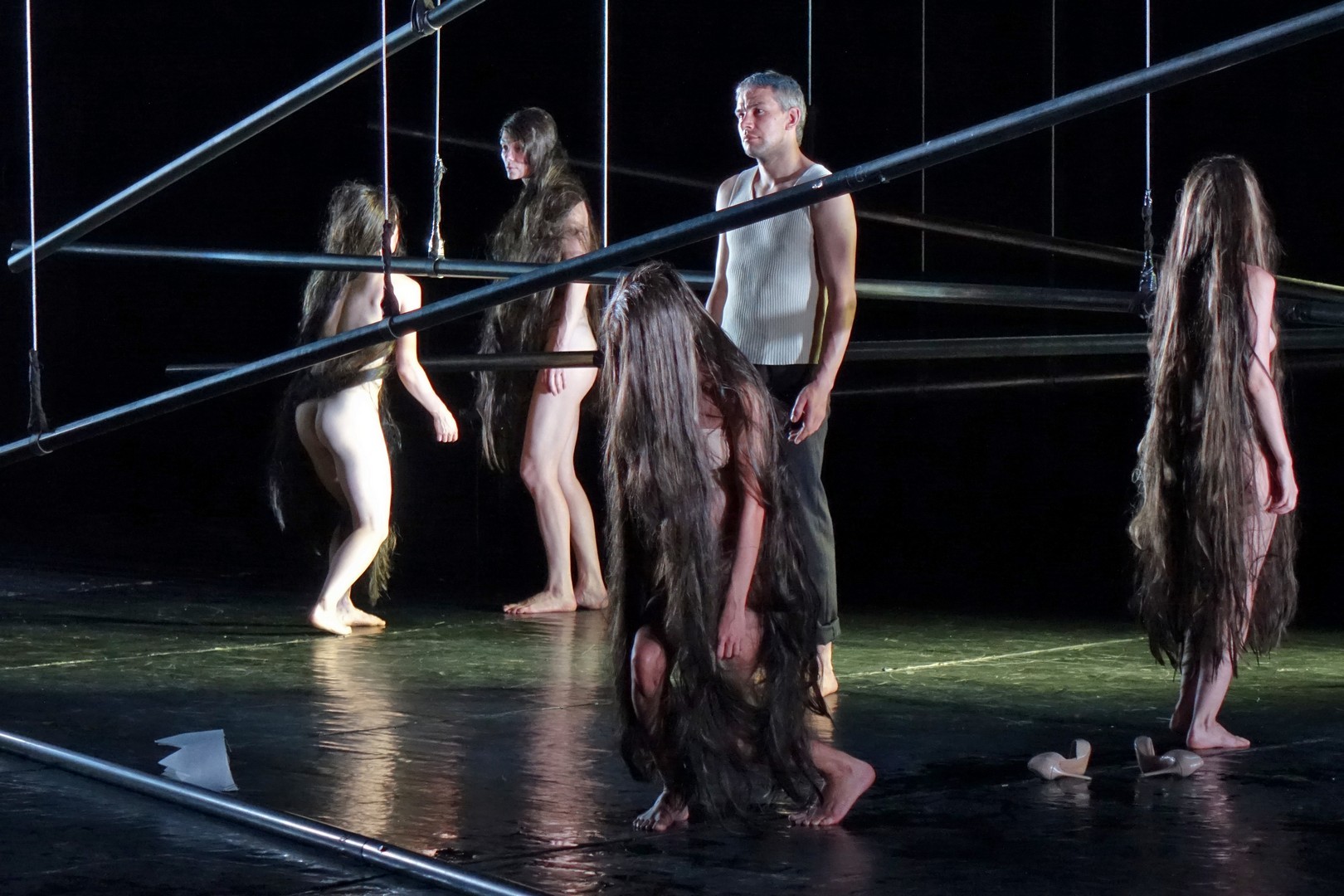 A függesztett rudakkal a mozgásterületet geometrikusan tagolt puritán szín semmit sem ábrázolt, csak a tér illúzióját szuggerálva nyújtott lehetőséget az egymással szorosan összefüggő színészi játékra, aminek mozgásbeli szépsége már meghaladta a színjátszás formavilágát, hisz minden egyes gesztusa annak az összetartozásnak a dekoratív képét mutatta, amiben mindenki csak kollektív öntudattal rendelkezik.