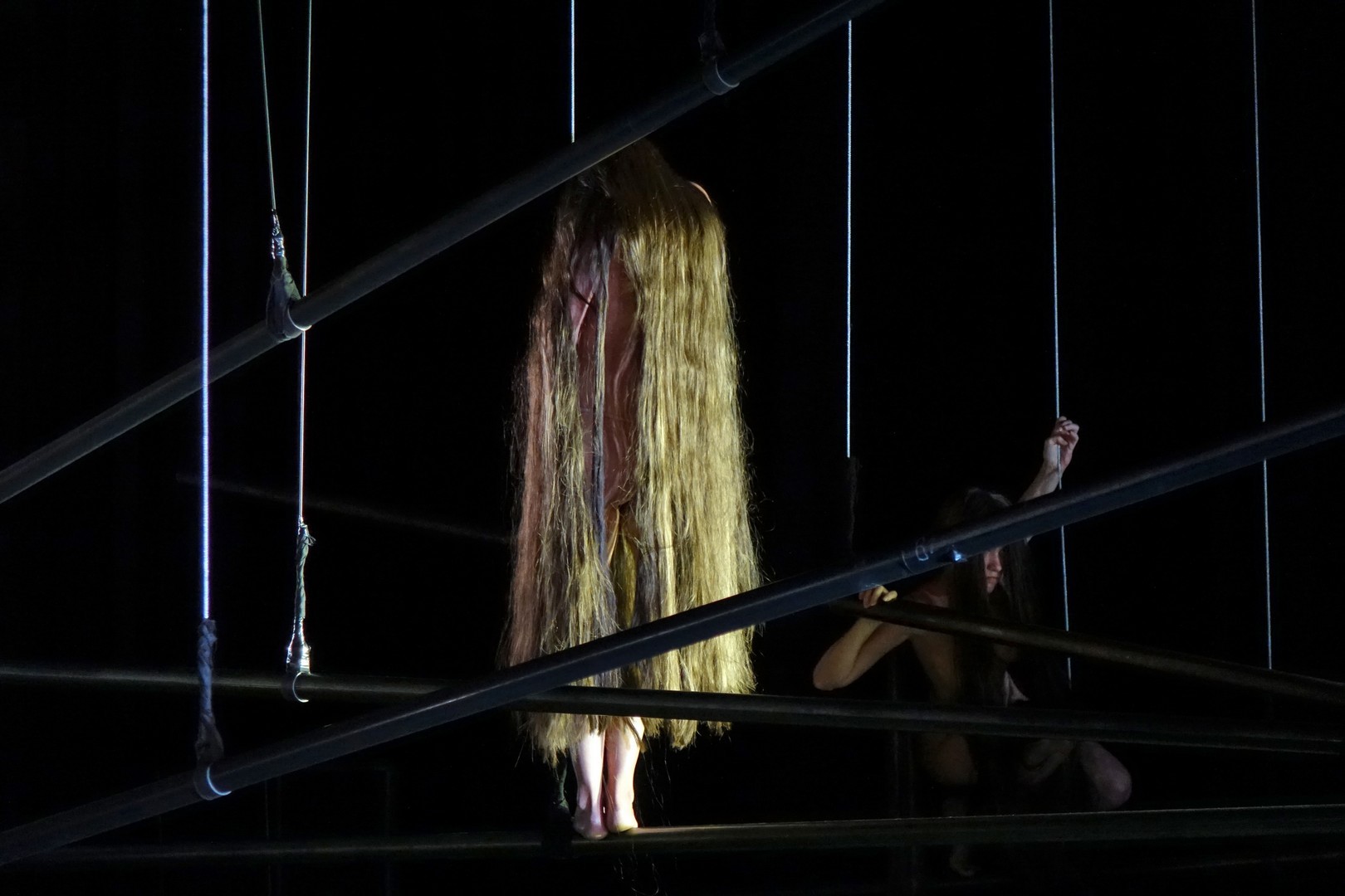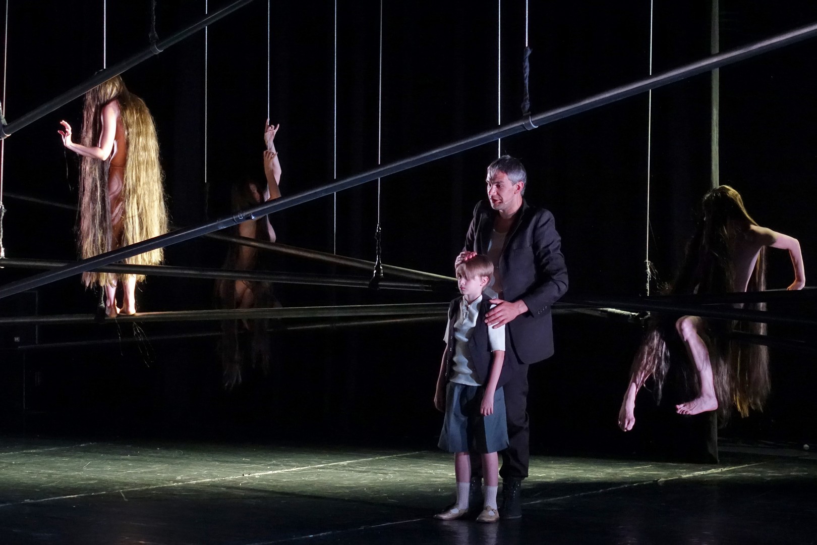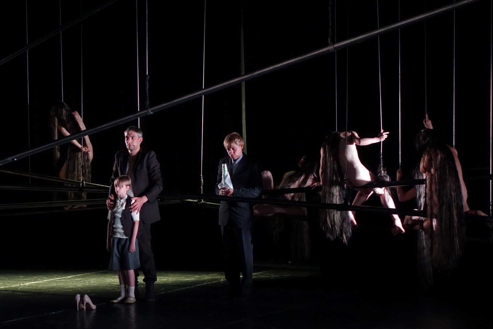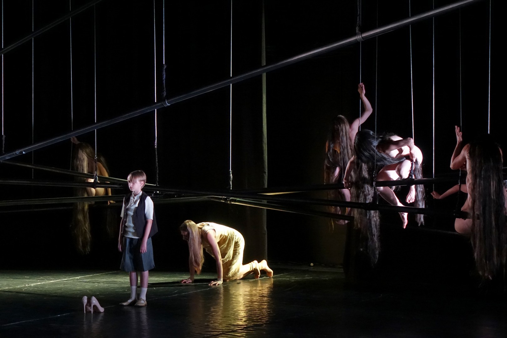 A függesztett rudakkal a mozgásterületet geometrikusan tagolt puritán szín semmit sem ábrázolt, csak a tér illúzióját szuggerálva nyújtott lehetőséget az egymással szorosan összefüggő színészi játékra, aminek mozgásbeli szépsége már meghaladta a színjátszás formavilágát, hisz minden egyes gesztusa annak az összetartozásnak a dekoratív képét mutatta, amiben mindenki csak kollektív öntudattal rendelkezik.
