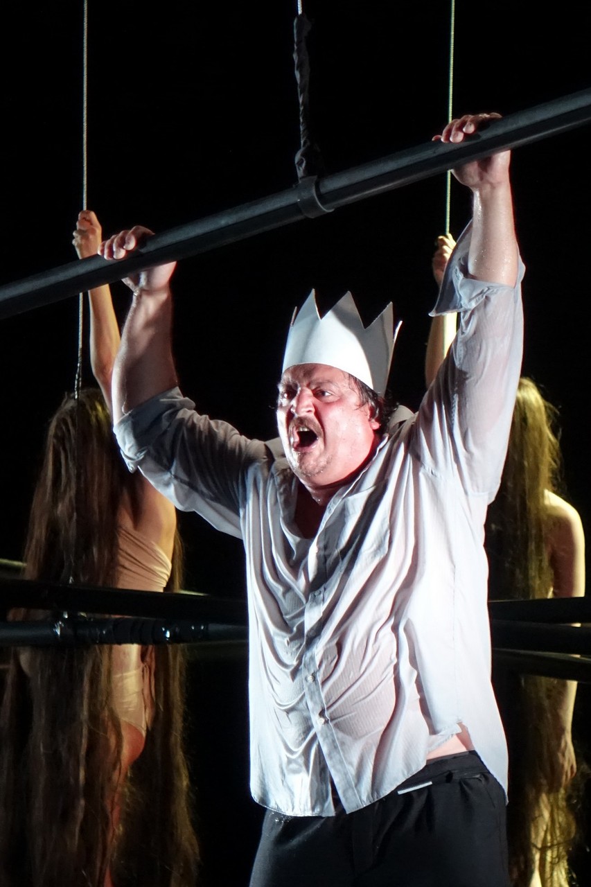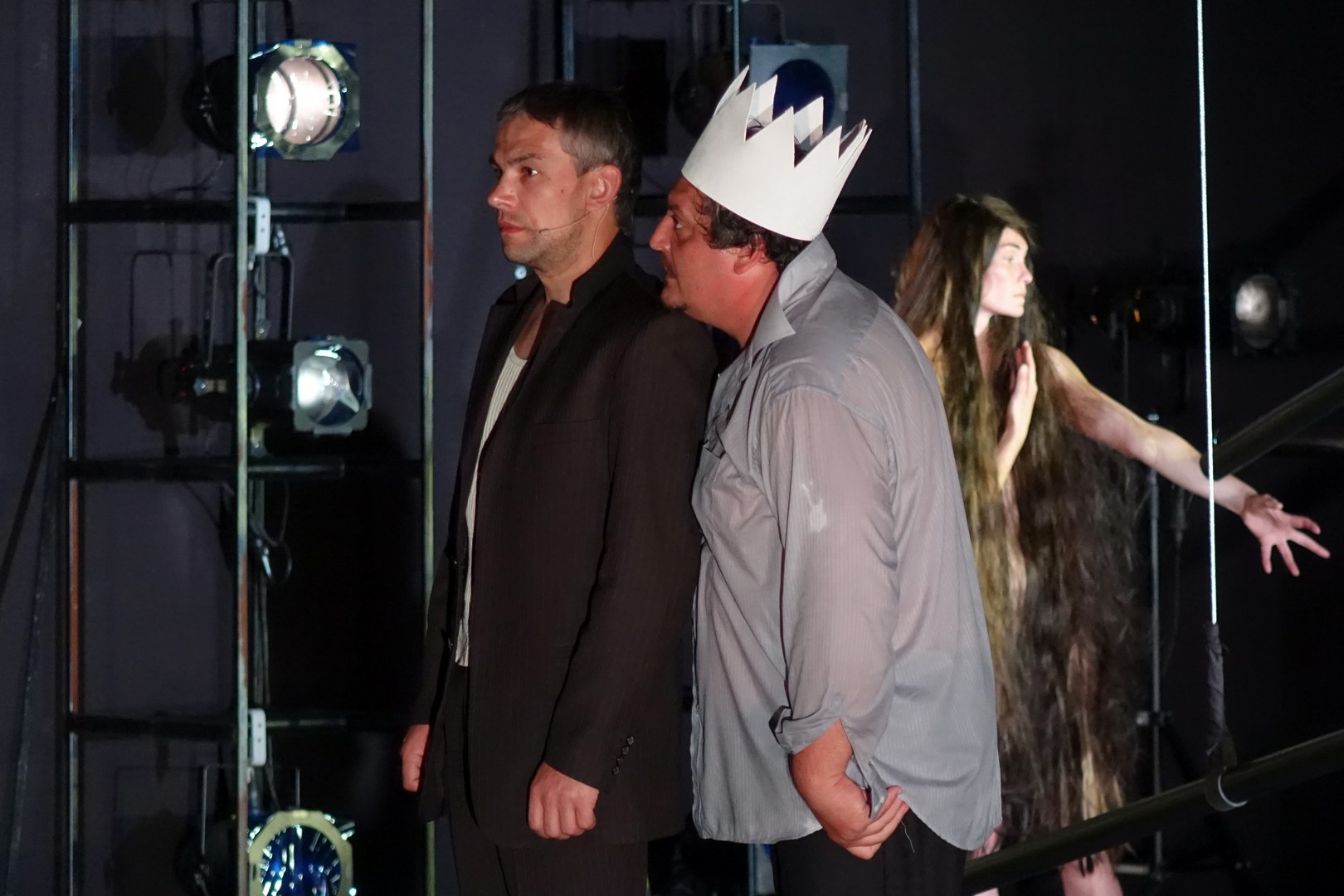 Igazi kuriózum, hogy színvonalas Macbeth-előadásokban bővelkedik a gyulai nyár, melyek közül talán a Szentpétervári Balti Ház Fesztivál Színház előadása emelkedik ki leginkább, ami július 11-én a Gyulai Várszínház szervezésében az Erkel Ferenc Művelődési Ház színpadán volt látható. A zárt tér indoka nem a kétséges időjárás, hanem a zsinórpadlás megléte volt, az pedig már csak érdekes háttéradalék, hogy a nagymester tragédiáinak utolsó darabját eredetileg is zárttéri előadásra szánta, korszerű színpadi gépezetekkel - amit leginkább a másnapi, beregszászi produkció teljesített -, itt mindössze néhány keresztbe feszülő rúd alkotta a színpadképet.