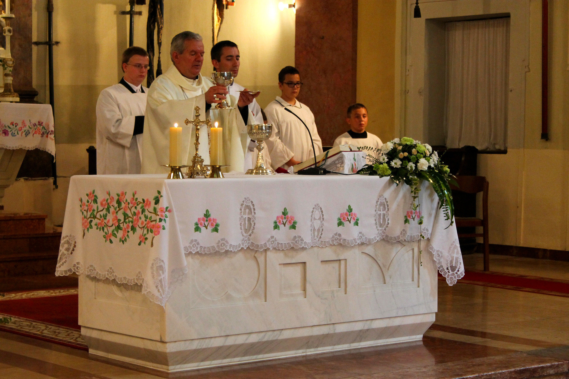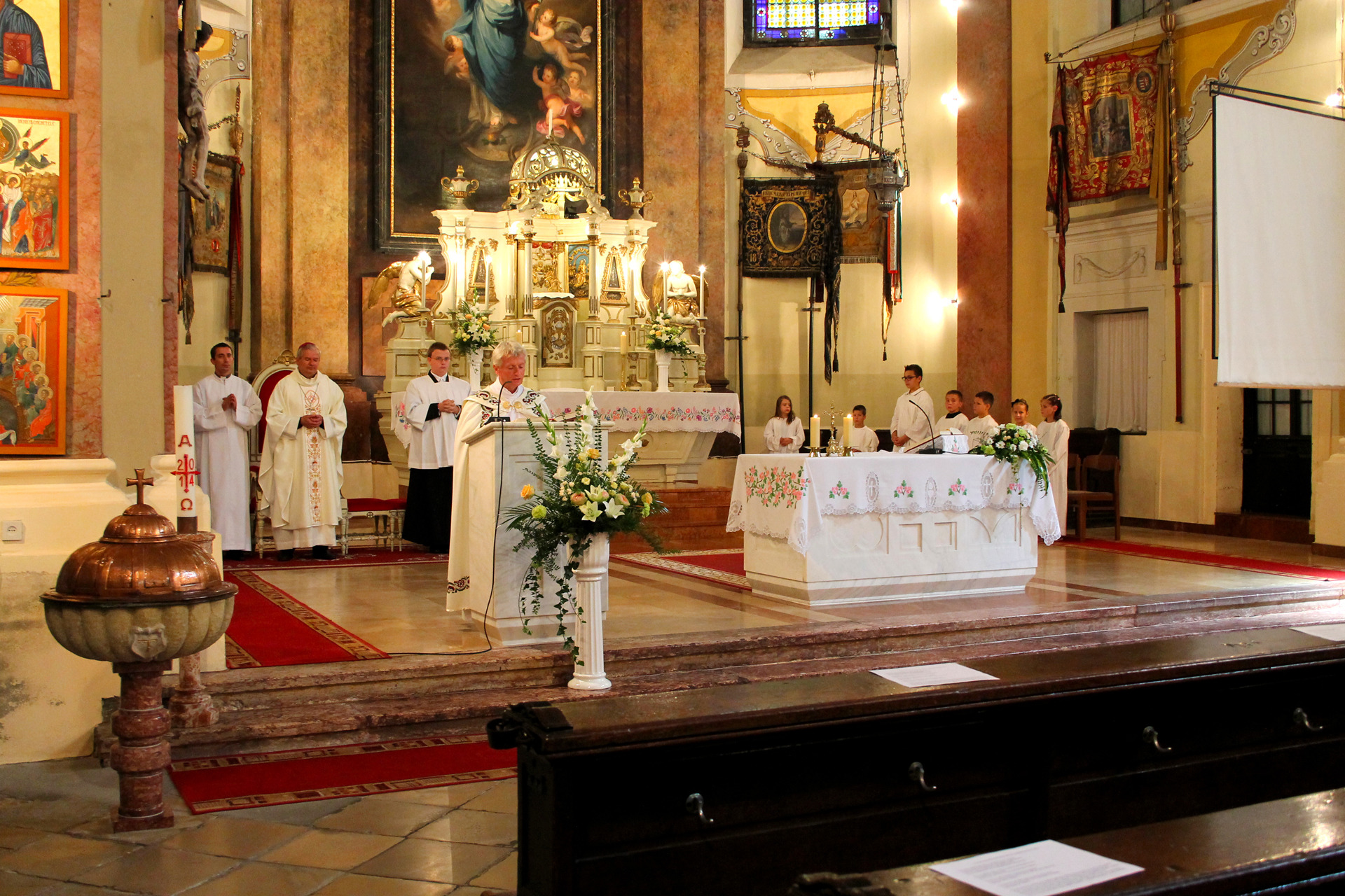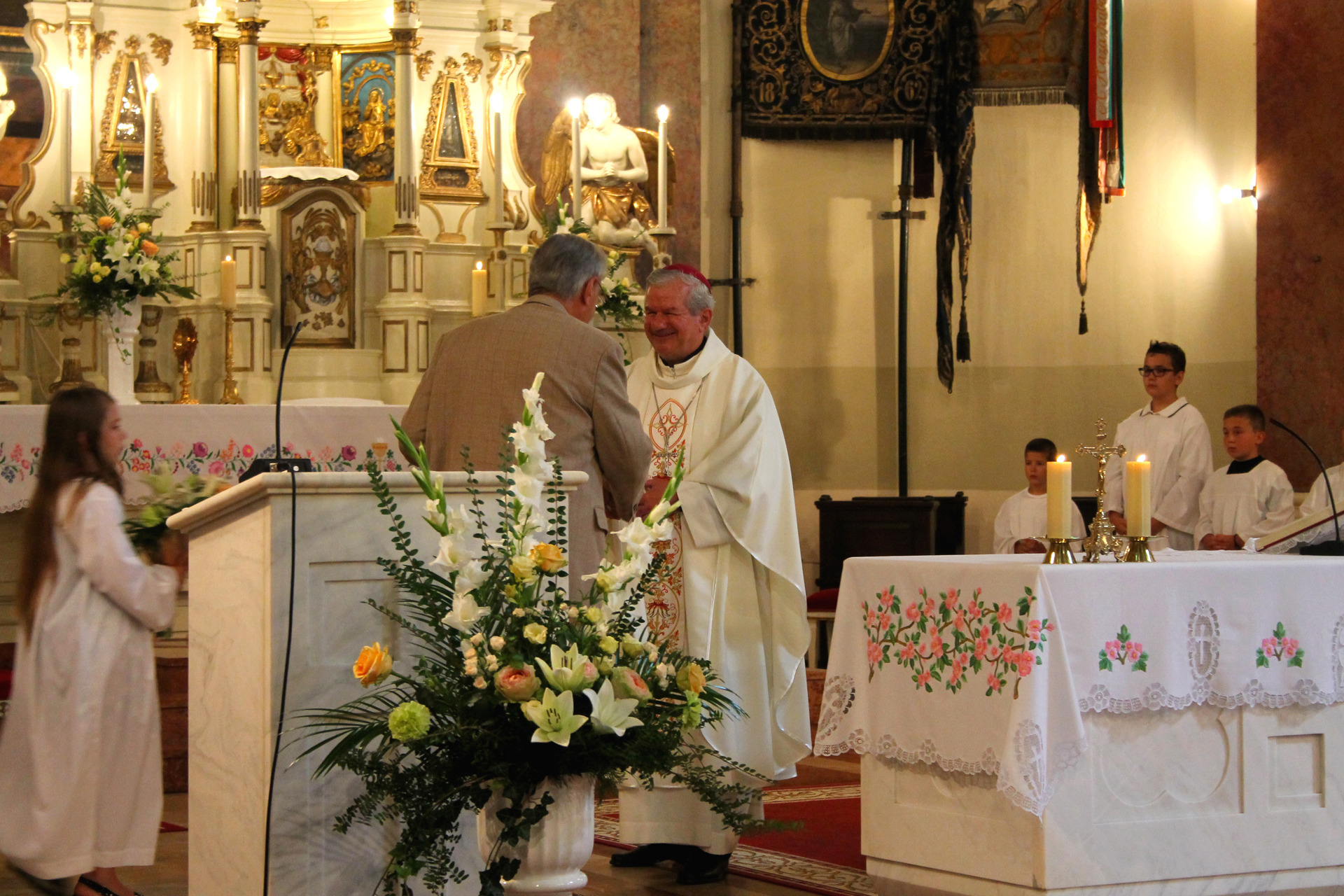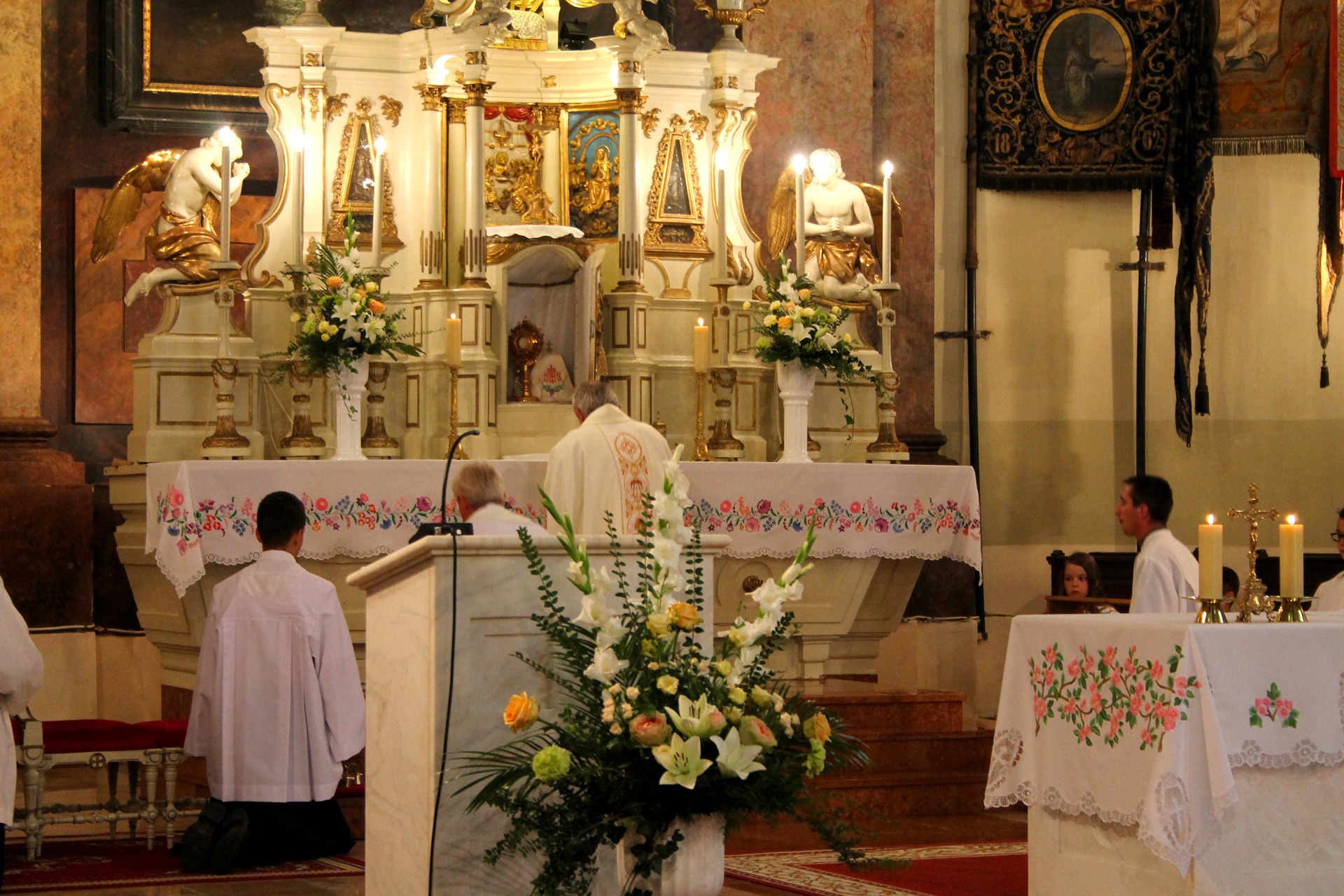 A Gyulai Nádi Boldogasszony templom nagybúcsúján, a bevonuló miséző püspök és kísérete először a Nádi Boldogasszony kegyoltár elé járult, majd a főoltárhoz lépett és a Szűzanyát ábrázoló óriási főoltárkép előtt tartotta meg az ünnepi szentmisét, amelyen hívők és zarándokok – ez alkalommal – elhunyt szeretteikért imádkoztak.