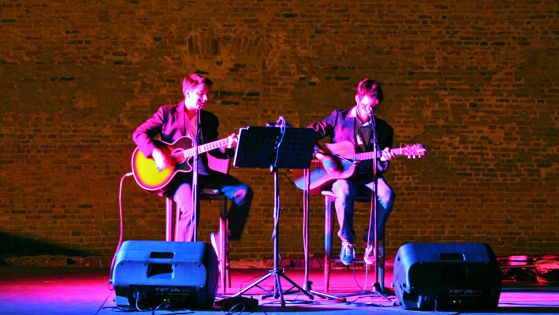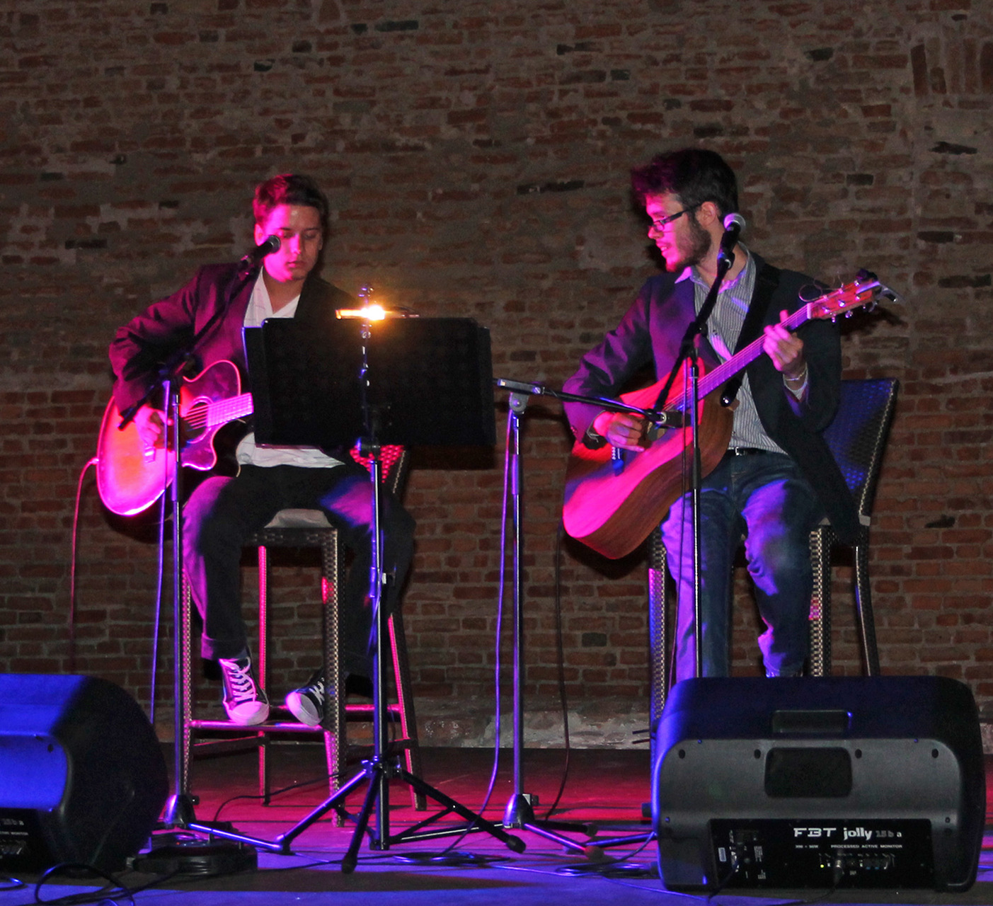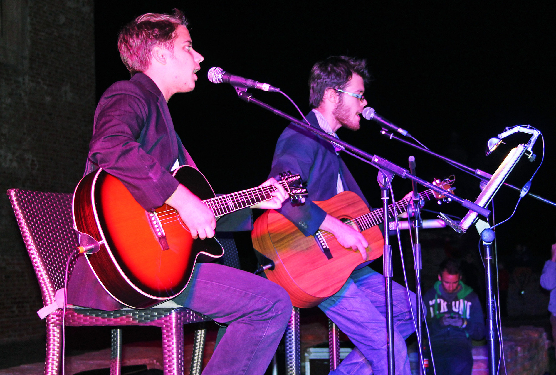 Kölcsey Szabolcs (gitár, ének) és Varga Ádám (ének, gitár) duója Békéscsabáról érkezett Gyulára. A formáció 2010 ősze óta létezik, ám a fiúk korábban más bandákban is pengették már együtt a húrokat. Produkciójukban két gitár és két énekhang változatos együttmozgásának lehettünk fültanúi. Az ifjú zenészek bizonyos dalokat duettben adtak elő, ám leginkább a főénekes-vokalista felállás jellemezte koncertjüket, mely során a srácok egymást váltogatva töltötték be az énekesszerepeket. Varga Ádám, lévén a BéKSZI Trefort Ágoston Fiúkórusának tagja, főként énekhangjával próbálta elkápráztatni a közönséget. Kölcsey Szabolcs, könnyűzenei tanulmányaiból és több éves gitárgyakorlatából kifolyólag, elsősorban a húrokon mutatványozva, virtuóz szólóival szórakoztatta a hallgatóságot - sőt a produkciót színesítvén, néhány dal erejéig egy igazi öthúros bendzsón kísérte zenésztársát.