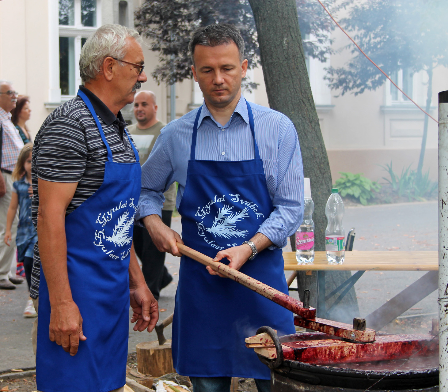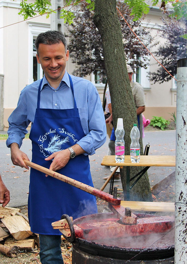 A köszöntőket és a megnyitót követően városunk vezetője, dr. Görgényi Ernő is csatlakozott a szilvalekvárfőző stábhoz, mitöbb kavarófát ragadott, hogy maga is hozzájárulhasson az idei gyümölcsíz zamatához, és néhány jól irányzott mozdulattal még „édesebbé" tegye a 2014-es németvárosi szilvalekvárt.