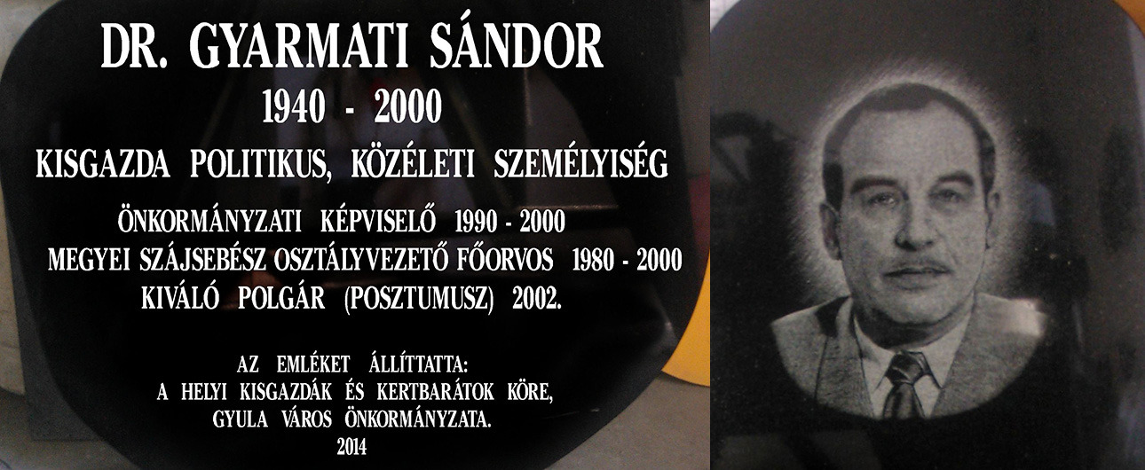 Dr. Gyarmati Sándor kiváló polgár, volt önkormányzati képviselő tiszteletére emléktáblát avat és megemlékezést tart Gyula Város Önkormányzata, a Gyulai Gazda és Polgári Egyesület és a Hagyományőrző Gazda- és Kertbarát Kör szeptember 25-én, csütörtökön 17 órakor a gyulai Újvároson, a Kerecsényi utca és a Régitemető utca találkozásánál lévő téren.