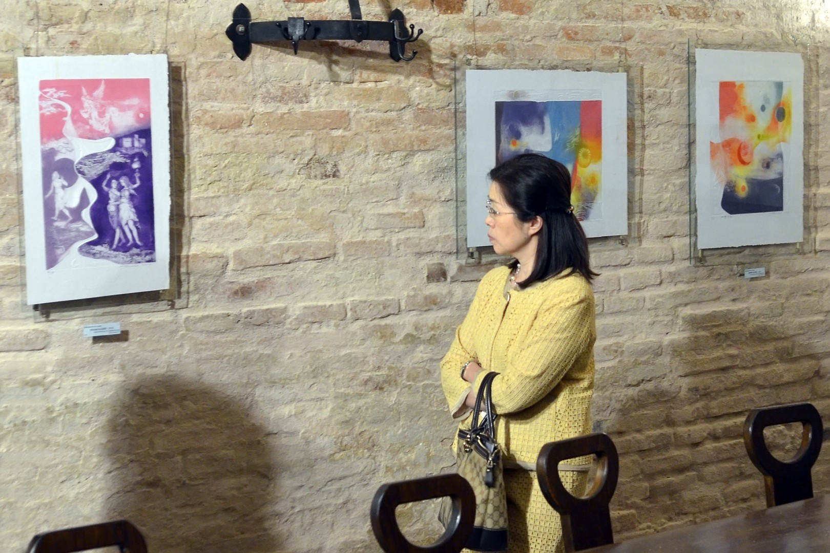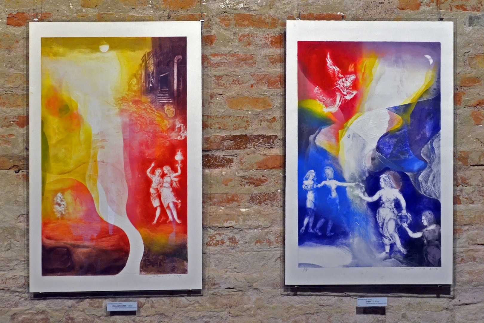 – A több rétegben nyomott, különféle színek áttetszők, de mélyek. Sejtelmesek, de nagyon erősek is egyben. Az ilyen színekkel megjelenített nap, hold, csillagok, hegyek világa, a naplemente és múló égi jelenségek megragadása a természet szépségét, múlékonyságát és állandóságát, a tapintható érzéseket, a levegő meleg vagy hideg hőérzetét idézik elő a szemlélőben – hangzott el a beszédben.
