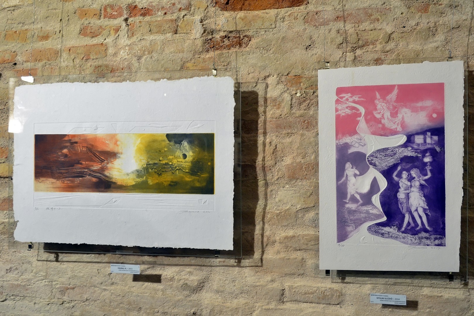 Dr. Mecsi Beatrix hangsúlyozta: a művész nem kész alapanyagokat használ, hanem mindent maga állít elő kézműves technikával. A képek alapját adó, saját maga által merített papírt német öntési módszerrel készíti: a felesleges papírokat, régi műveinek kereteit, paszpartuit összeturmixolja, és az ezekből nyert papírpépből önti újjá műveit. A sokszorosítógrafika széles palettájáról az aquatinta eljárást választotta, mely a rézmetszet technikájának egy tusfestészeti hatásra törekvő speciális fajtája.