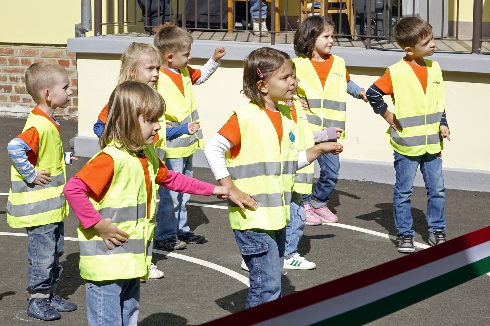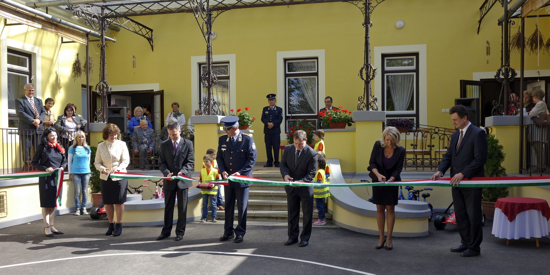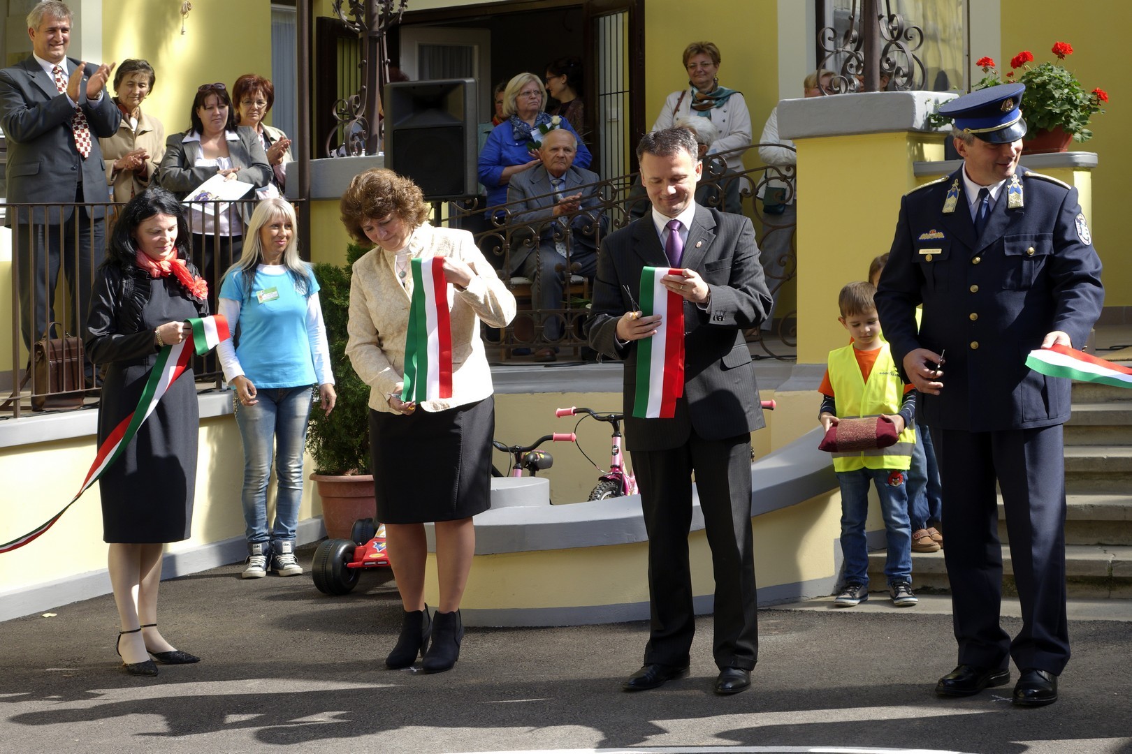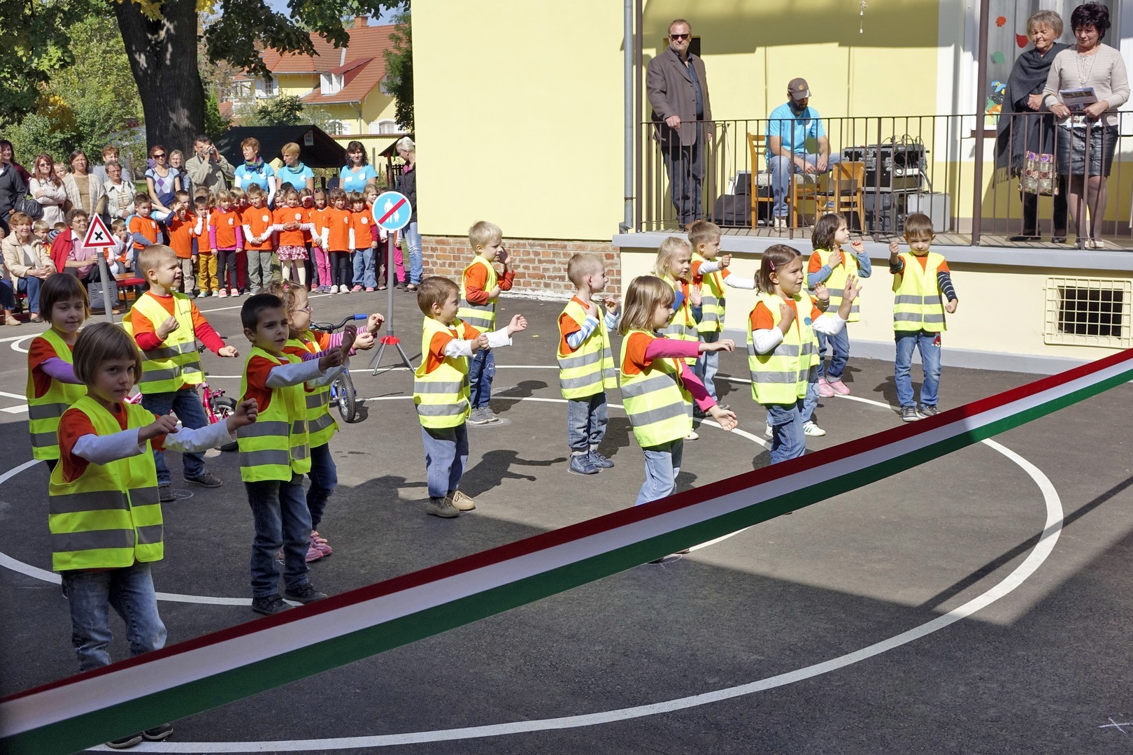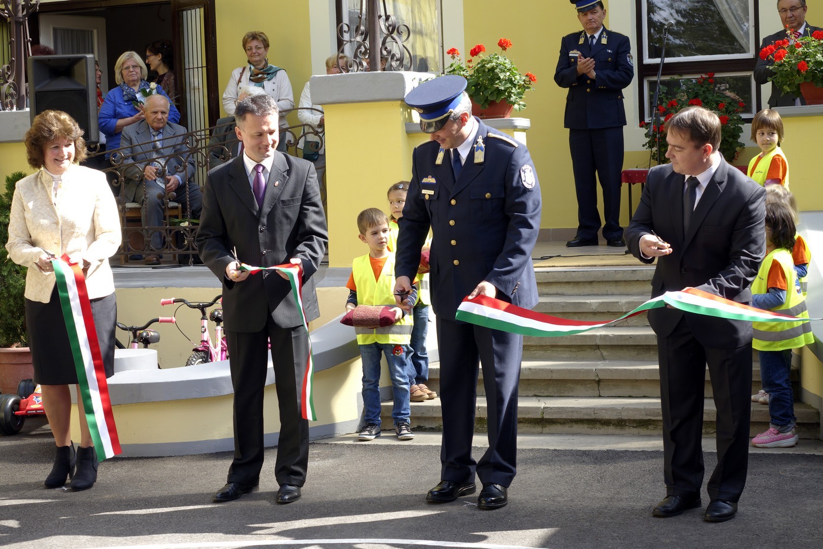 A felújított játszóparkot – a gyakorlópálya egyik szélén elhelyezett szalag átvágásával – dr. Görgényi Ernő polgármester, Kónya István önkormányzati képviselő, Kolysza Zoltán rendőralezredes, Szilágyiné Solymosi Mária intézményvezető és dr. Becseiné Lock Gabriella tagintézmény-vezető adta át.