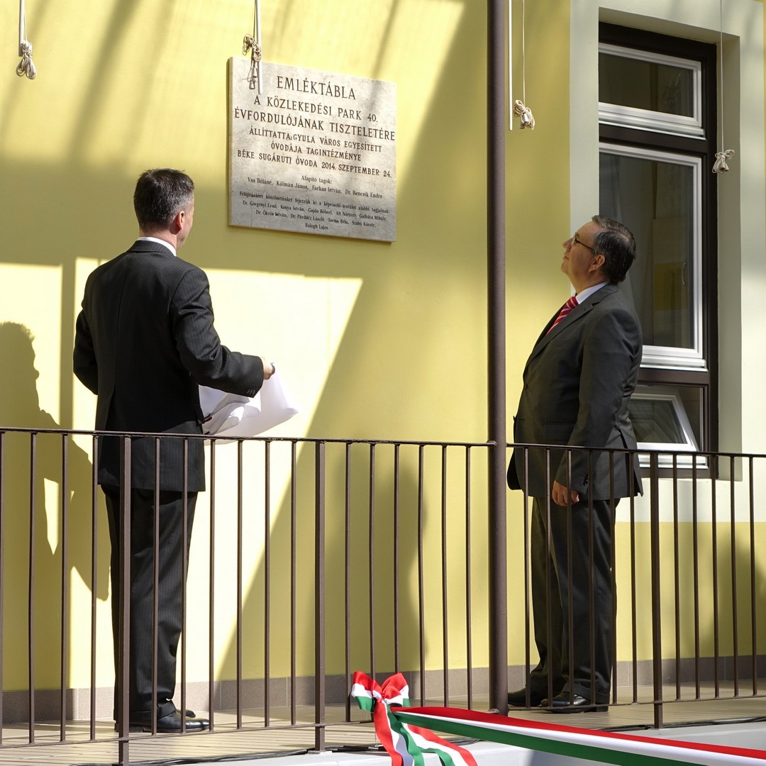 Az ünnepi átadón dr. Becseiné Lock Gabriella, Gyula Város Egyesített Óvodájának vezetőhelyettese, a Béke Sugárúti Óvoda tagintézmény-vezetője köszöntötte a jelenlévőket. A tagintézmény-vezető elmondta, hogy az elhatározás, miszerint erre a kerek évfordulóra a közlekedési játszóparkot teljes mértékben fel kell újítani, már három évvel ezelőtt megszületett. Elkötelezettségük méltán volt erős, hiszen 40 évvel ezelőtt a Béke Sugárúti Óvoda volt az Gyula városában, illetve a megyében, amely felvállalta az innovatív feladatot, közlekedési játszóparkot alakított ki, bázisóvodaként működött, és azóta is kiemelt pedagógiai területét képezi a biztonságos közlekedésre nevelés.