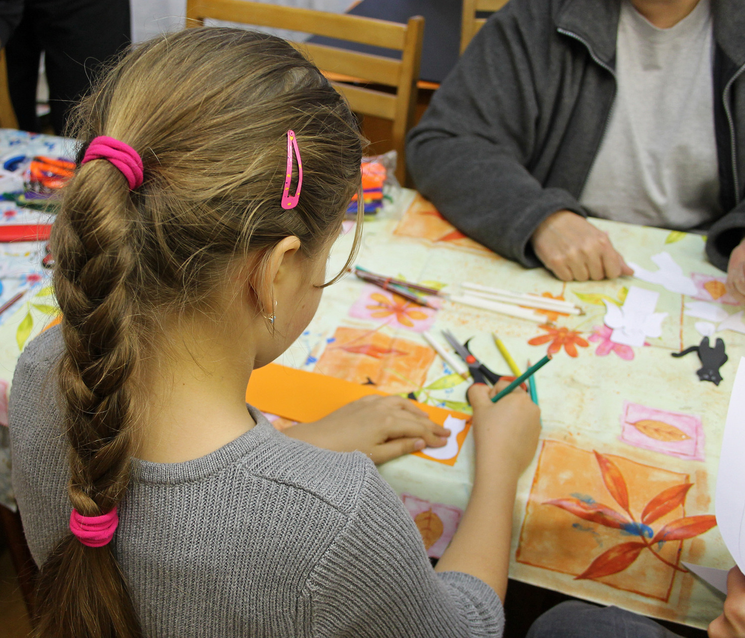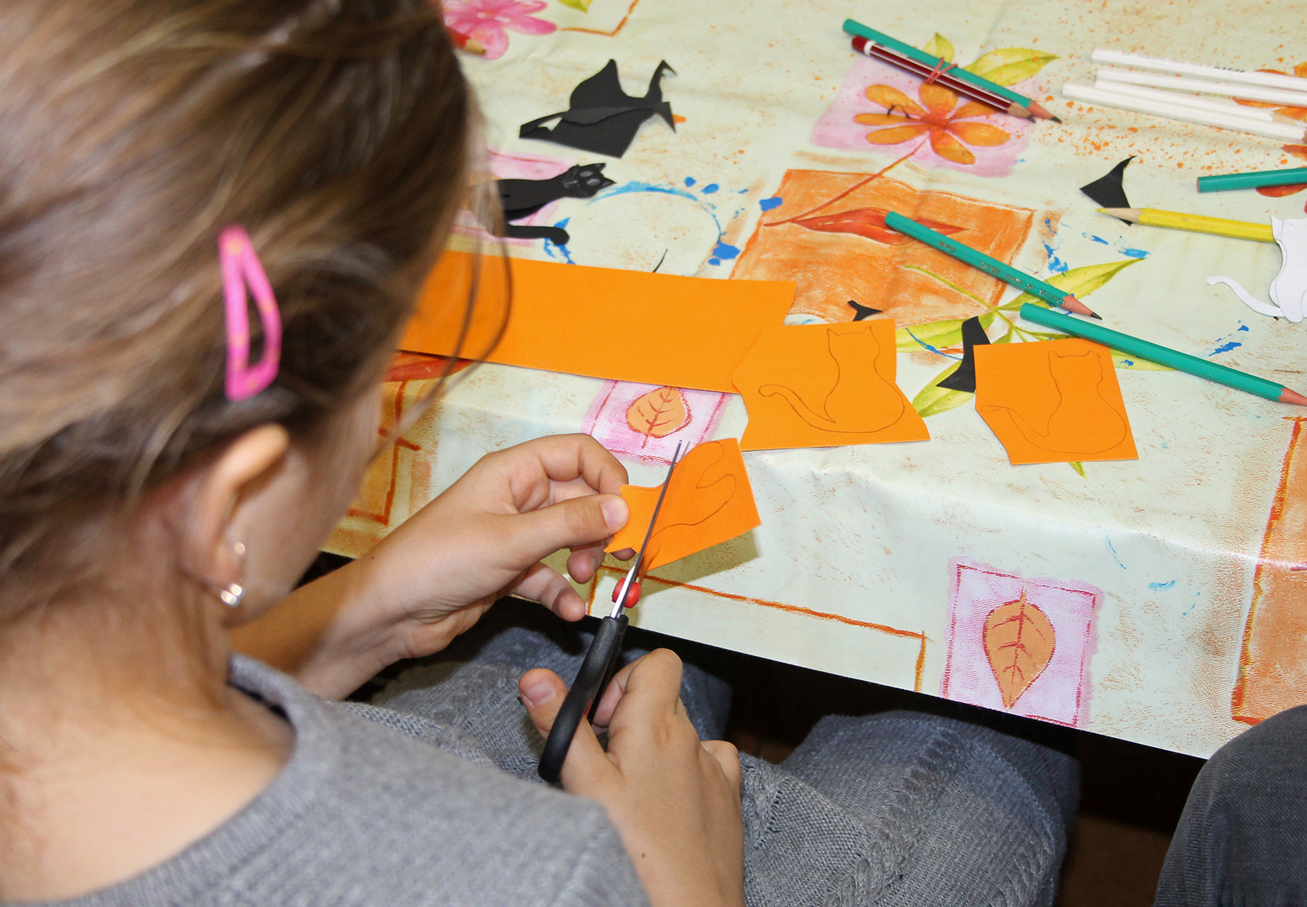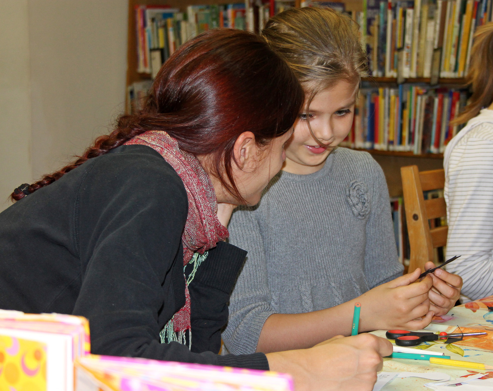 Szabó Csaba, a Mi Egy Másért Egyesület tagja, valamint Turi Rita a Gyulai Ifjúsági Központ munkatársa bűbájos kézügyességfejlesztő feladattal kedveskedtek a kicsiknek. A könyvek mellett, a ceruza, az olló és a ragasztó is előkerülhetett. A felolvasások és zenei betétek alatt ugyanis az olvasókör témájához, azaz a boszorkányok világához kapcsolódó, különböző figurákat ábrázoló, színes papír könyvjelzőket készítettek a gyermekek – és ha már boszis volt a téma, nem maradhatott el a bibircsókos banya, a holló és a fekete macska alakja sem.