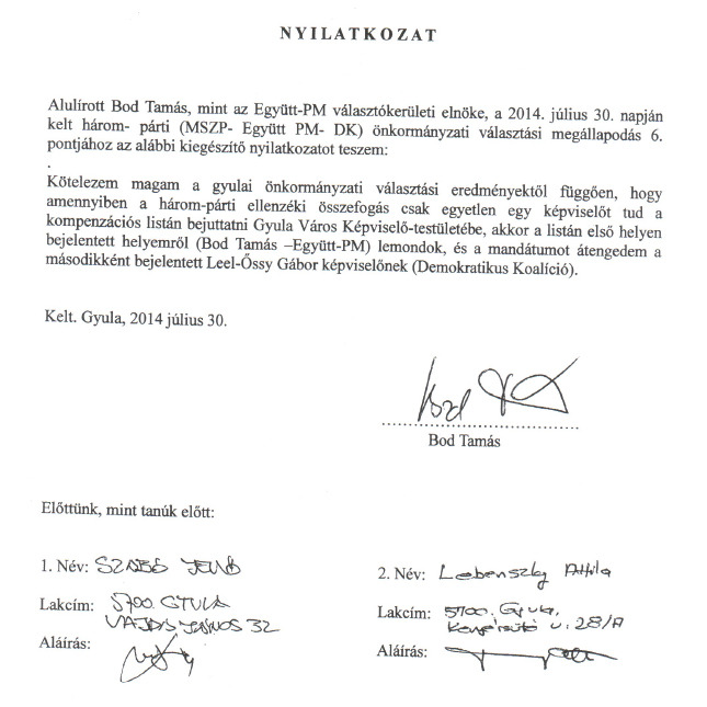 Nyilvánosságra került Bod Tamás (Együtt 2014-Korszakváltók Pártja) nyilatkozata, amelyet 2014. június hó 30. napján tett Szabó Jenő (volt a gyulai MSZP elnökségi tagja, a párt alpolgármestere, ma az Együtt 2014-Korszakváltók Pártját erősíti) és Lebenszky Attila (volt az SZDSZ polgármestere, ma a DK politikusa) mint tanúk előtt. Ebben arra kötelezte magát az Együtt-PM politikusa, hogy lemond első helyéről a kompenzációs listán, s mandátumát átengedi Leel-Őssy Gábornak, a Demokratikus Koalíció gyulai elnökének, amennyiben a hárompárti összefogás csak egyetlenegy képviselőt tud kompenzációs listáról a gyulai testületbe juttatni. Márpedig éppen ez a helyzet állt elő október 12-én. Ennek ellenére Gyula Város Képviselő-testületének mai alakuló ülésén Bod Tamás vette át a baloldal által besöpört egyetlen mandátumhoz járó képviselői megbízólevelet, s tette le az öt évre szóló képviselői esküt.