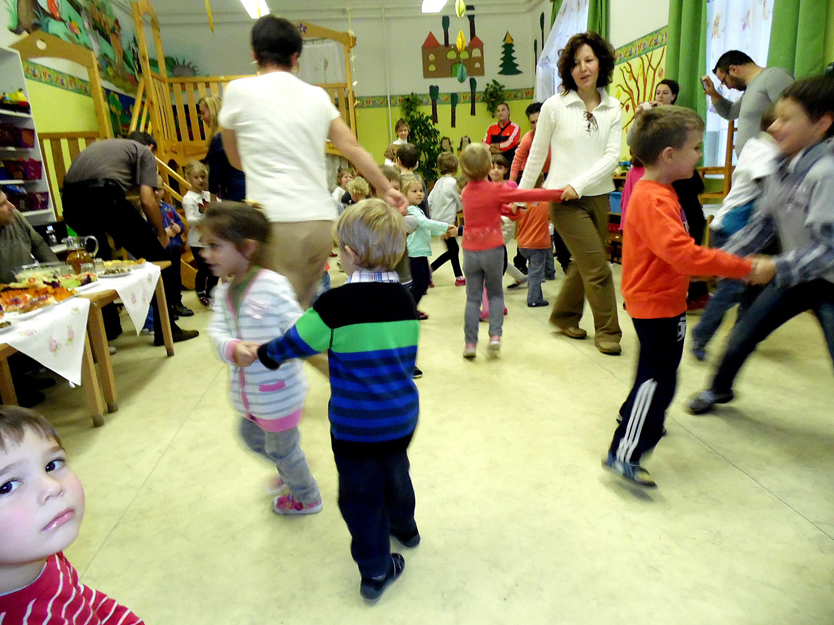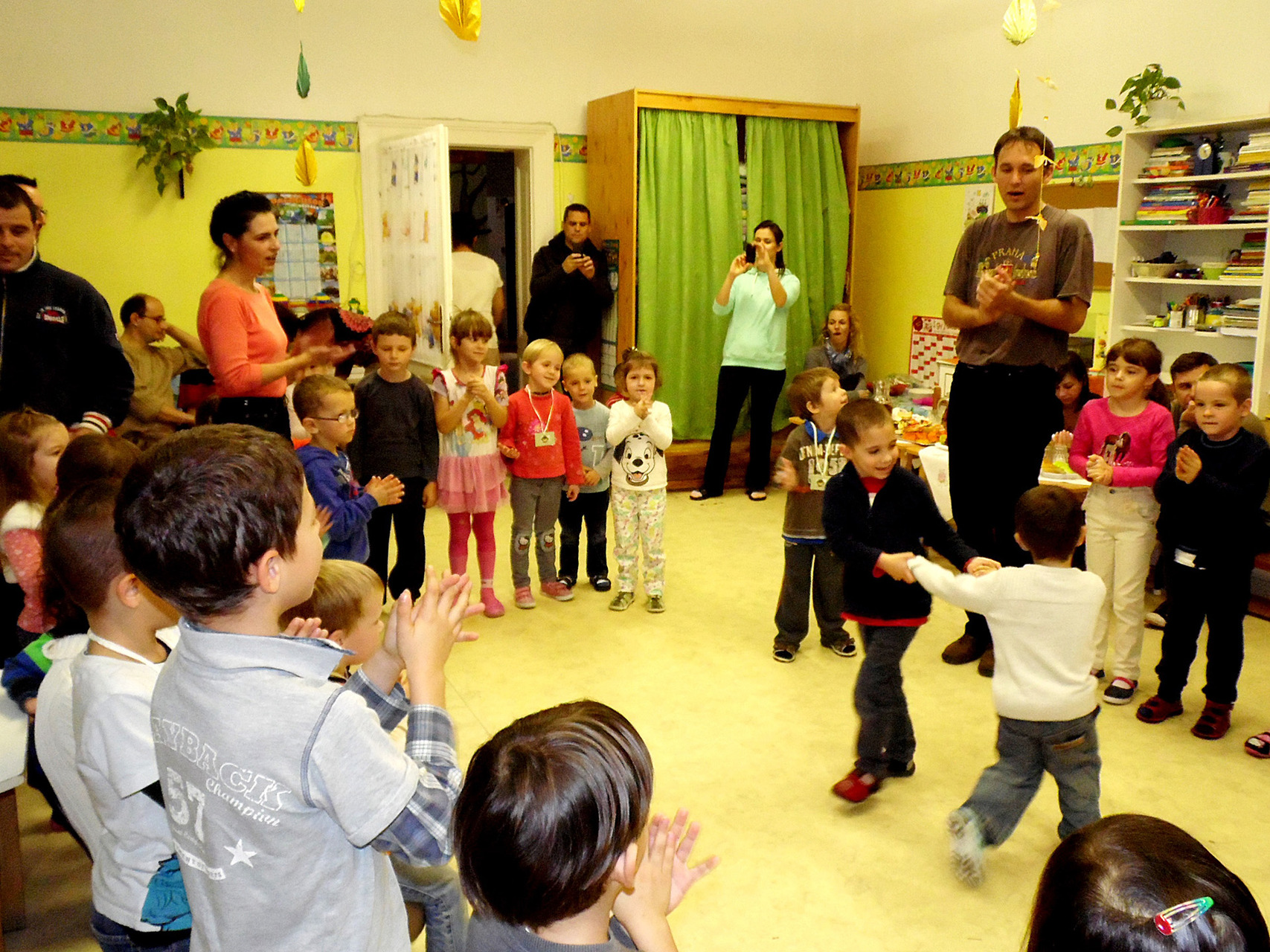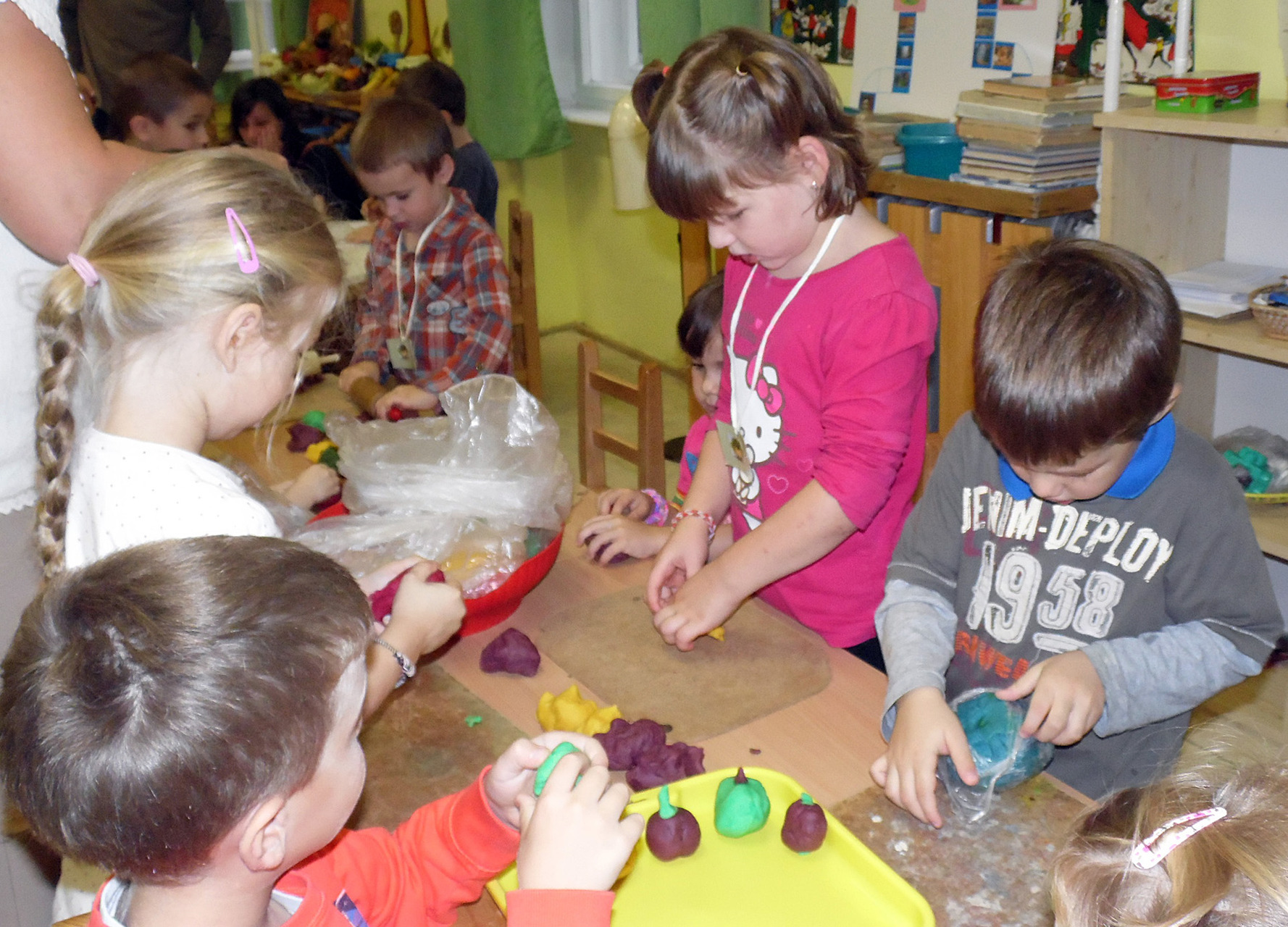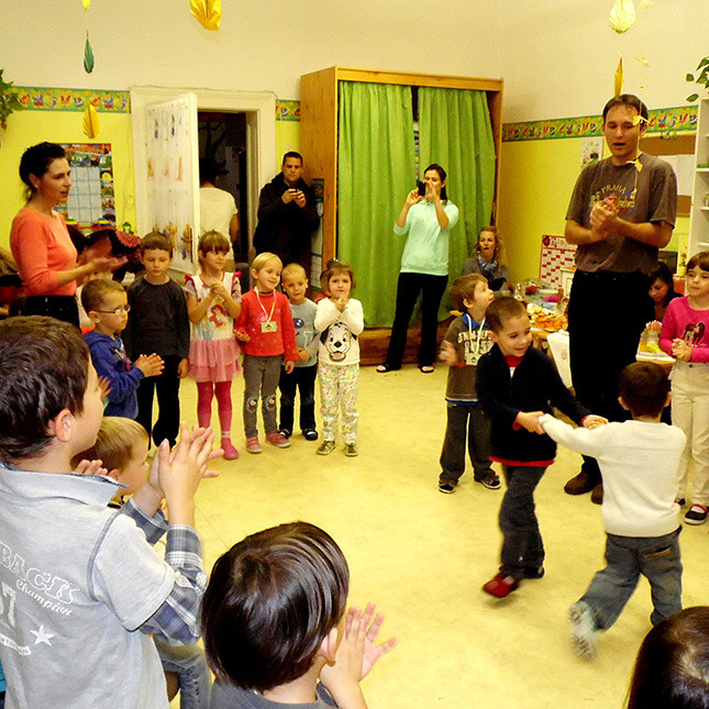 Mivel az őszi szüret a néphagyományok megismertetéséhez is remek alkalmat teremt, szüreti mulatságként Pluhárné Petneházi Enikő és Horváth Péter tartott a gyerekeknek bő egy órás énekes-táncos foglalkozást. Mindeközben pedig párhuzamos tevékenységként a kicsik és szüleik még gyurmázhattak, kézműveskedhettek is, természetesen gyümölcsök és zöldségek megformázásával.
