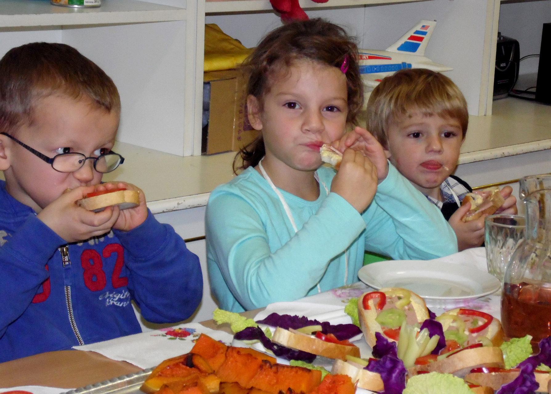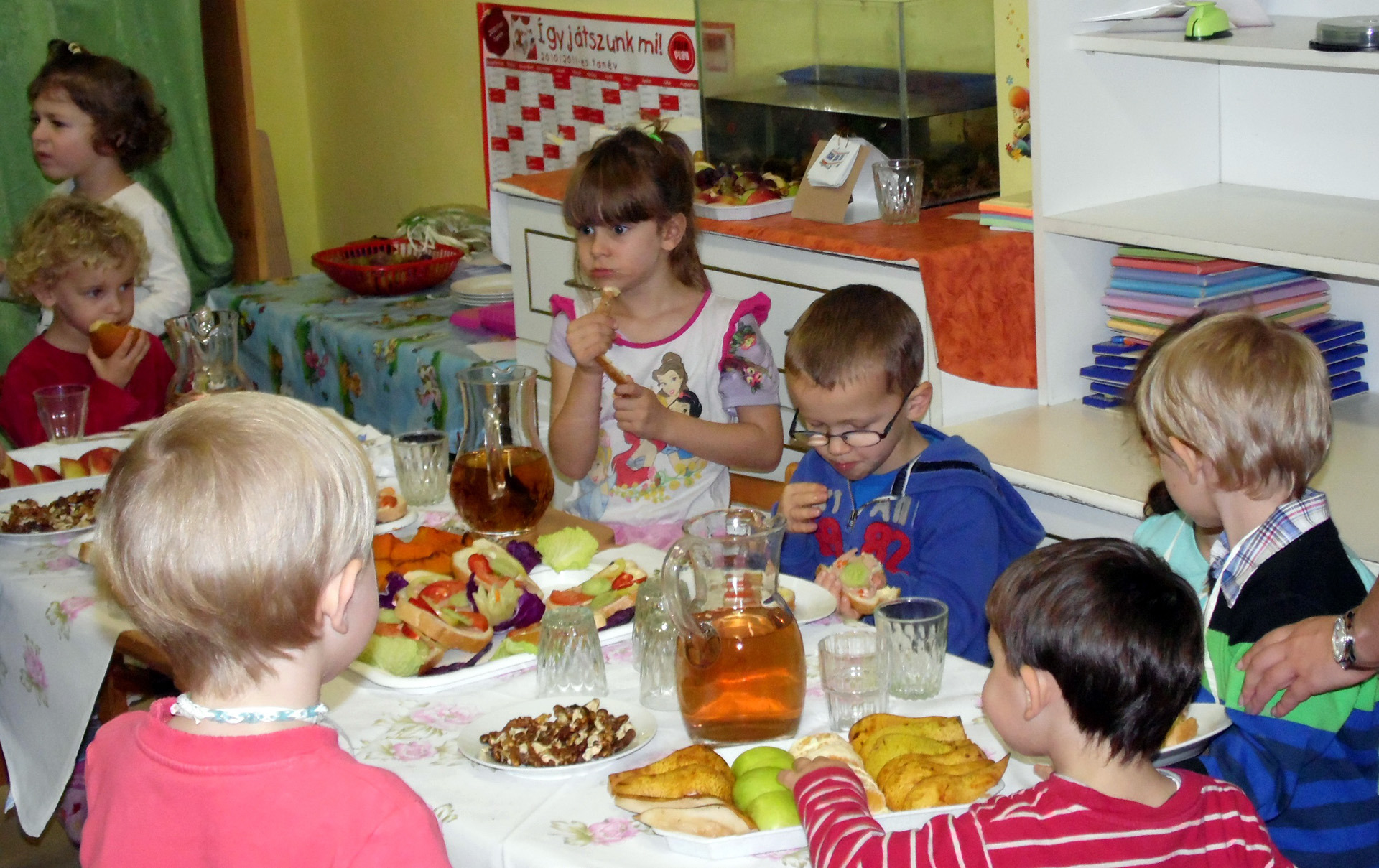 Mivel óvodás korban az érzékszervek működtetése kiemelten fontos, a kicsik nem csak megtapogatják és megszagolják ezeket a vitamindús terméseket, hanem azok konyhai feldolgozásából is kiveszik a részüket. Erre a mostani alkalomra is ők tisztították meg és készítették el a gyümölcssalátát, káposztasalátát, préselték a szőlőt, itták a mustot és főzték a szilvalekvárt.