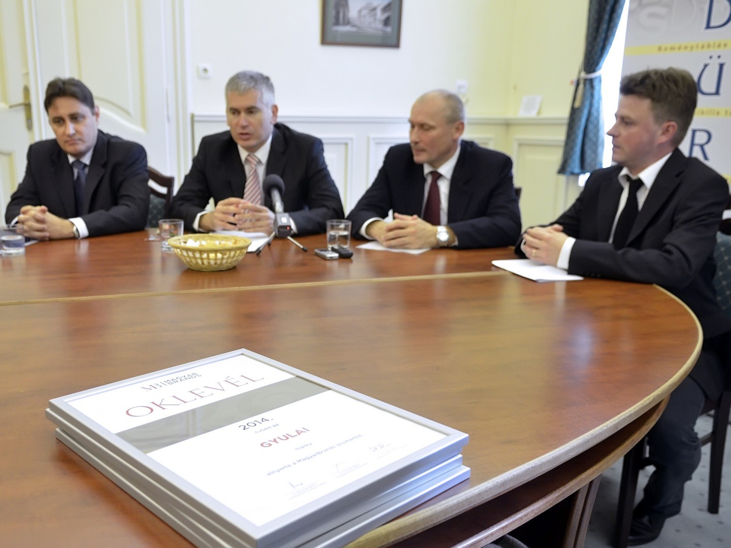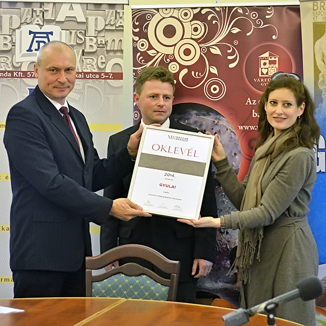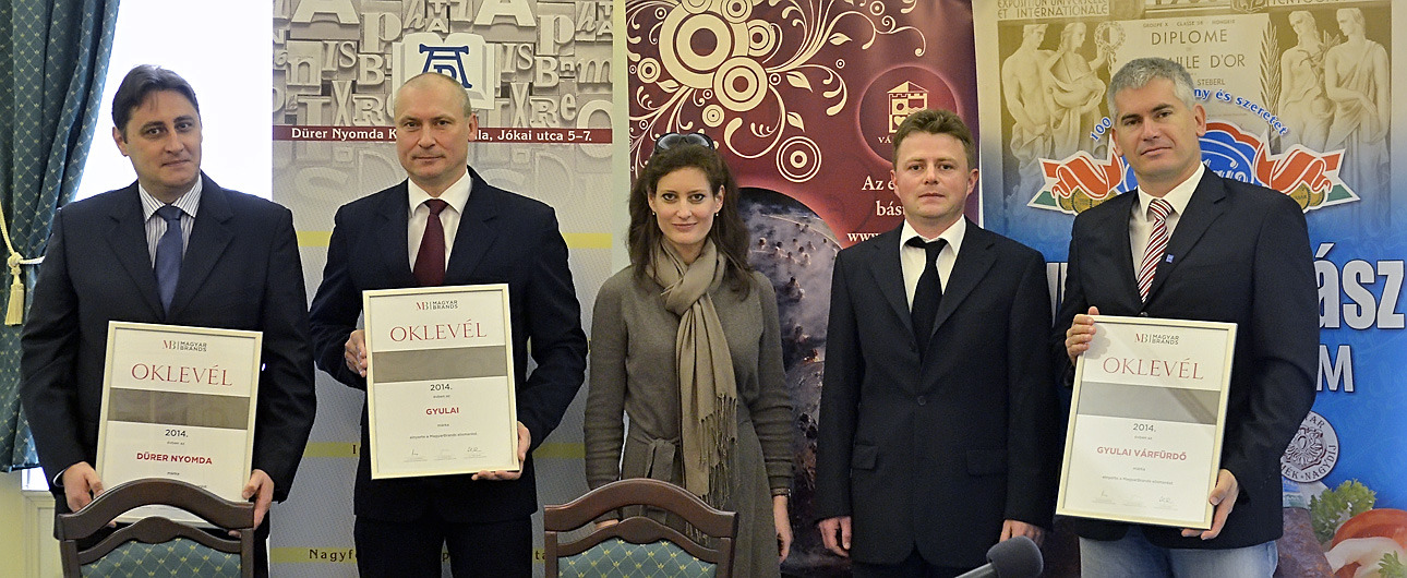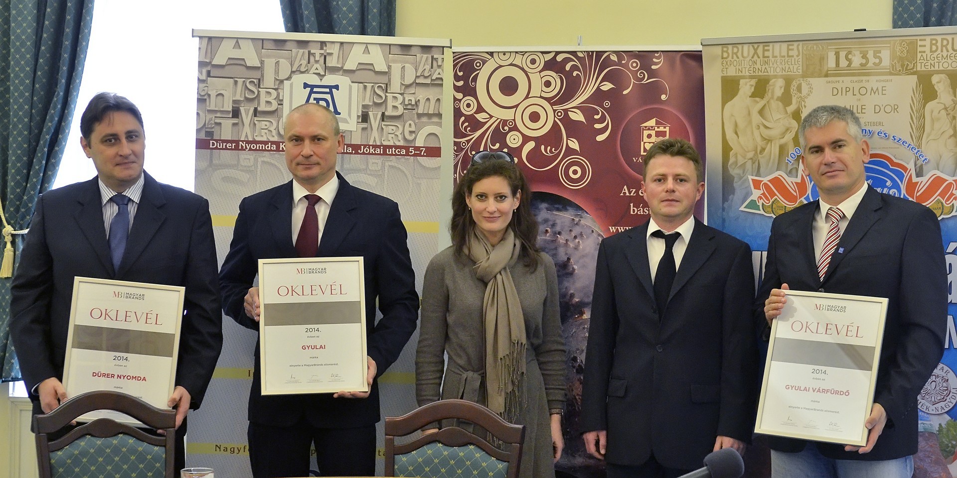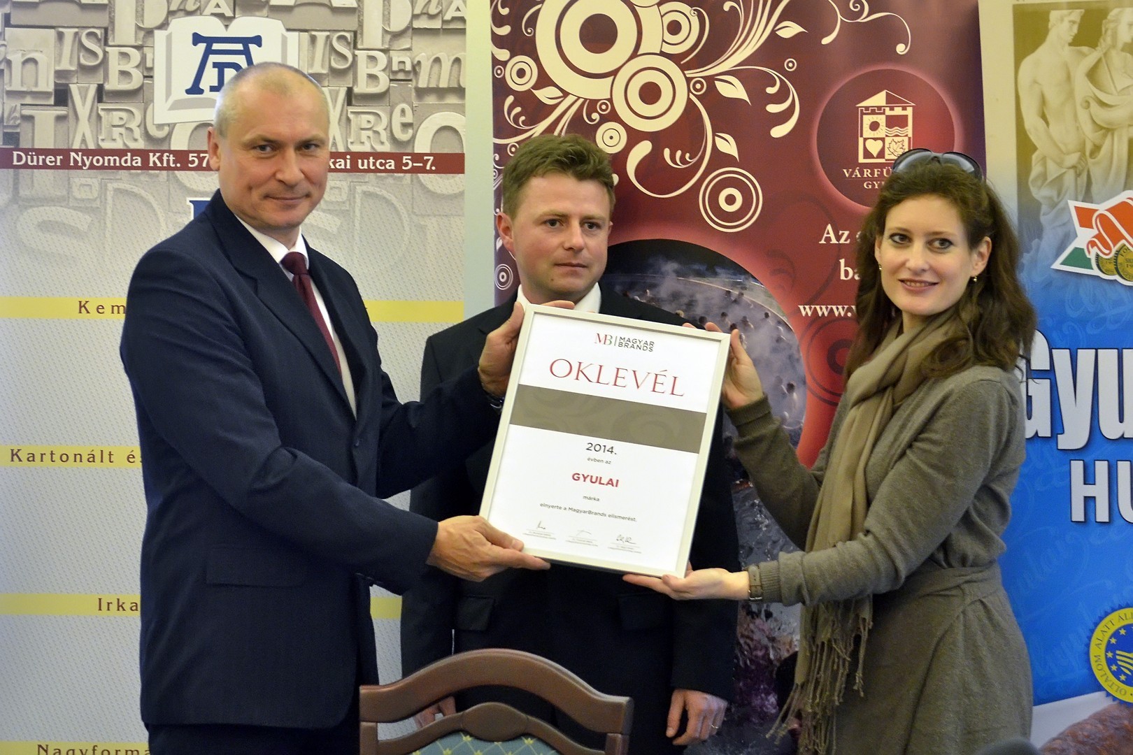 Három gyulai cég, a Gyulahús Kft., a Gyulai Várfürdő és a Dürer Nyomda vezetője vehette át a MagyarBrands-díjat hétfőn a városházán. Idén ötödik alkalommal díjazták az elismeréssel azokat a hazai márkákat, amelyek a magyar vállalkozások méltó képviselői lehetnek a határon túl is. A védjegy olyan értéket képvisel a hazai és a nemzetközi piacon, amely a vásárlók számára a megbízhatóságot és a minőséget tanúsítja.