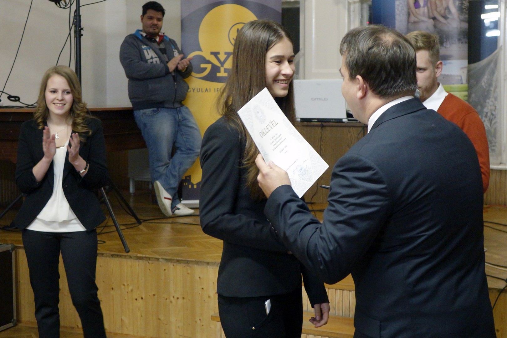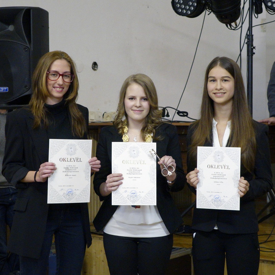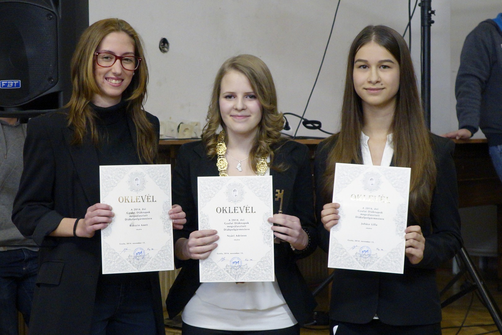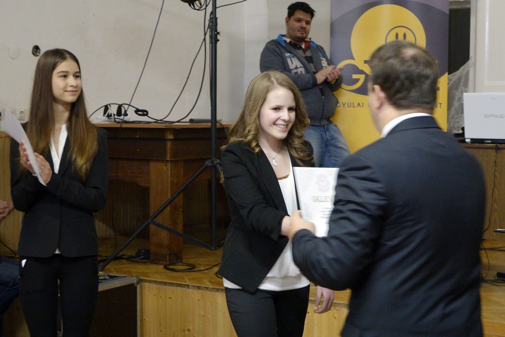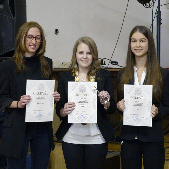 És végre elérkezett a várva várt eredményhirdetés! A választást egyértelmű fölénnyel Nyári Adrienn, a Nicolae Balcescu Román Gimnázium tanulója nyerte meg, így ő vehette át Kónya István alpolgármestertől a Gyula város címerével díszített láncot, valamint a város kulcsát. A 2014/2015-ös tanév diák-alpolgármesterei Juhász Lilla (Erkel Ferenc Gimnázium) és Rokszin Anett (Karácsonyi János Római Katolikus Gimnázium) lettek, akiknek egy-egy oklevelet nyújtott át az alpolgármester.