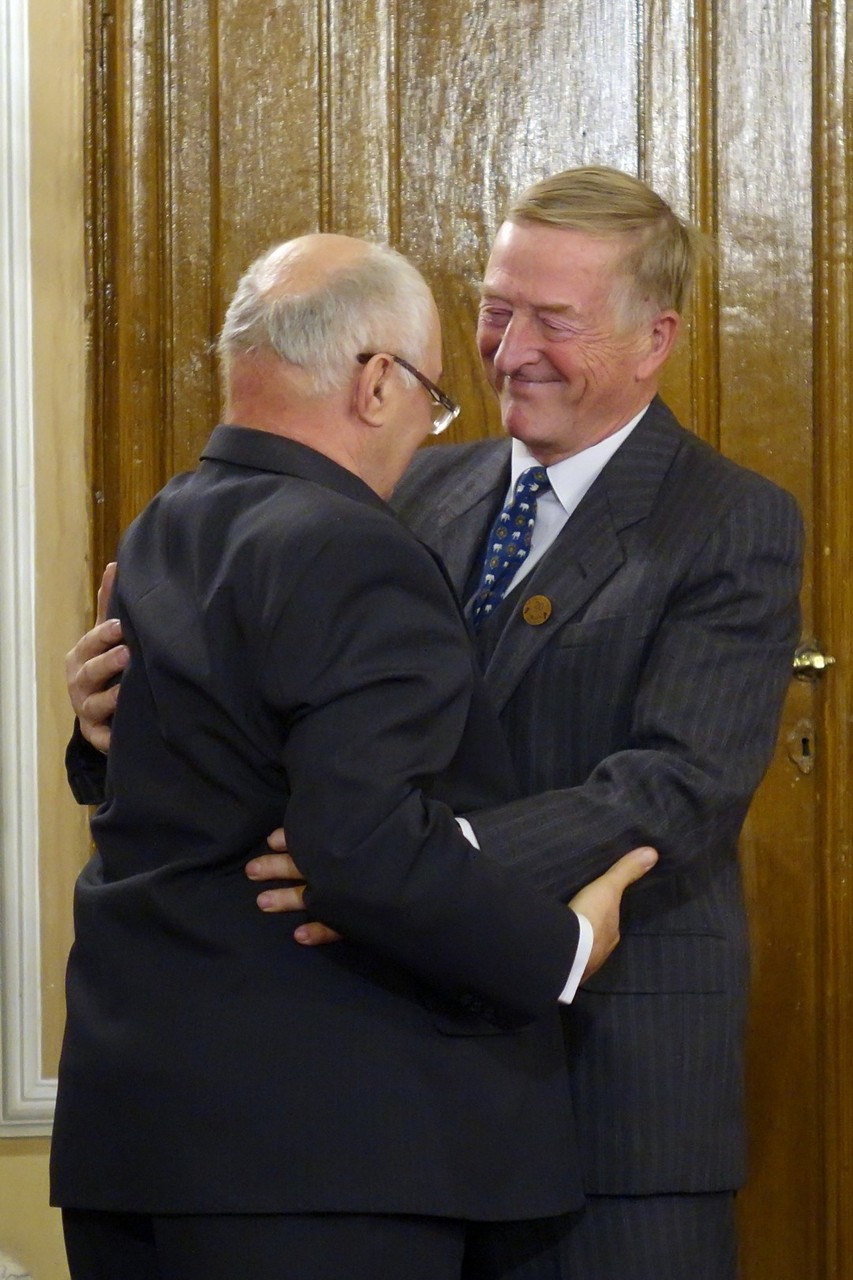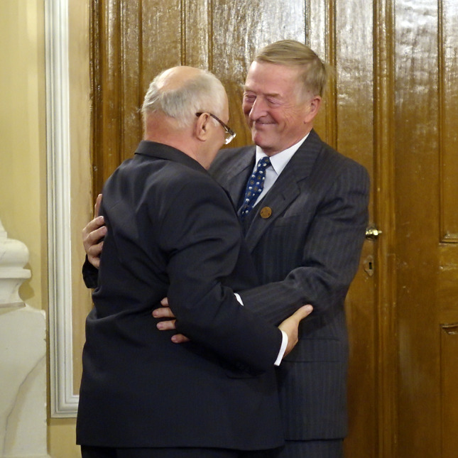 Cristian Moisescu egykori aradi városvezető azt mondta: a Kézfogások folytatásához két közösségre, két városra van szükség. Hangsúlyozta: a húsz évvel ezelőtt útjára indított együttműködési projekt a szereteten alapult. Arad volt polgármestere baráti öleléssel mondott köszönetet dr. Pocsay Gábornak.