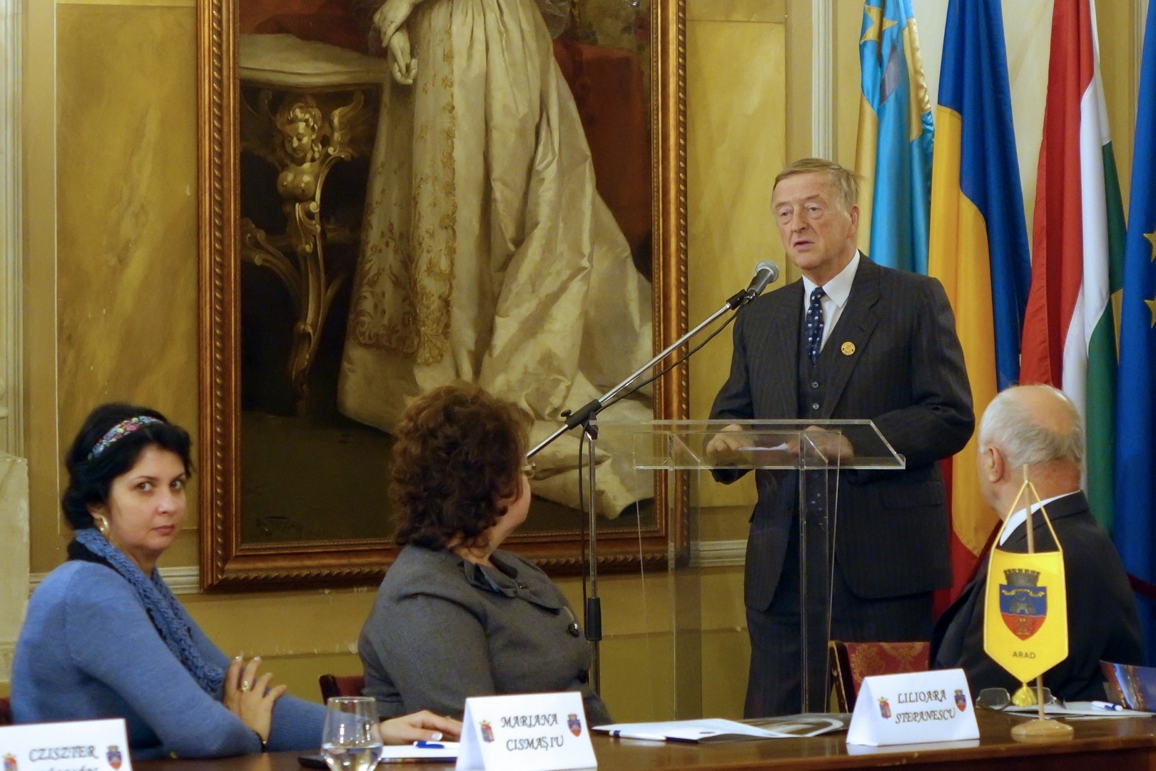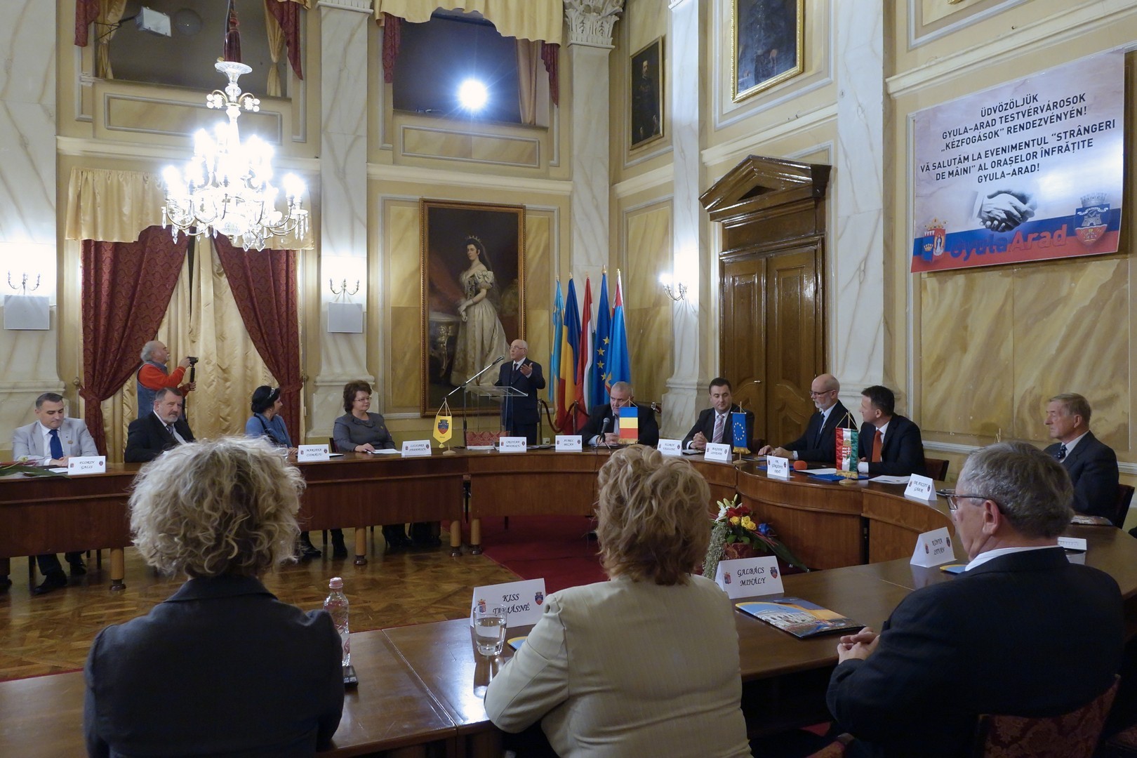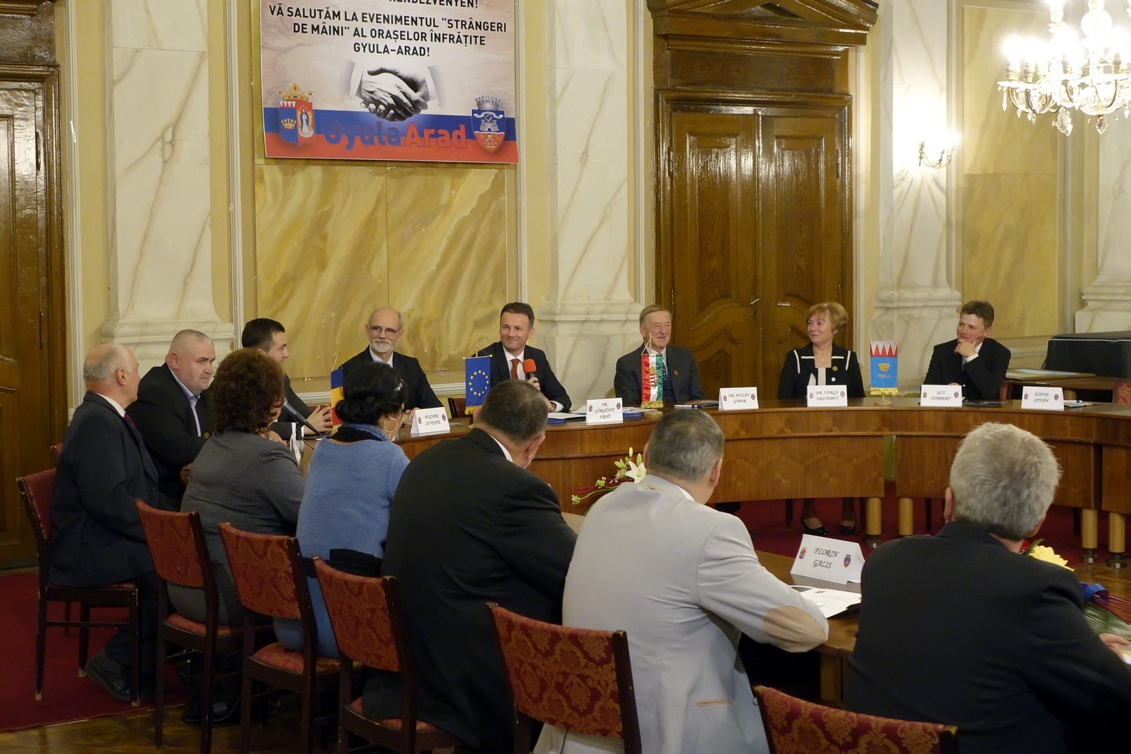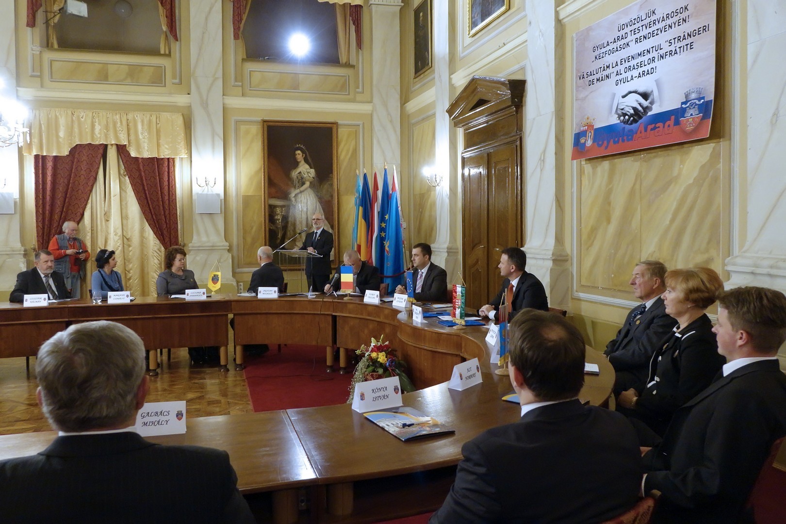 Dr. Görgényi Ernő kiemelte: a gyulai program iránt országosan is nagy volt az érdeklődés. Köszöntőjében felidézte: Cristian Moisescu, Arad és dr. Pocsay Gábor, Gyula egykori polgármestere egyebek mellett az Európa Tanács és a Konrad Adenauer Alapítvány megbízottja jelenlétében szignálta a testvérvárosi kapcsolatról szóló hivatalos dokumentumot 1994-ben.