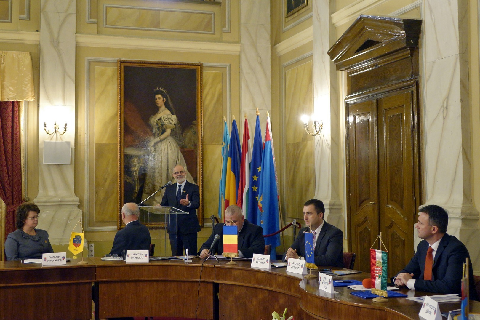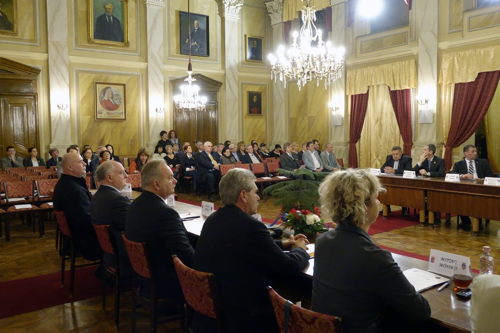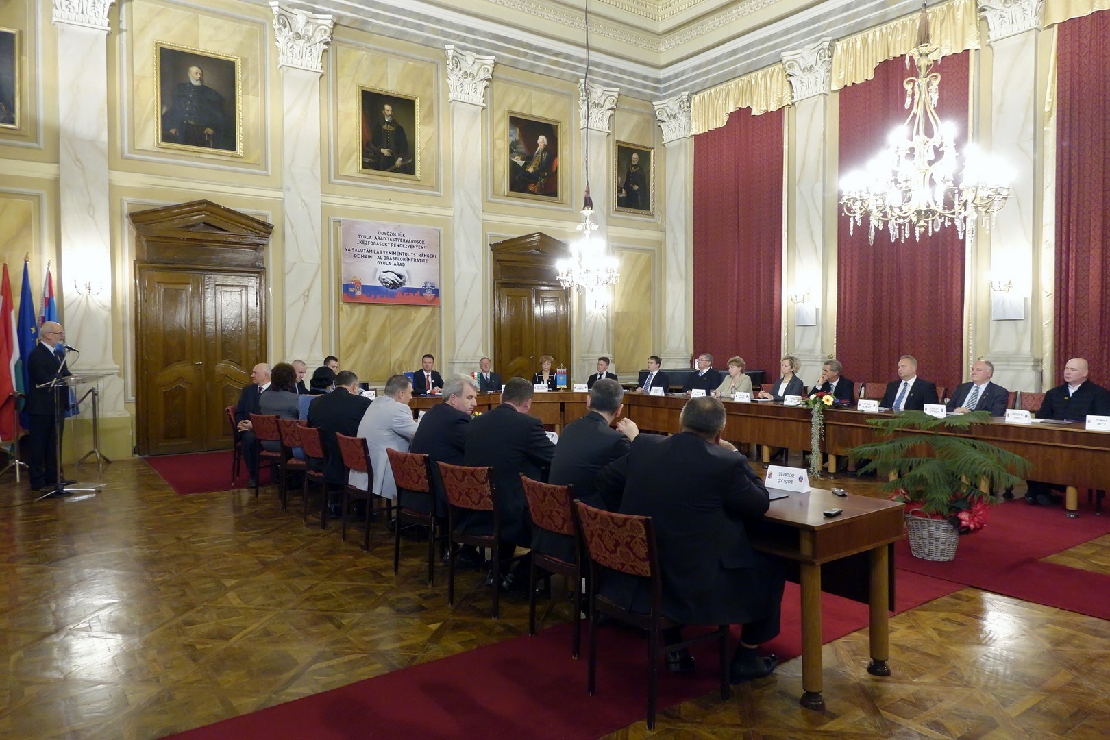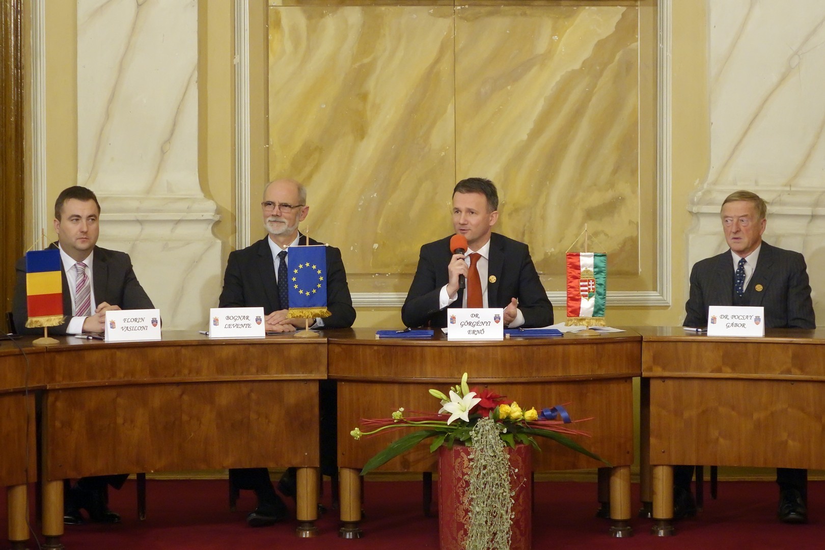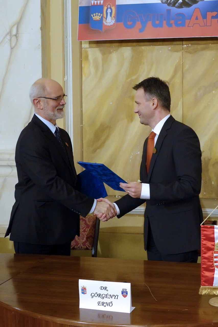 Dr. Görgényi Ernő kiemelte: a gyulai program iránt országosan is nagy volt az érdeklődés. Köszöntőjében felidézte: Cristian Moisescu, Arad és dr. Pocsay Gábor, Gyula egykori polgármestere egyebek mellett az Európa Tanács és a Konrad Adenauer Alapítvány megbízottja jelenlétében szignálta a testvérvárosi kapcsolatról szóló hivatalos dokumentumot 1994-ben.