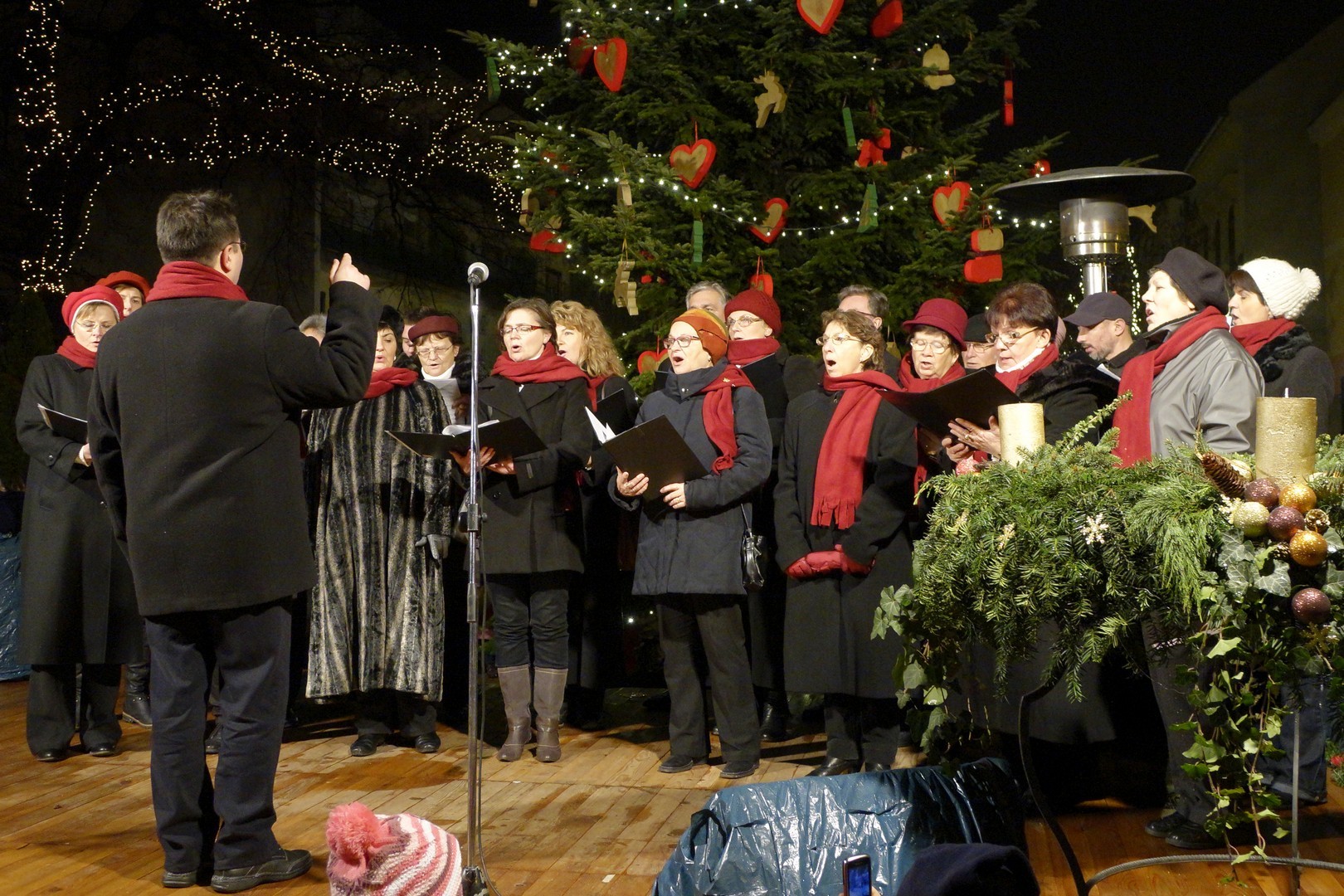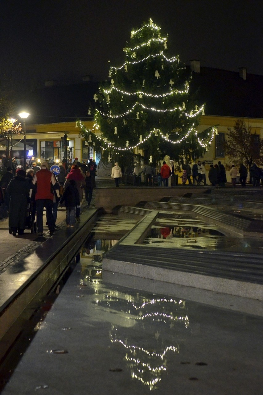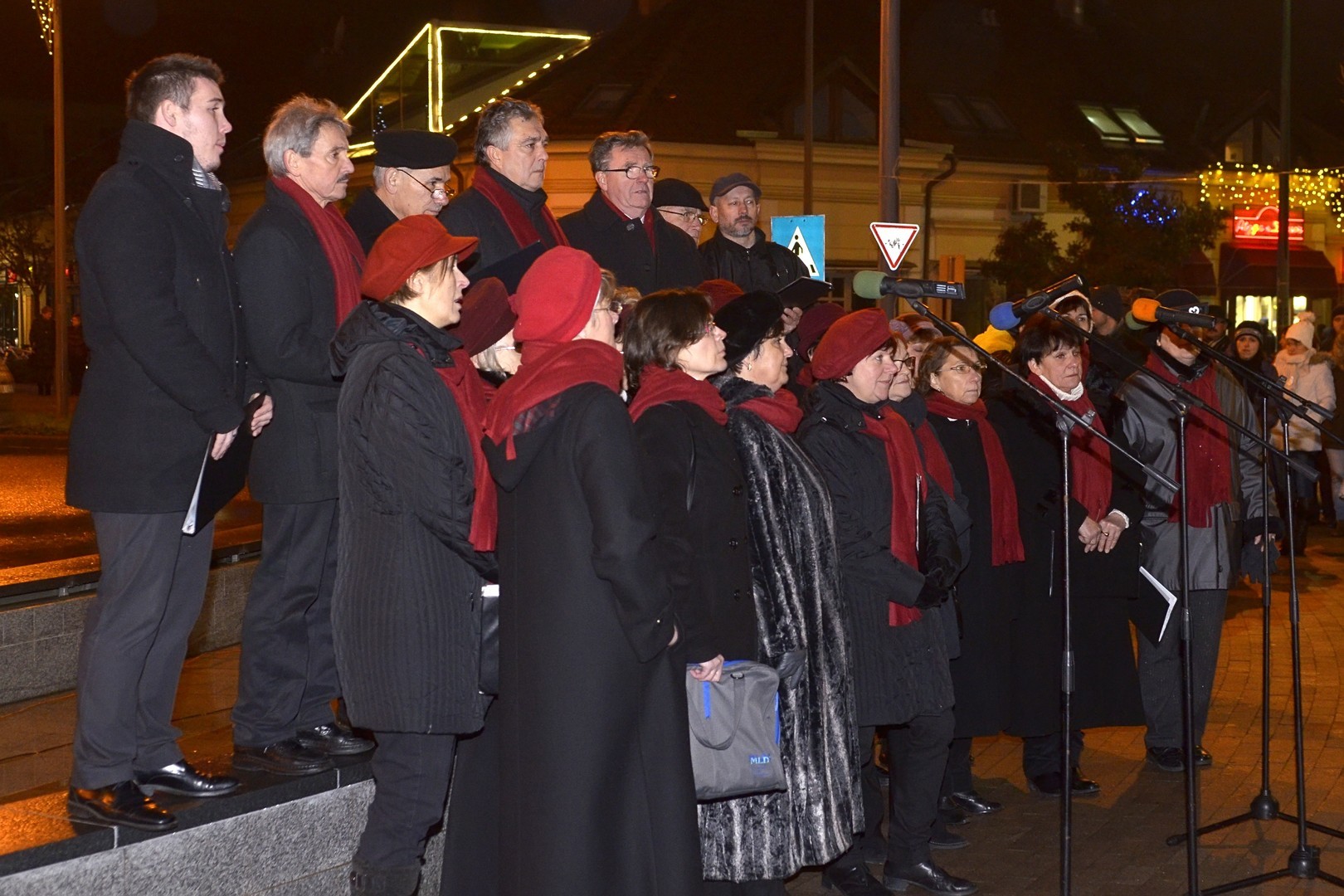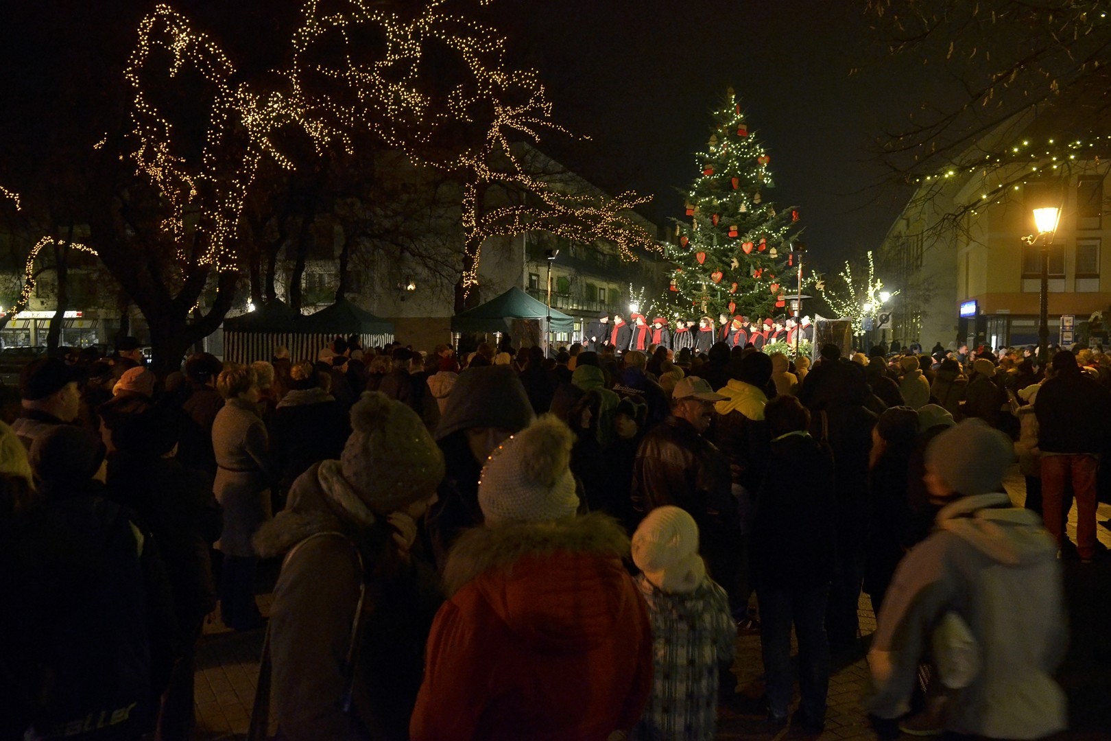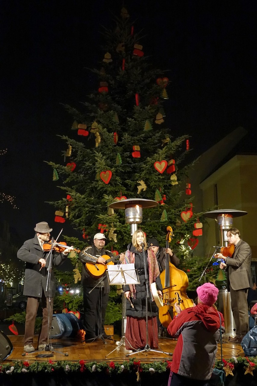 Az adventi ünnepség egy rövid műsor erejéig a Kossuth téri körforgalomnál folytatódott, ahol az Erkel Ferenc Vegyes Kar további dalokkal ajándékozta meg a közönséget, majd végül felvillant az első gyertyaláng a Japánkert Barátok Köre Egyesület által készített hatalmas koszorún is.