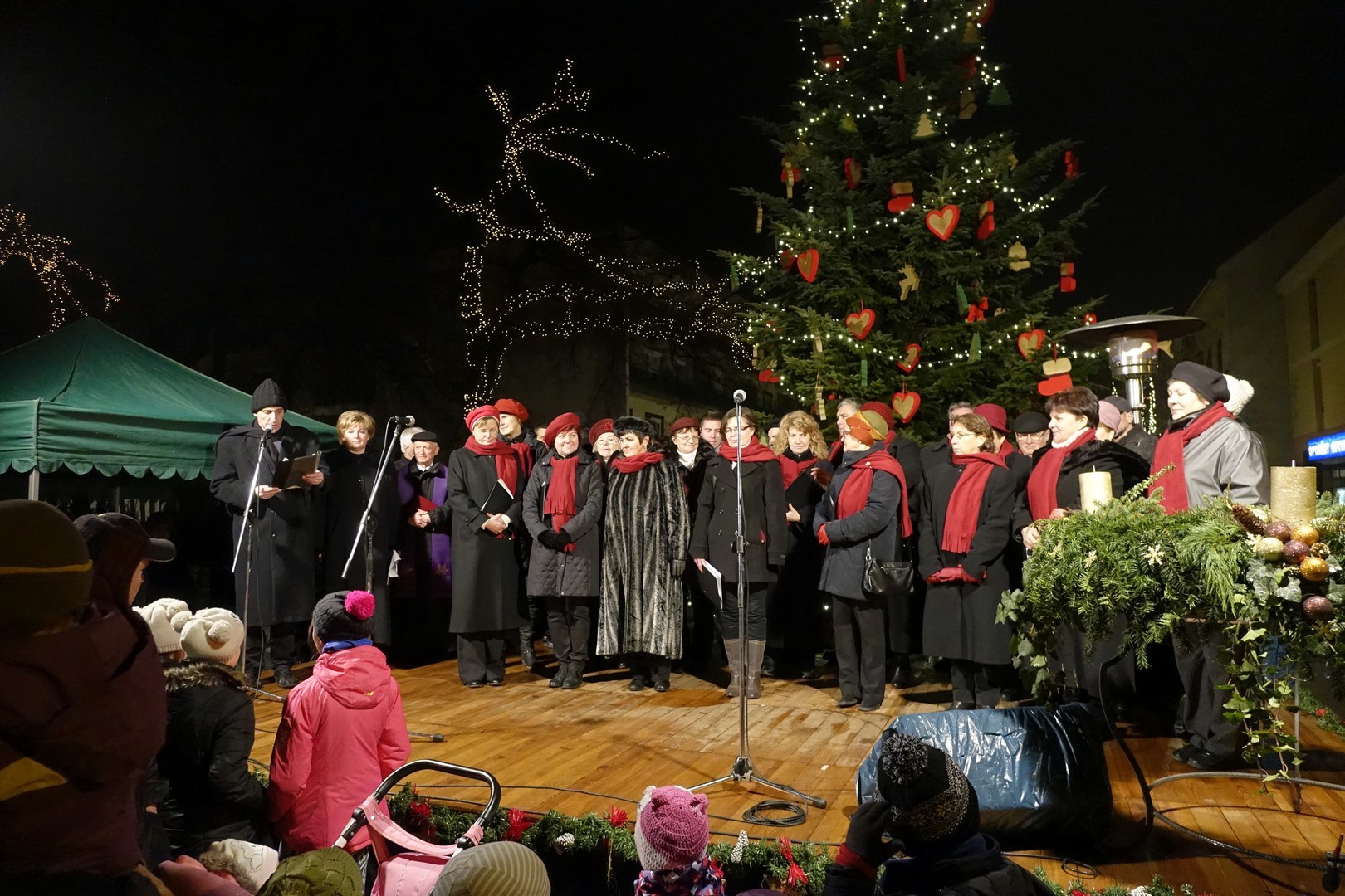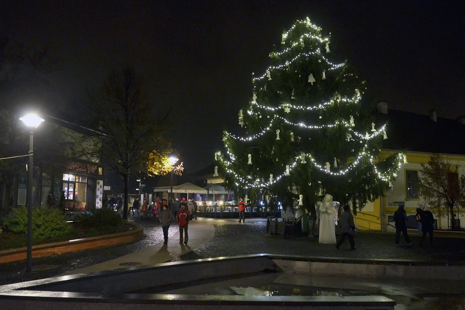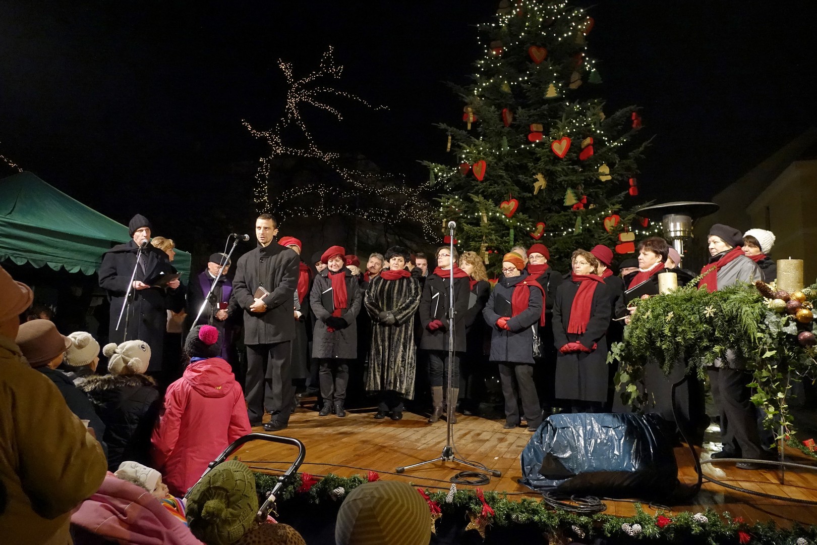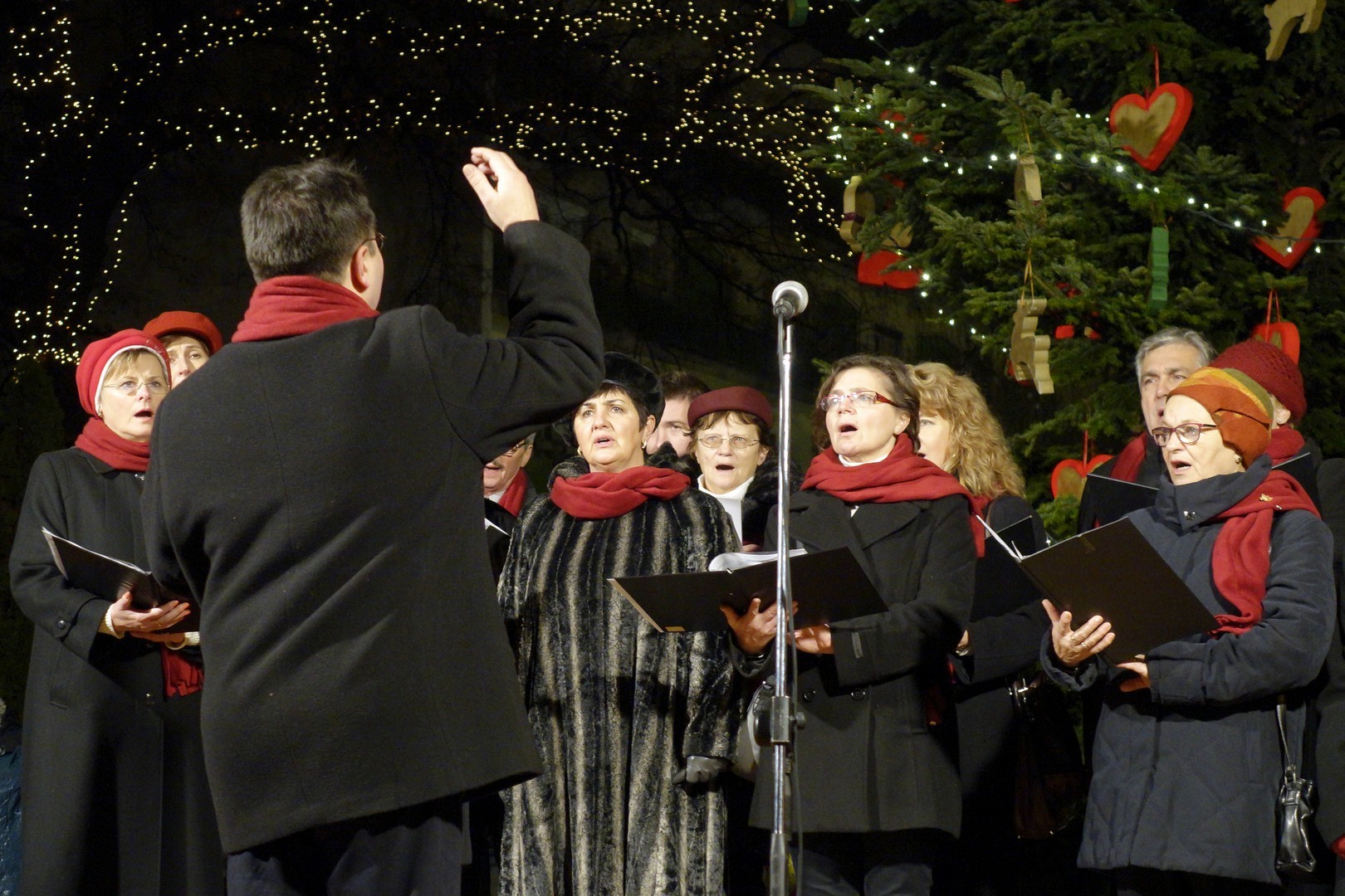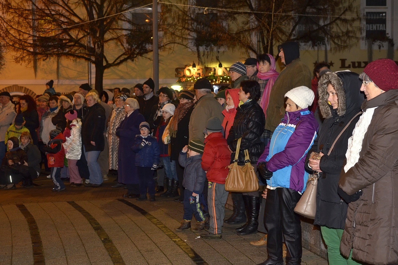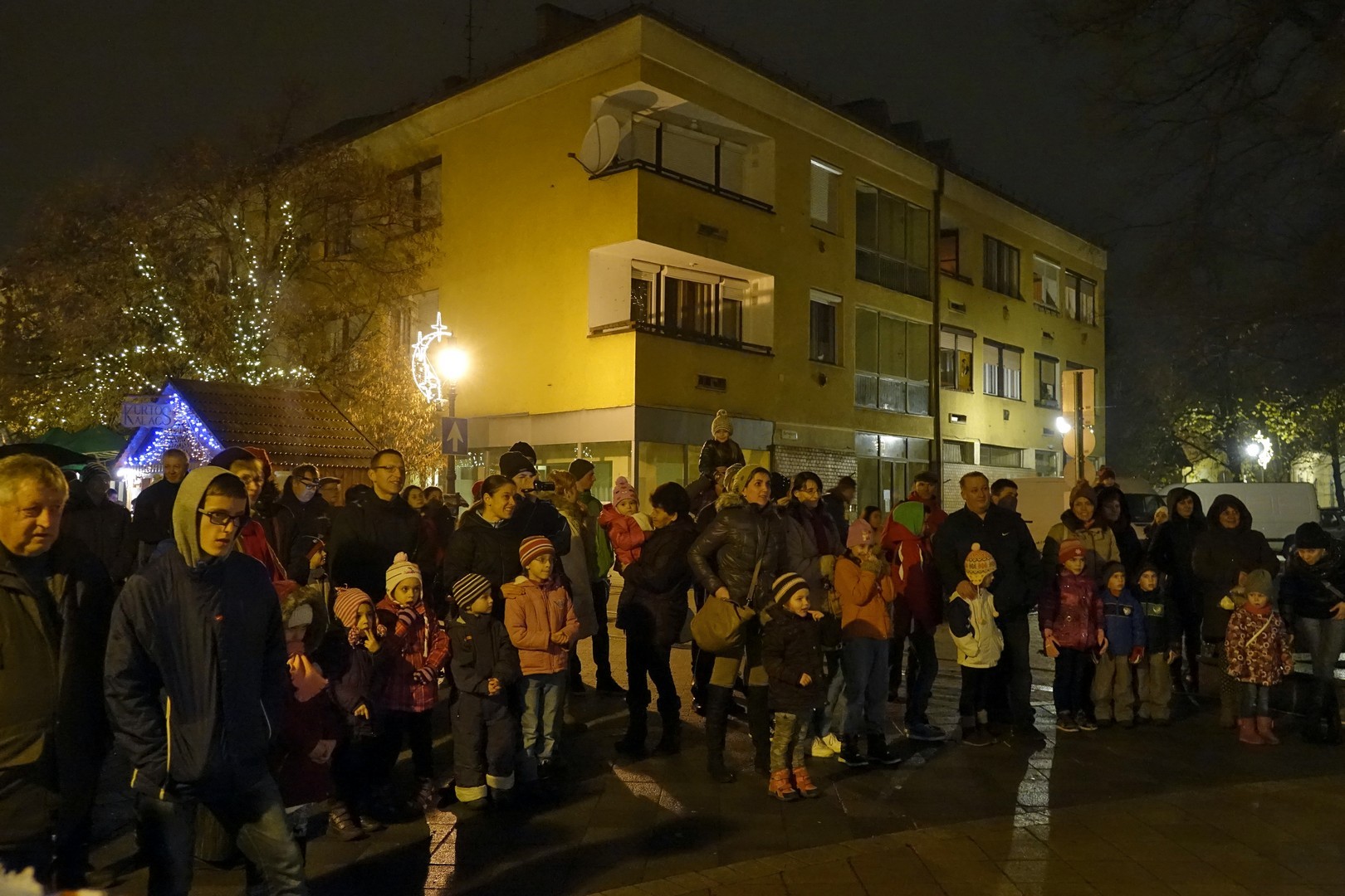 Az adventi ünnepség egy rövid műsor erejéig a Kossuth téri körforgalomnál folytatódott, ahol az Erkel Ferenc Vegyes Kar további dalokkal ajándékozta meg a közönséget, majd végül felvillant az első gyertyaláng a Japánkert Barátok Köre Egyesület által készített hatalmas koszorún is.