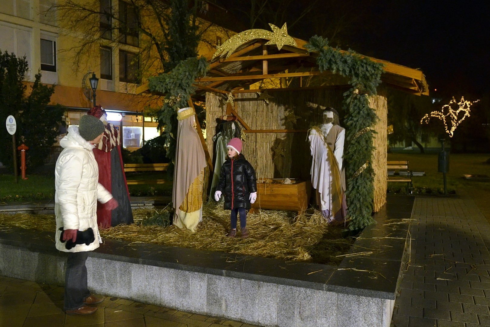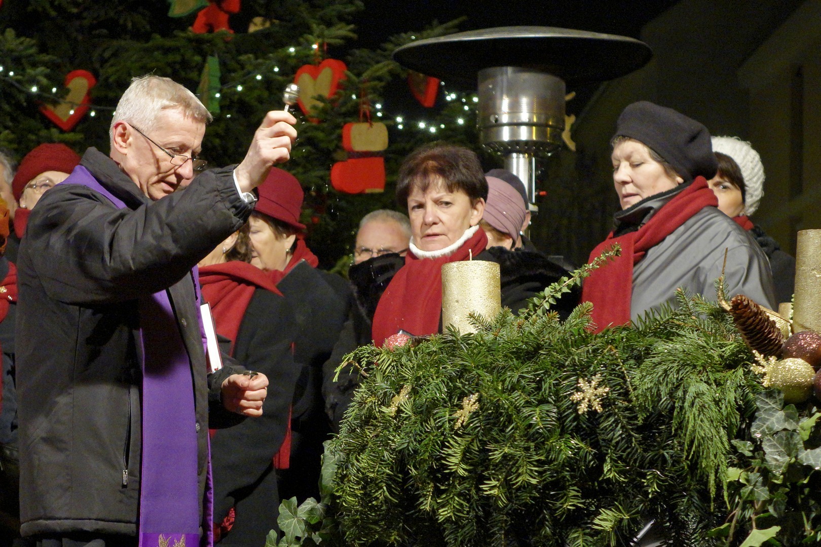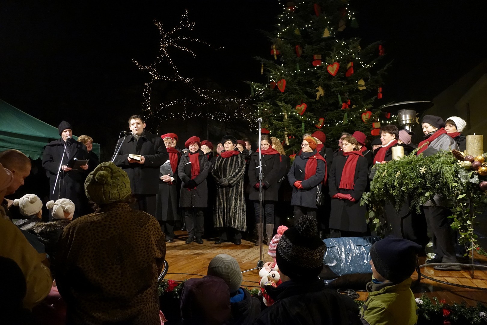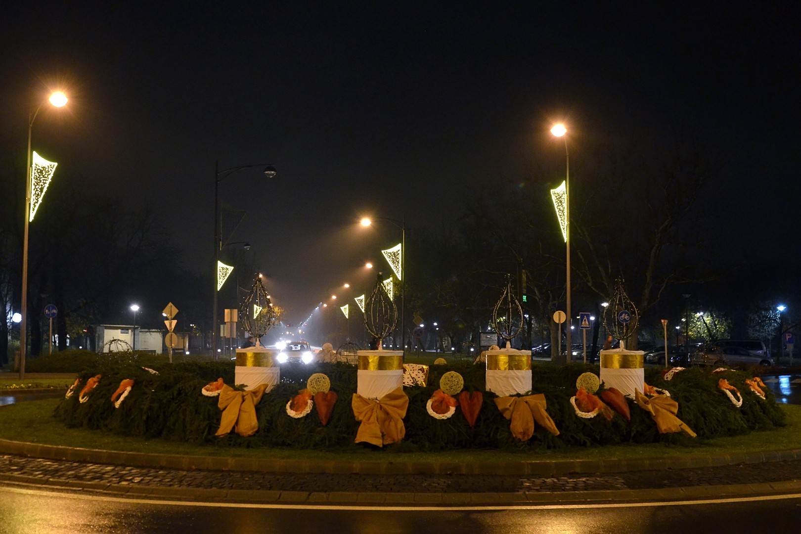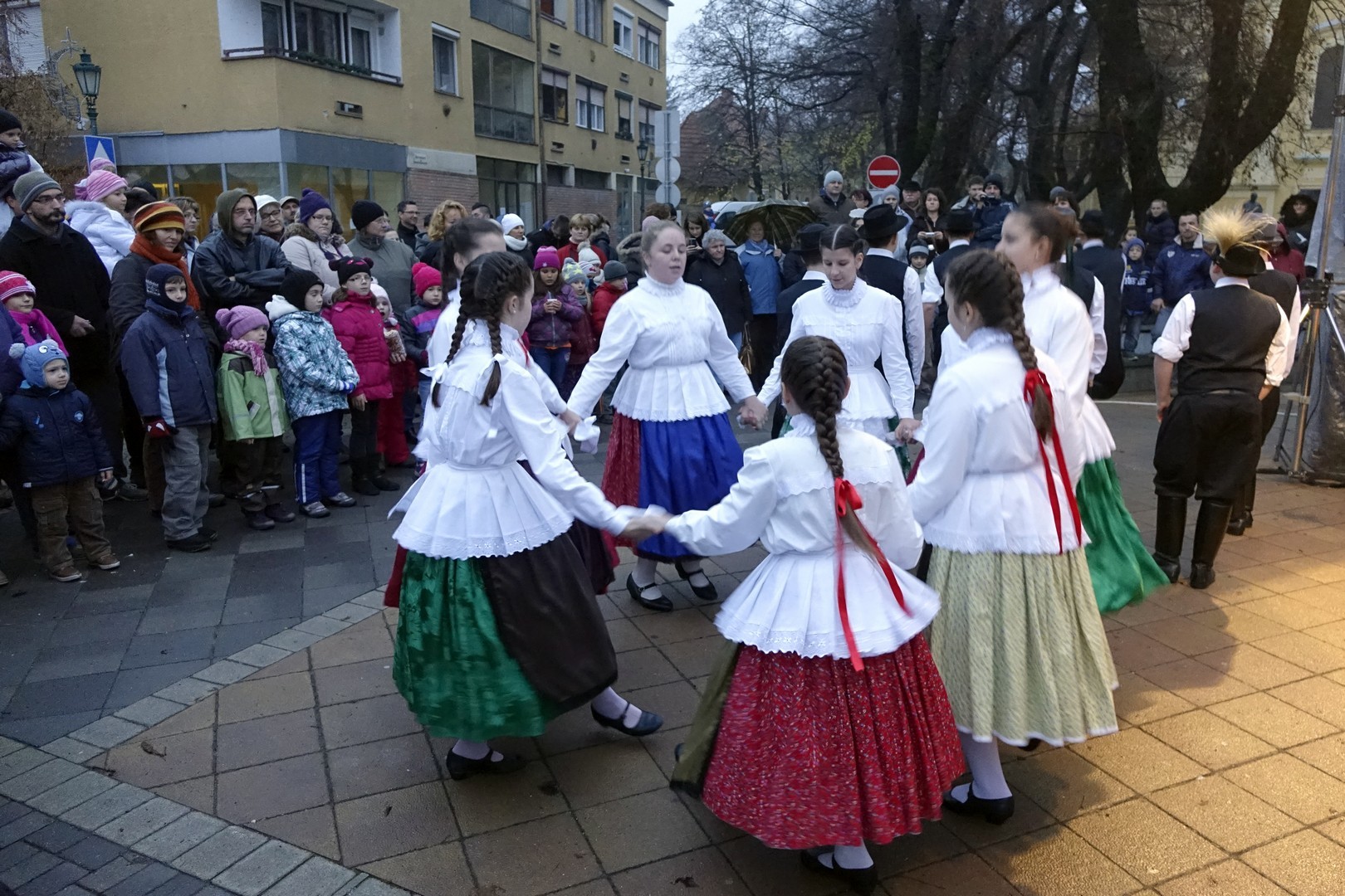 Az adventi ünnepség egy rövid műsor erejéig a Kossuth téri körforgalomnál folytatódott, ahol az Erkel Ferenc Vegyes Kar további dalokkal ajándékozta meg a közönséget, majd végül felvillant az első gyertyaláng a Japánkert Barátok Köre Egyesület által készített hatalmas koszorún is.