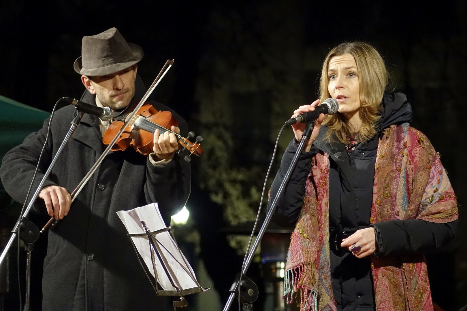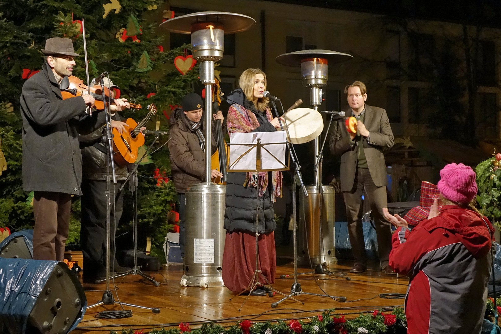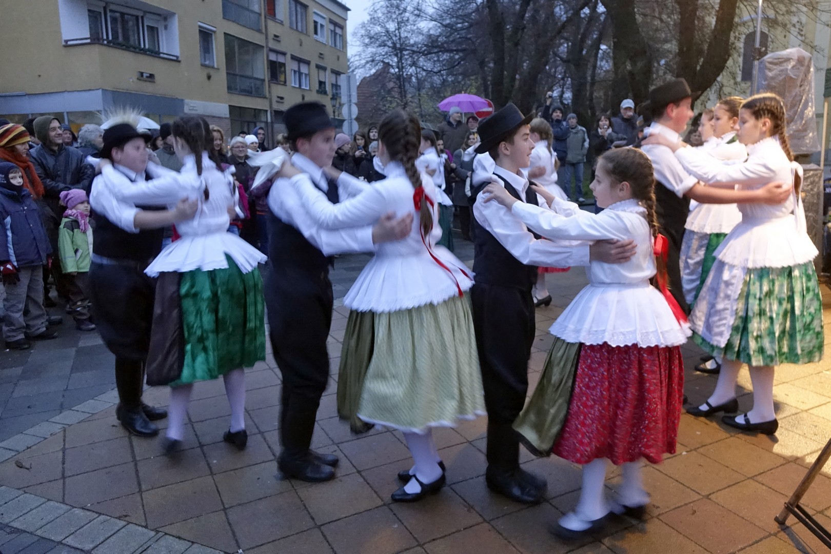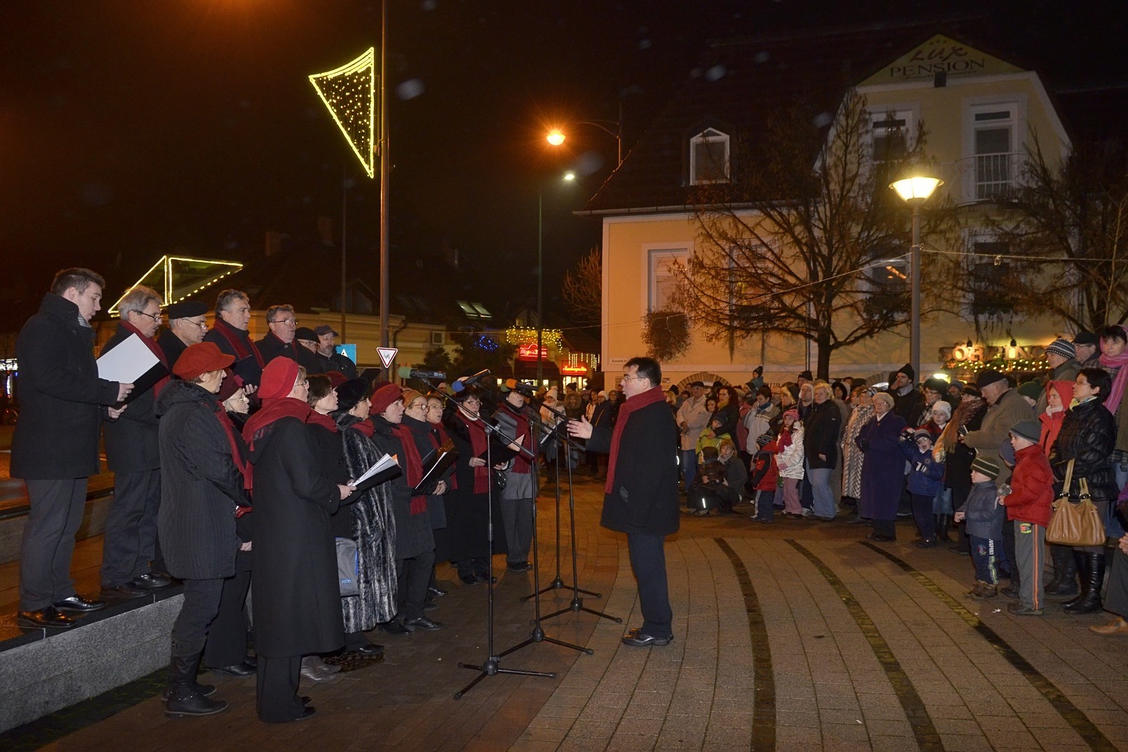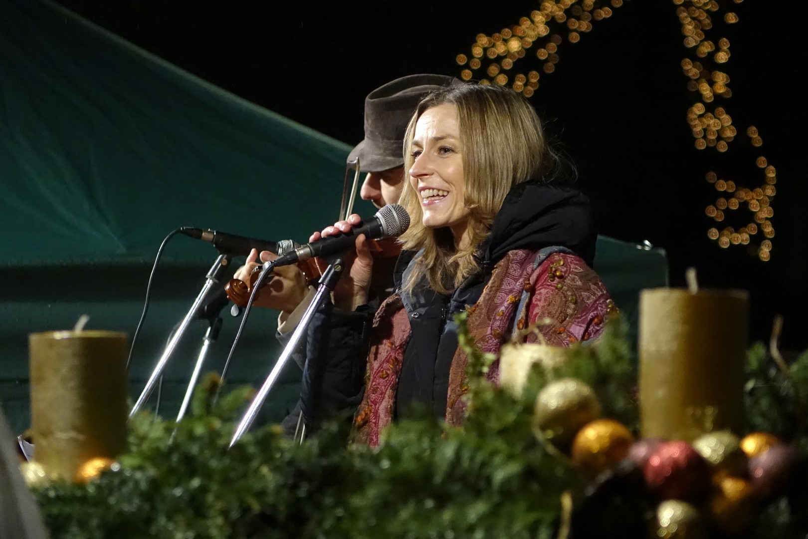 Az adventi ünnepség egy rövid műsor erejéig a Kossuth téri körforgalomnál folytatódott, ahol az Erkel Ferenc Vegyes Kar további dalokkal ajándékozta meg a közönséget, majd végül felvillant az első gyertyaláng a Japánkert Barátok Köre Egyesület által készített hatalmas koszorún is.