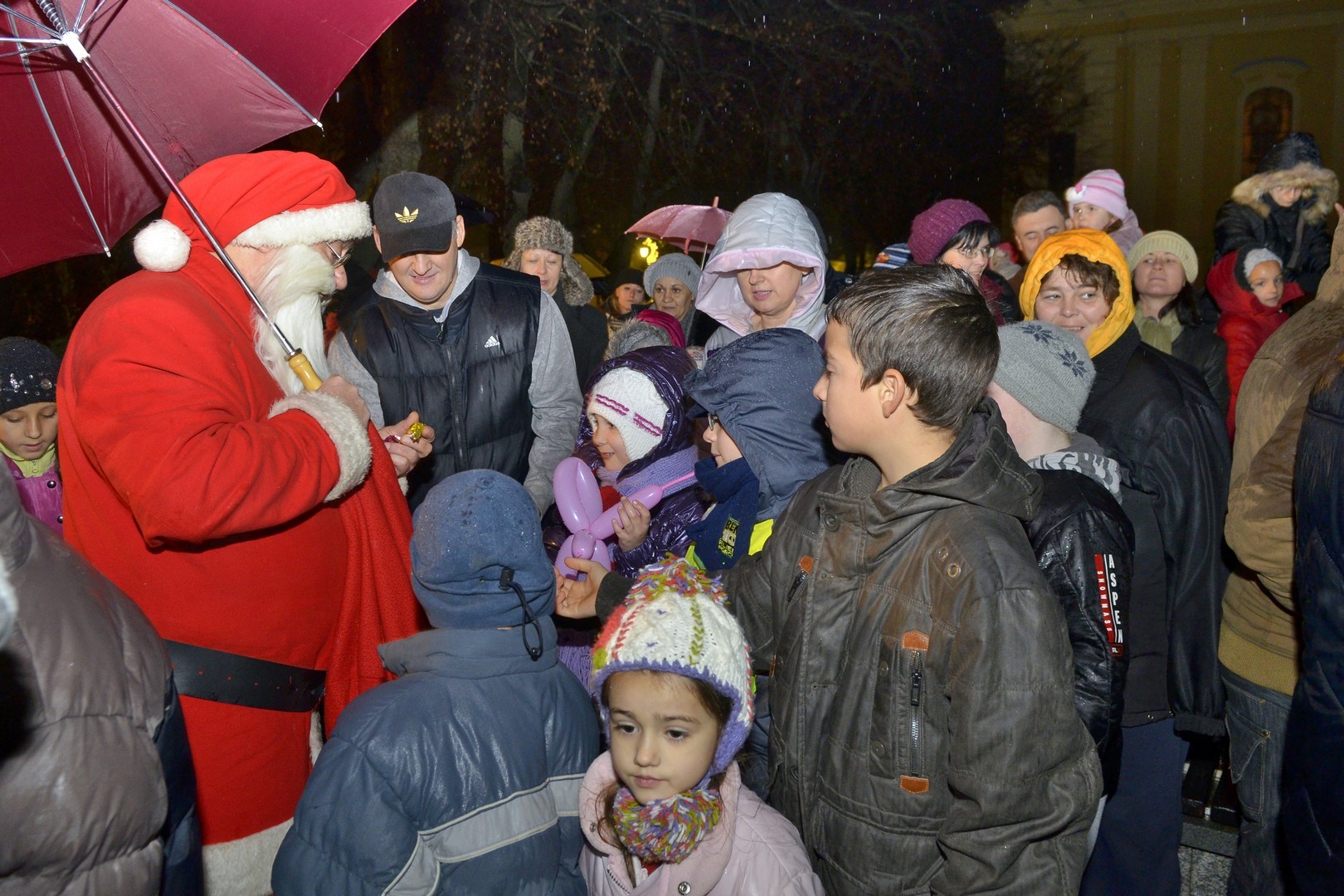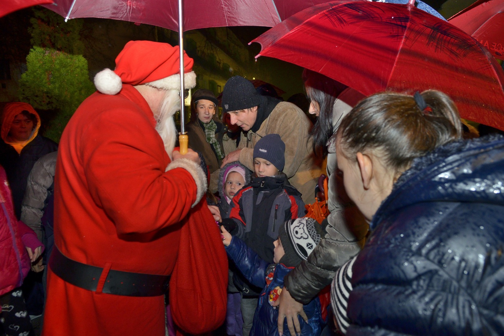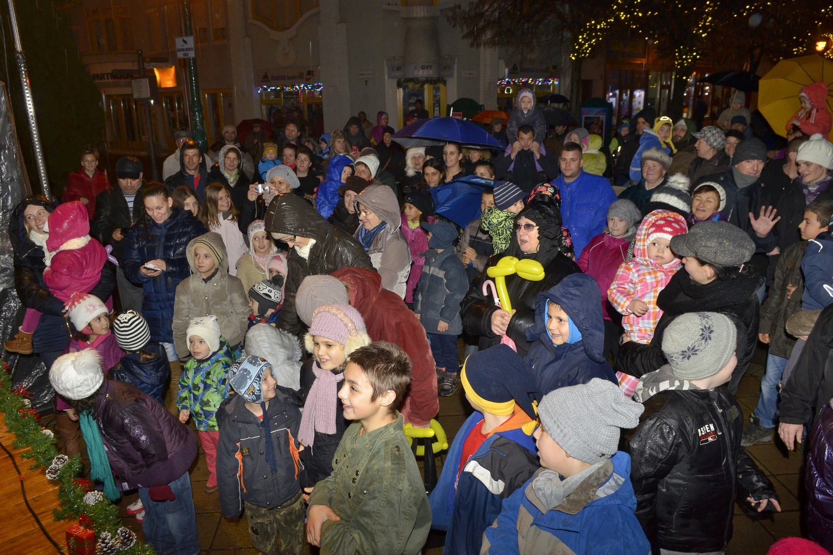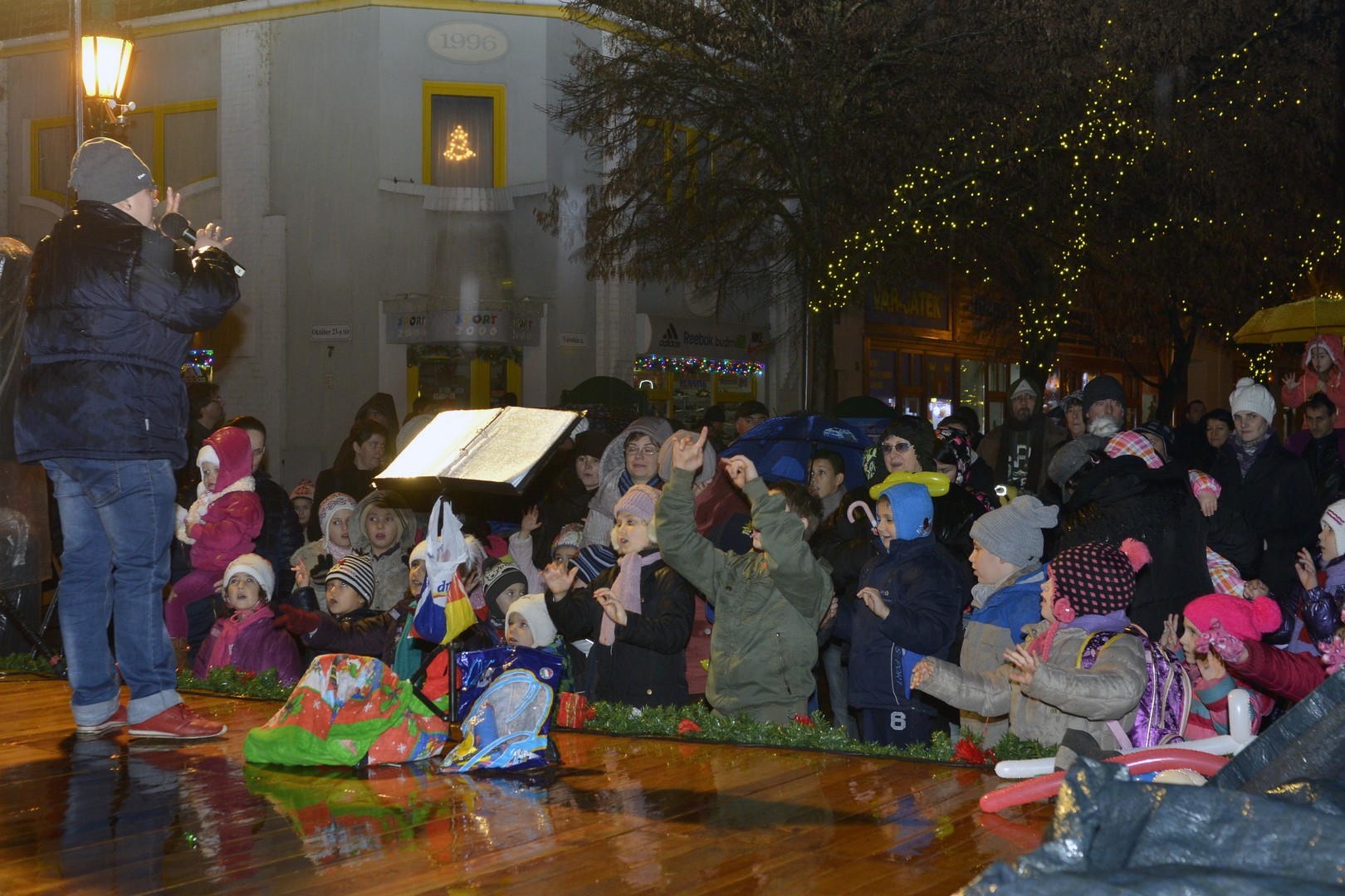 Bodrogközi Rita nógatására a gyermekek egyszerre olyan hangosan kezdtek el énekelni, hogy azt még Lappföldön is meghallották az emberek, köztük a Télapó is, aki – mivel maga is szereti a muzsikát – rögvest városunkba sietett. Hintójáról leszállva a nagyszakállú a színpadra igyekezett, és a kicsikkel közösen el is dalolt néhány ünnepi nótát. Ezután a gyermekek is felmehettek a Mikuláshoz, hogy megmutassák neki, milyen szép énekeket és verseket ismernek. Cserébe a pirosruhás puttonyából megannyi finomság, cukros csemege került elő. Az ajándékosztás minden picúr arcára széles vigyorokat csalt, a teret gyermeki kacajok töltötték meg.