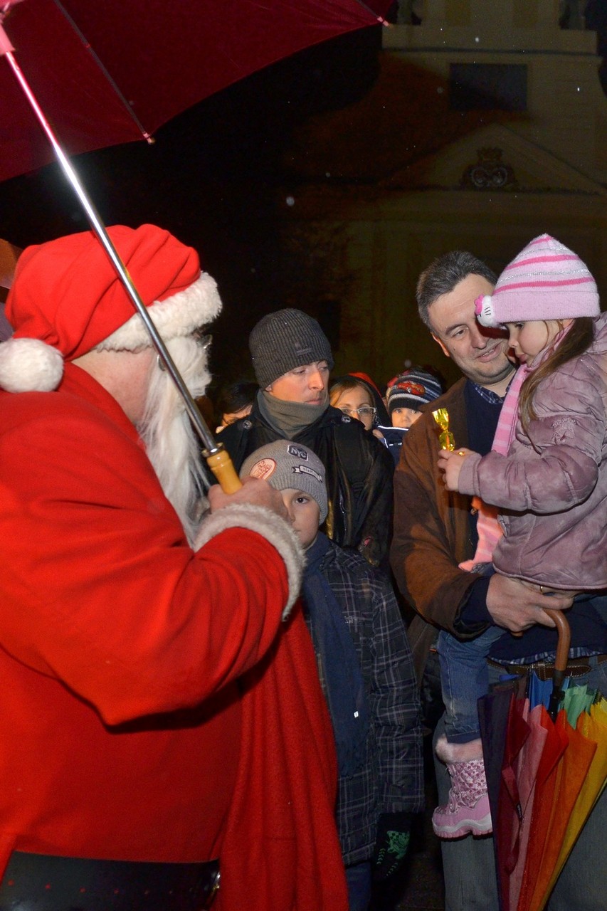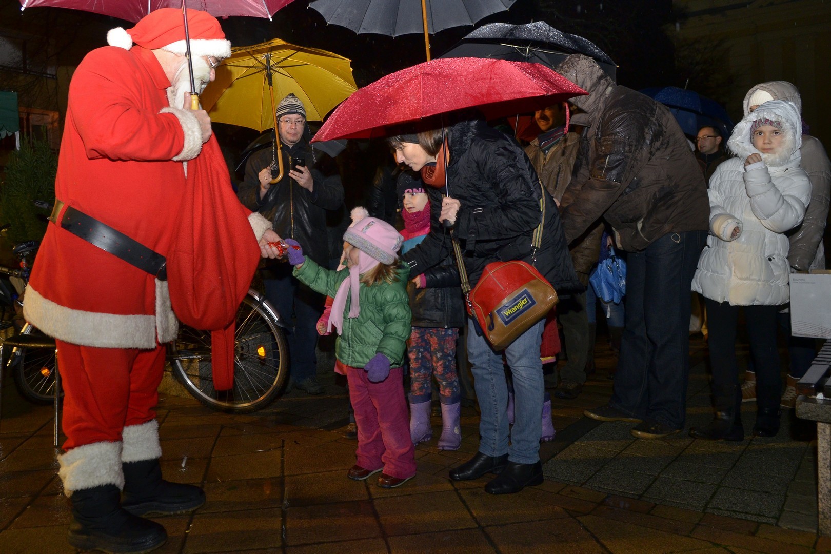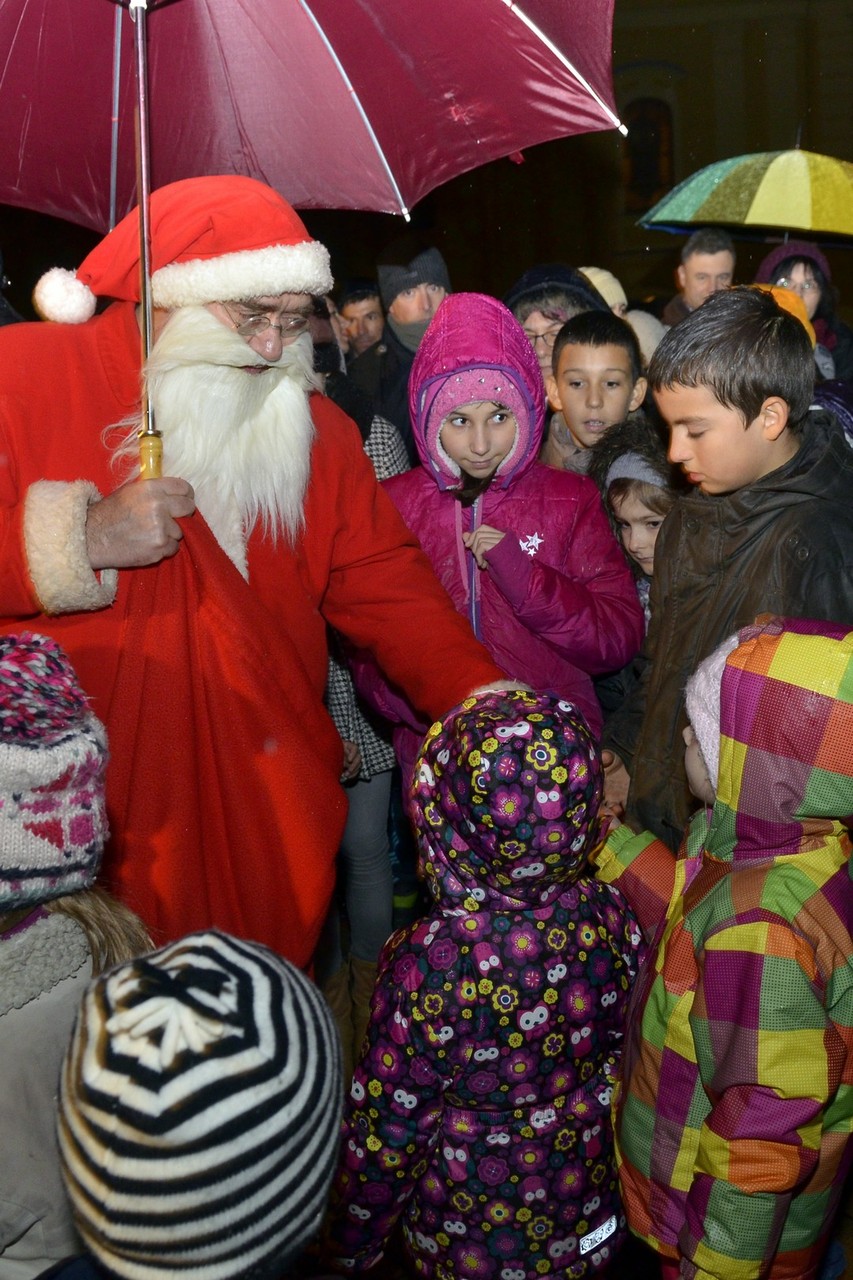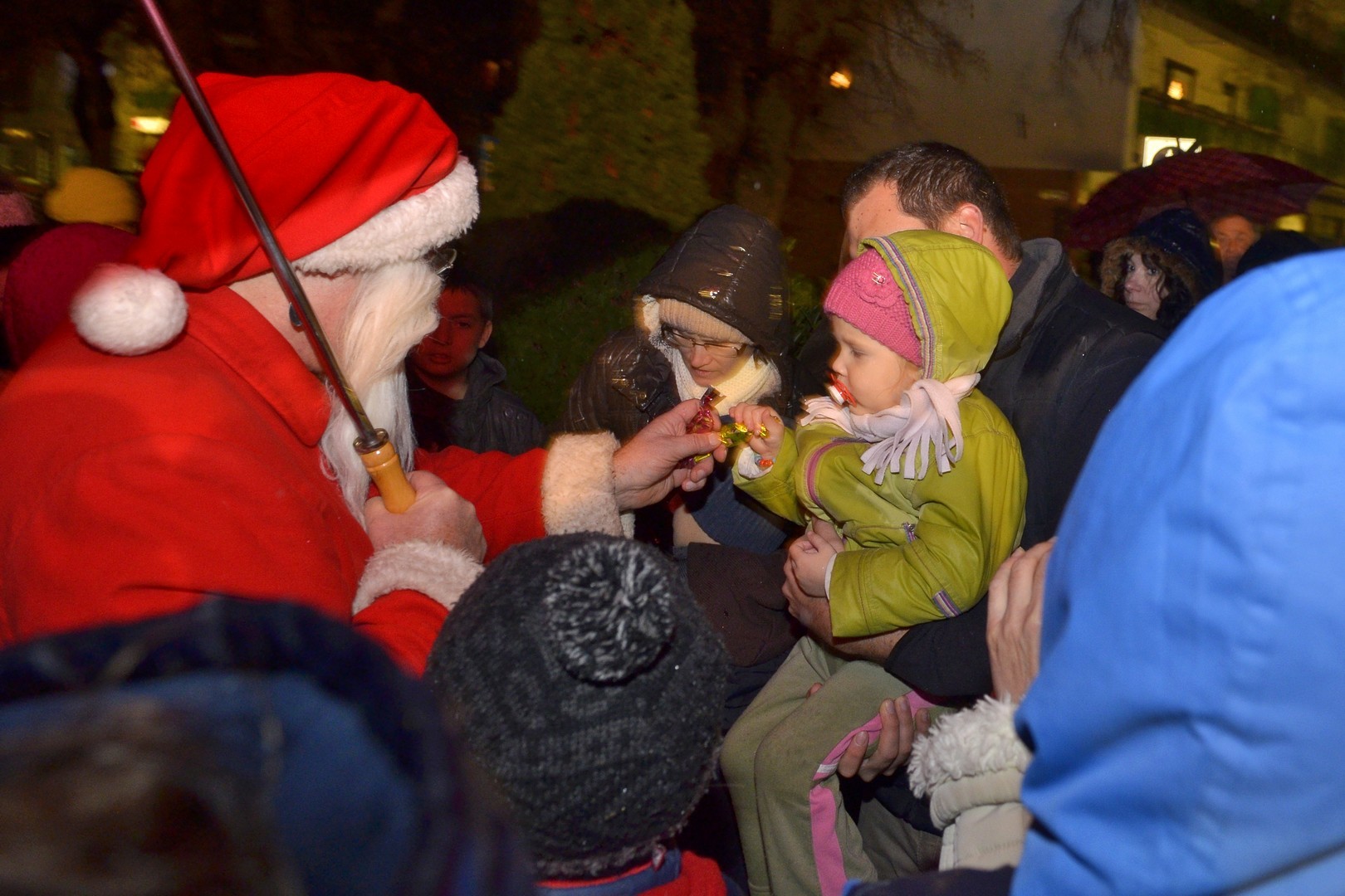 Bodrogközi Rita nógatására a gyermekek egyszerre olyan hangosan kezdtek el énekelni, hogy azt még Lappföldön is meghallották az emberek, köztük a Télapó is, aki – mivel maga is szereti a muzsikát – rögvest városunkba sietett. Hintójáról leszállva a nagyszakállú a színpadra igyekezett, és a kicsikkel közösen el is dalolt néhány ünnepi nótát. Ezután a gyermekek is felmehettek a Mikuláshoz, hogy megmutassák neki, milyen szép énekeket és verseket ismernek. Cserébe a pirosruhás puttonyából megannyi finomság, cukros csemege került elő. Az ajándékosztás minden picúr arcára széles vigyorokat csalt, a teret gyermeki kacajok töltötték meg.