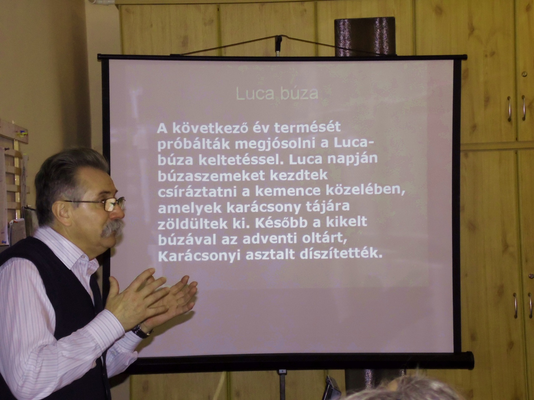 A december 9-i előadás egyik népszerű része a Luca-búza volt, amit Széll János minden évben fakanál nyelével megrajzolt spirális alakban vet, gyorsan kicsírázó, majd karácsonyra kizöldülő búzaszemekből a jövő évi termés eredményességéről von le következtetéseket. Elmesélte, hogy a jövő évi időjárásról a székelyek ezen a napon vöröshagymából jósoltak, némi só hintésével, ebből következtetve a csapadékos hónapok számára.